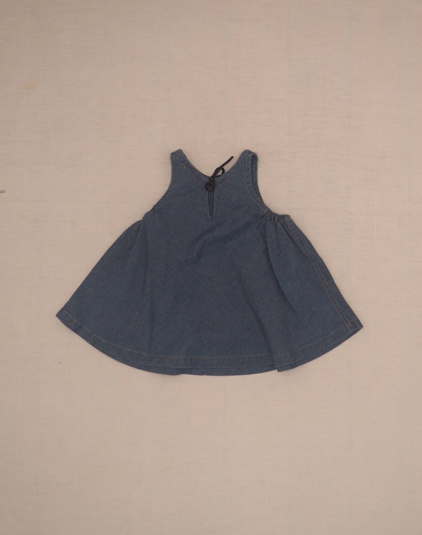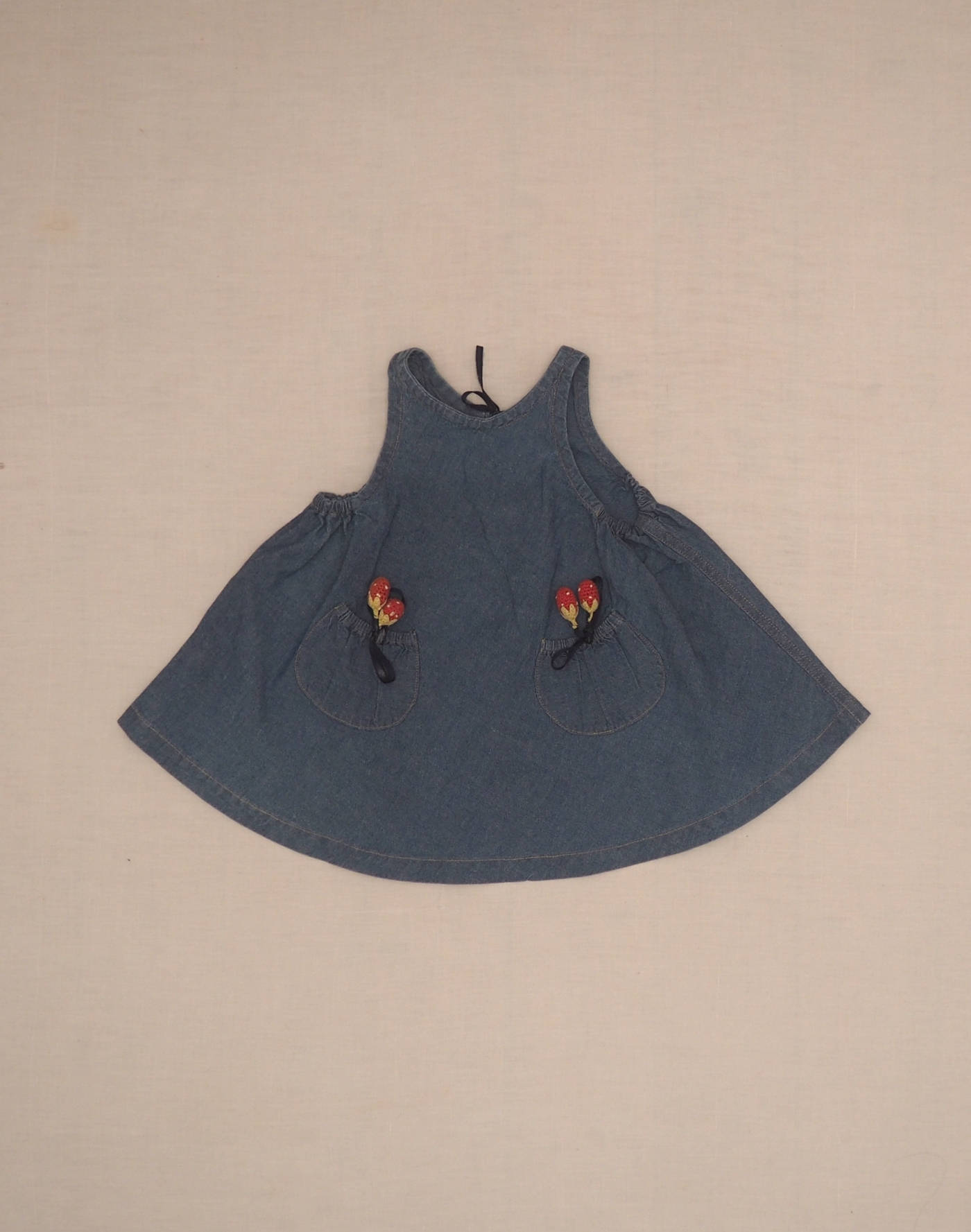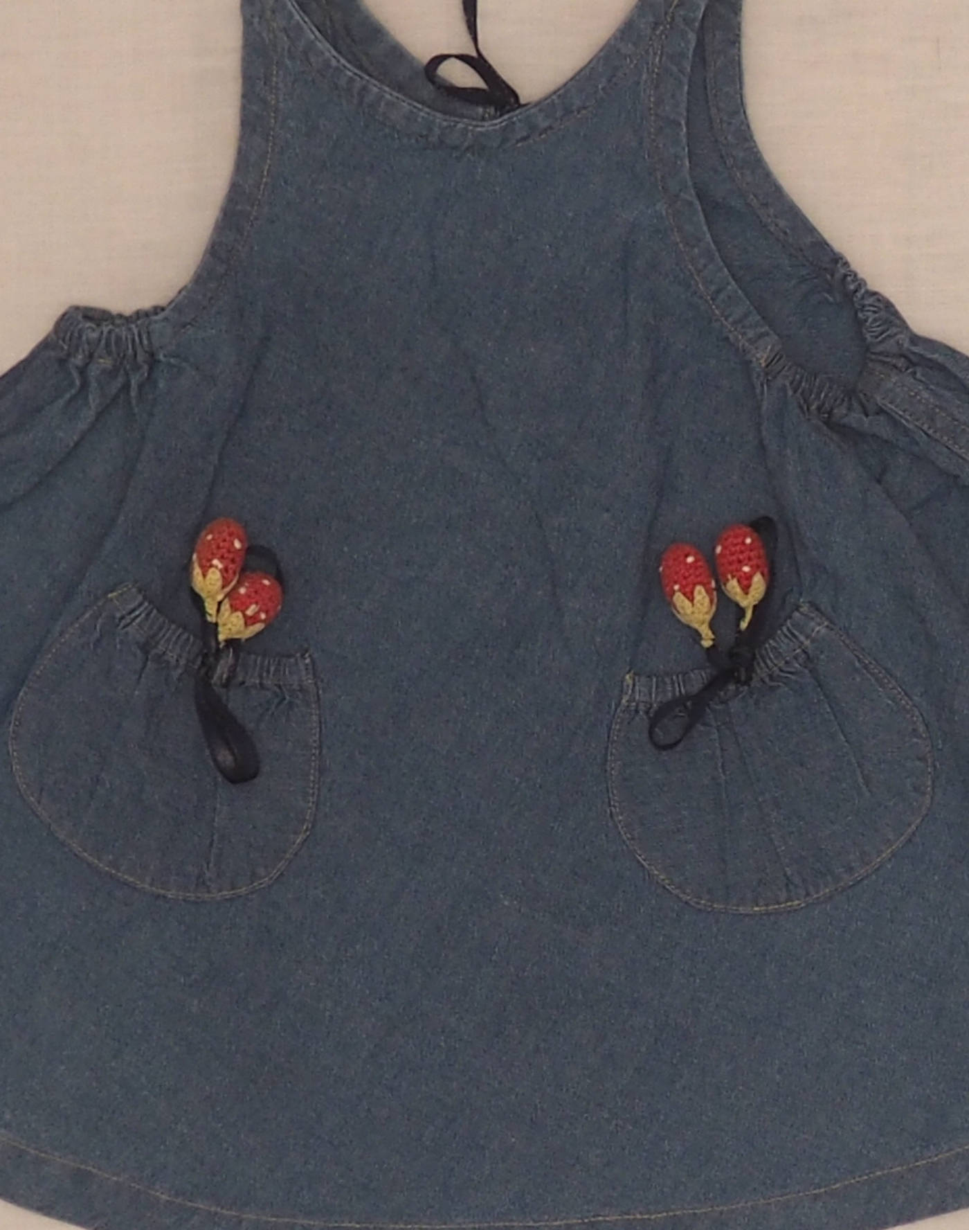 Trop mignonne robe en jean sans manches avec deux poches plaquées devant décorées de petits noeuds avec fraises en crochet. Elastiques sous les bras. Fermée par un petit lien dans le dos. Très bon état, 100% coton.
