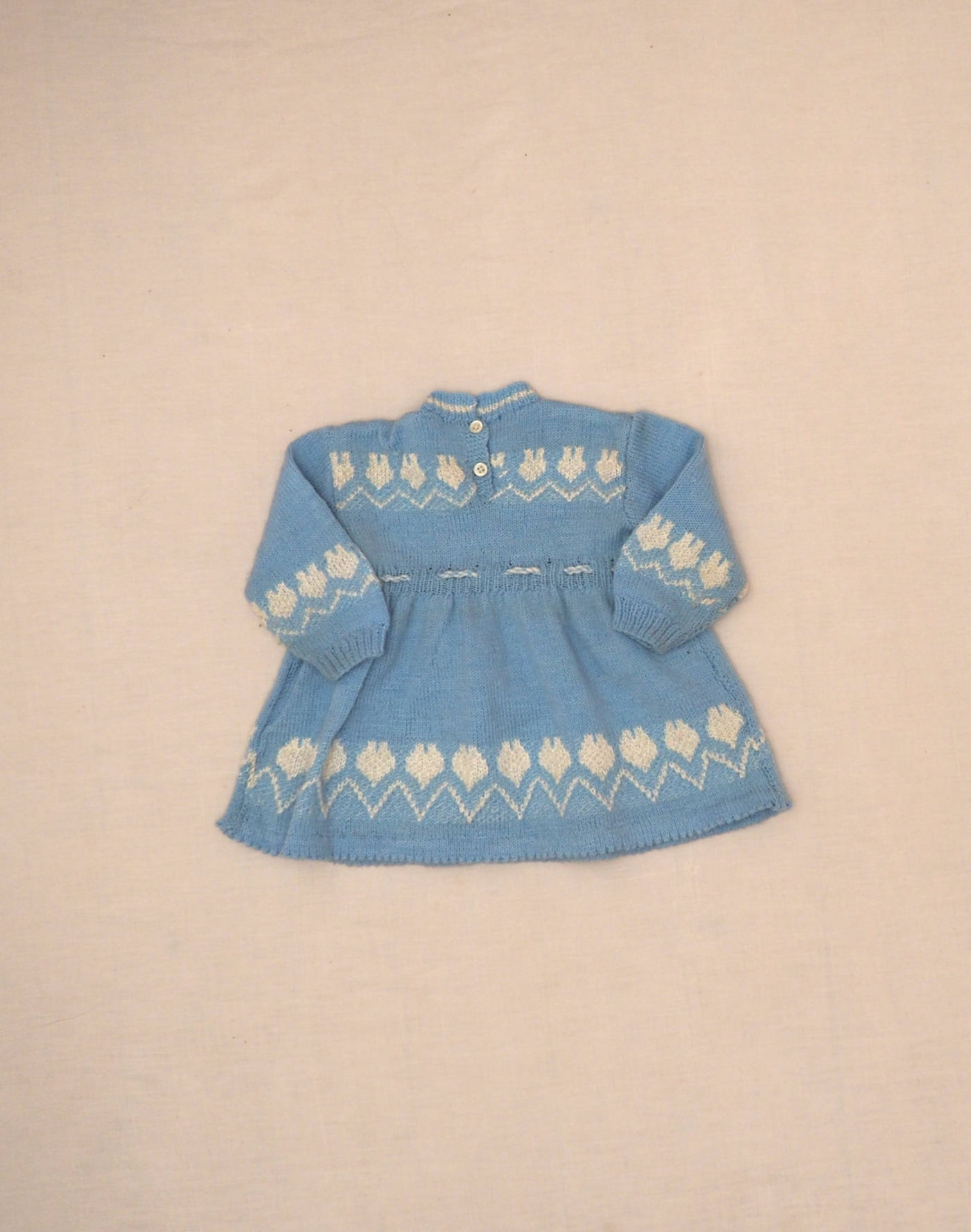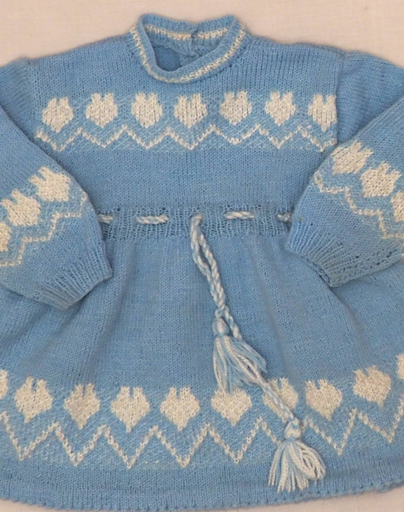 Pièce tricotée à la main. Ravissante robe en maille bleu clair avec frise de coeurs sur le buste, les manches et le jupon. Cordon à nouer à la taille, fermée dans le dos par deux boutons nacrés. Très bon état, toucher laine douce.