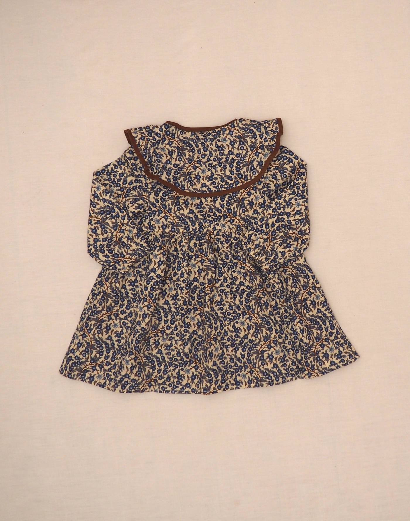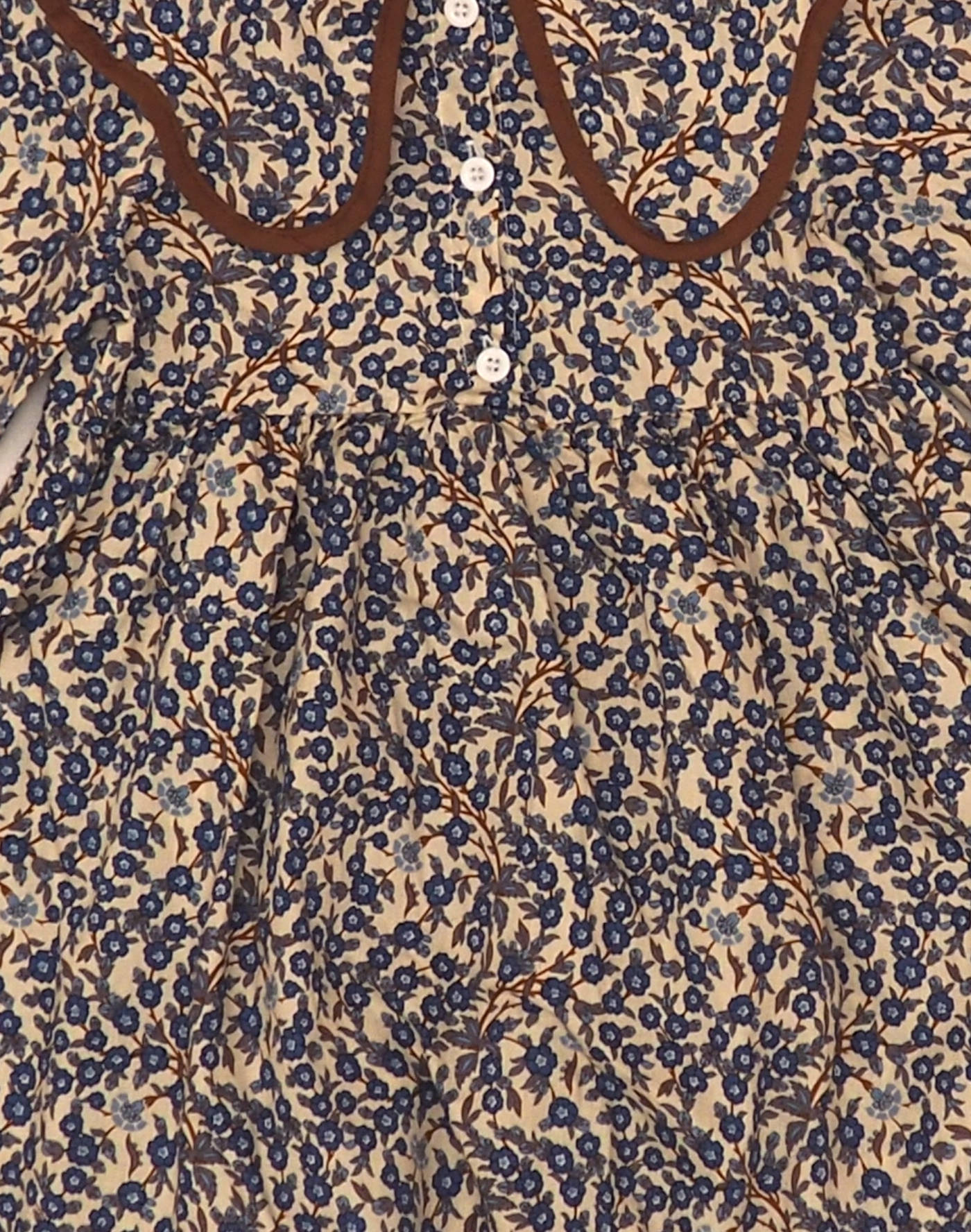 Pièce artisanale faite par une couturière. Ravissante robe en coton léger à petites fleurs bleues, grand col avec un volant bordé de biais marron, fermée devant par trois boutons, plissé à la taille. Très bon état, toucher coton.