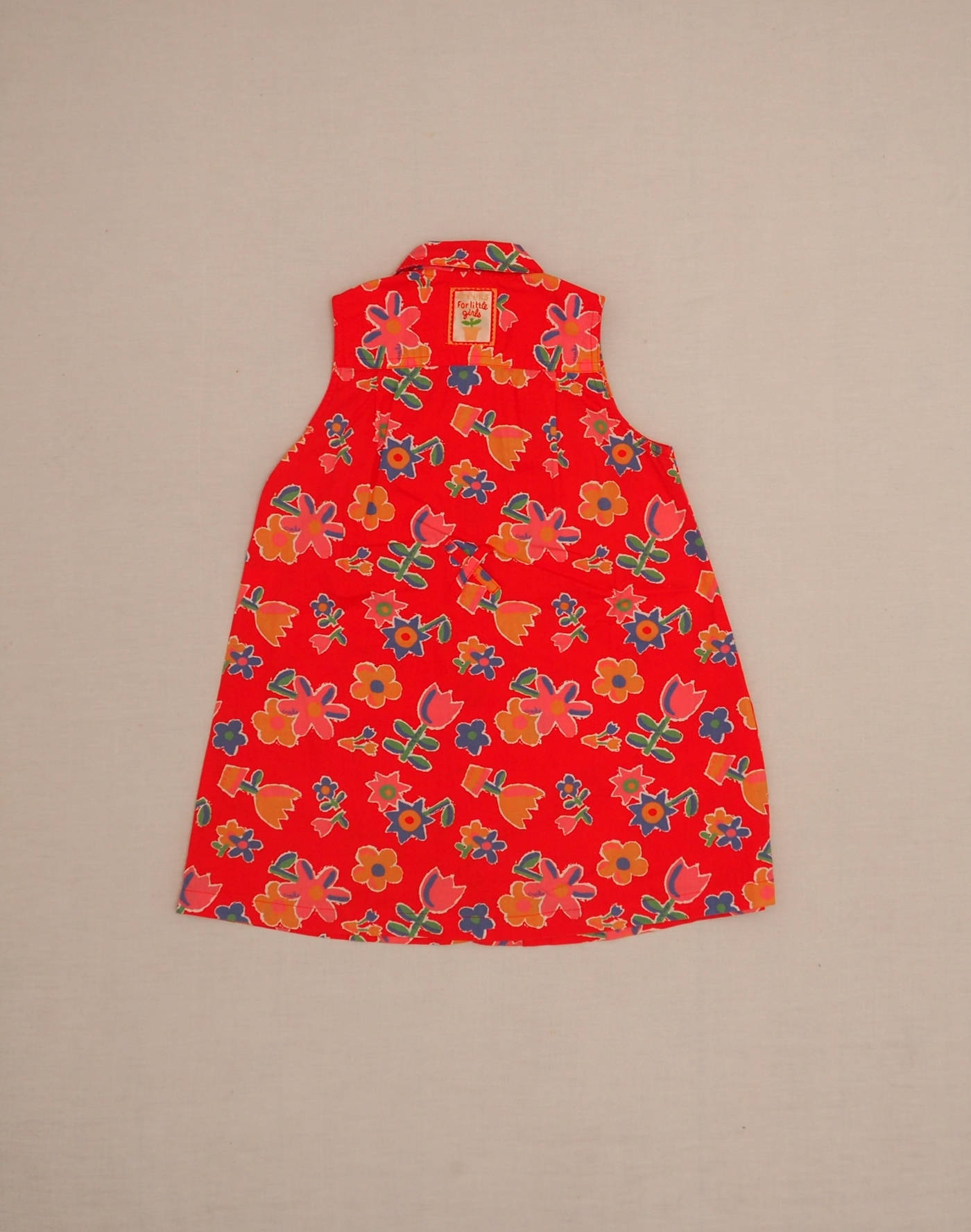 Belle robe d’été en coton rouge fleuri coupe chemise sans manches, deux fausses poches boutonnées sur le buste, col brodé « Creeks », fermée par six boutons. Passants pour une ceinture. Très bon état, 100% coton.