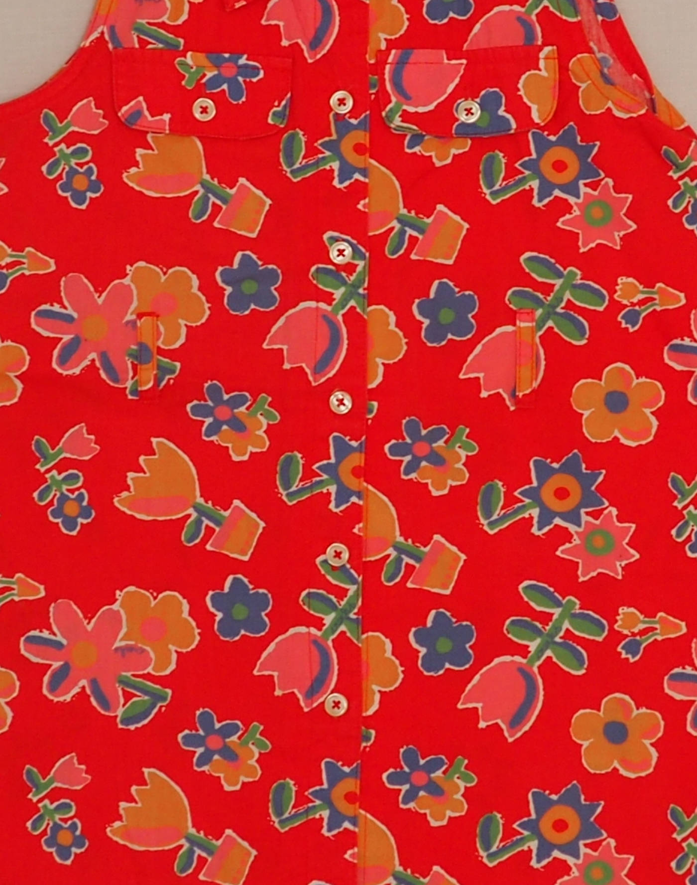 Belle robe d’été en coton rouge fleuri coupe chemise sans manches, deux fausses poches boutonnées sur le buste, col brodé « Creeks », fermée par six boutons. Passants pour une ceinture. Très bon état, 100% coton.