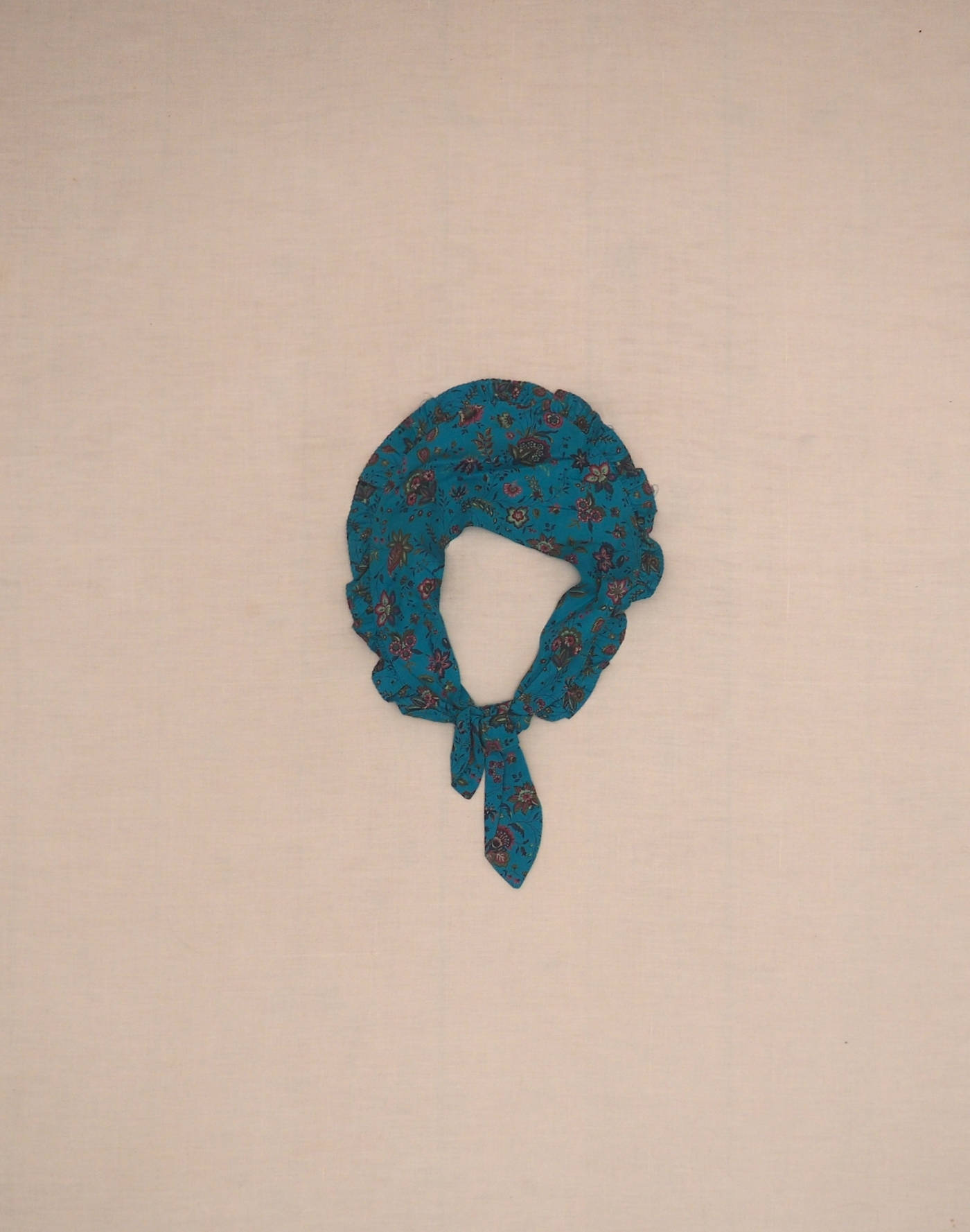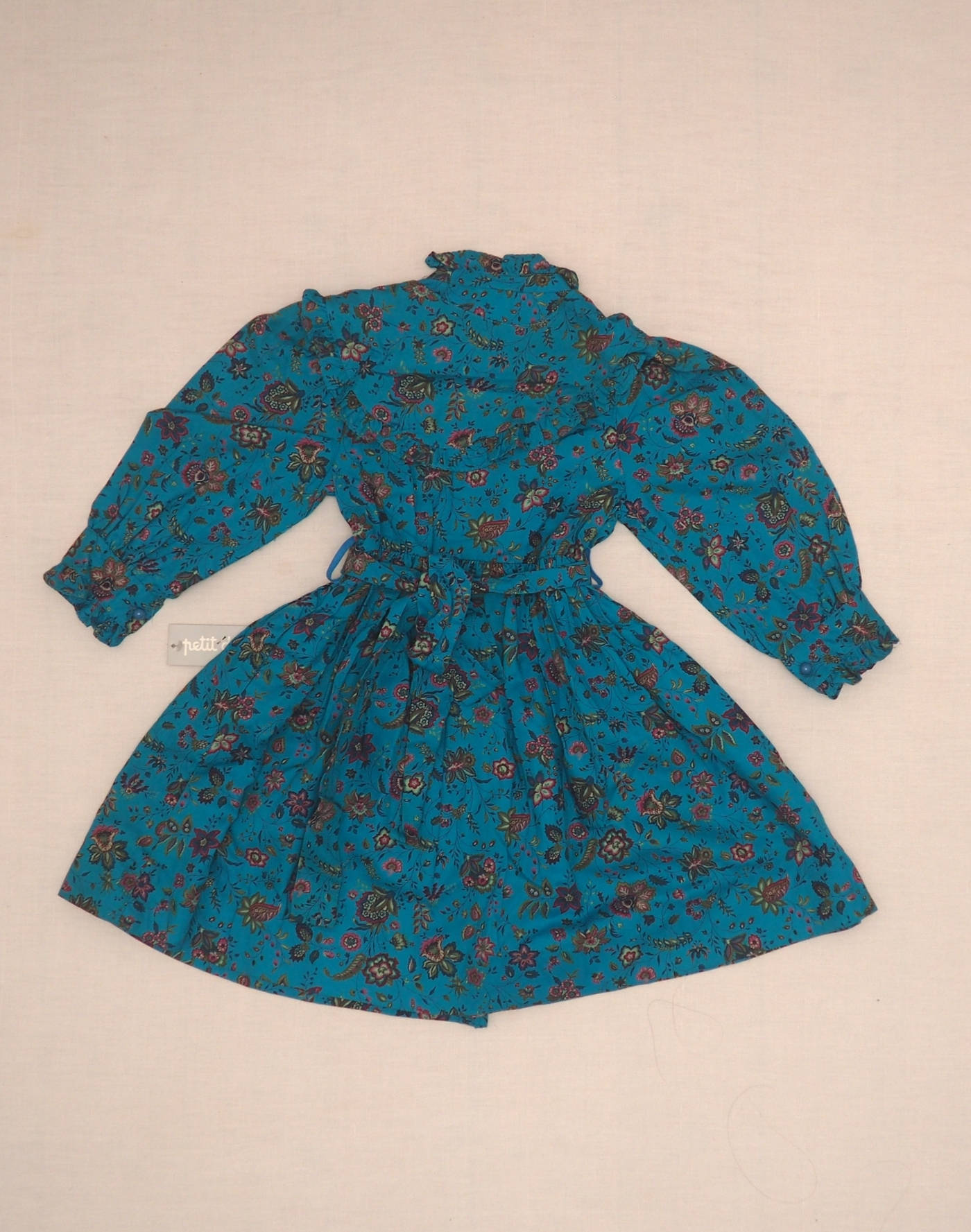 Très belle robe bleu turquoise avec un motif fleuri, manches longues boutonnées, élastique à la taille avec ceinture à nouer, fermée par quatre boutons devant, et foulard amovible assorti à nouer sur les épaules. Fabriquée en France, tissu 50% coton, 50% modal, état neuf avec étiquette.