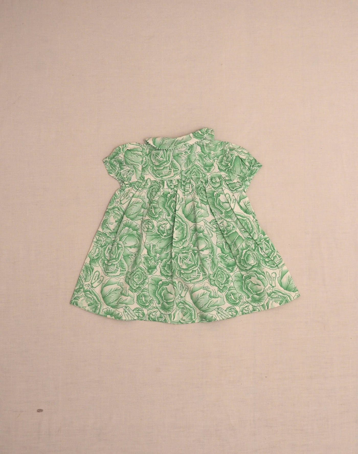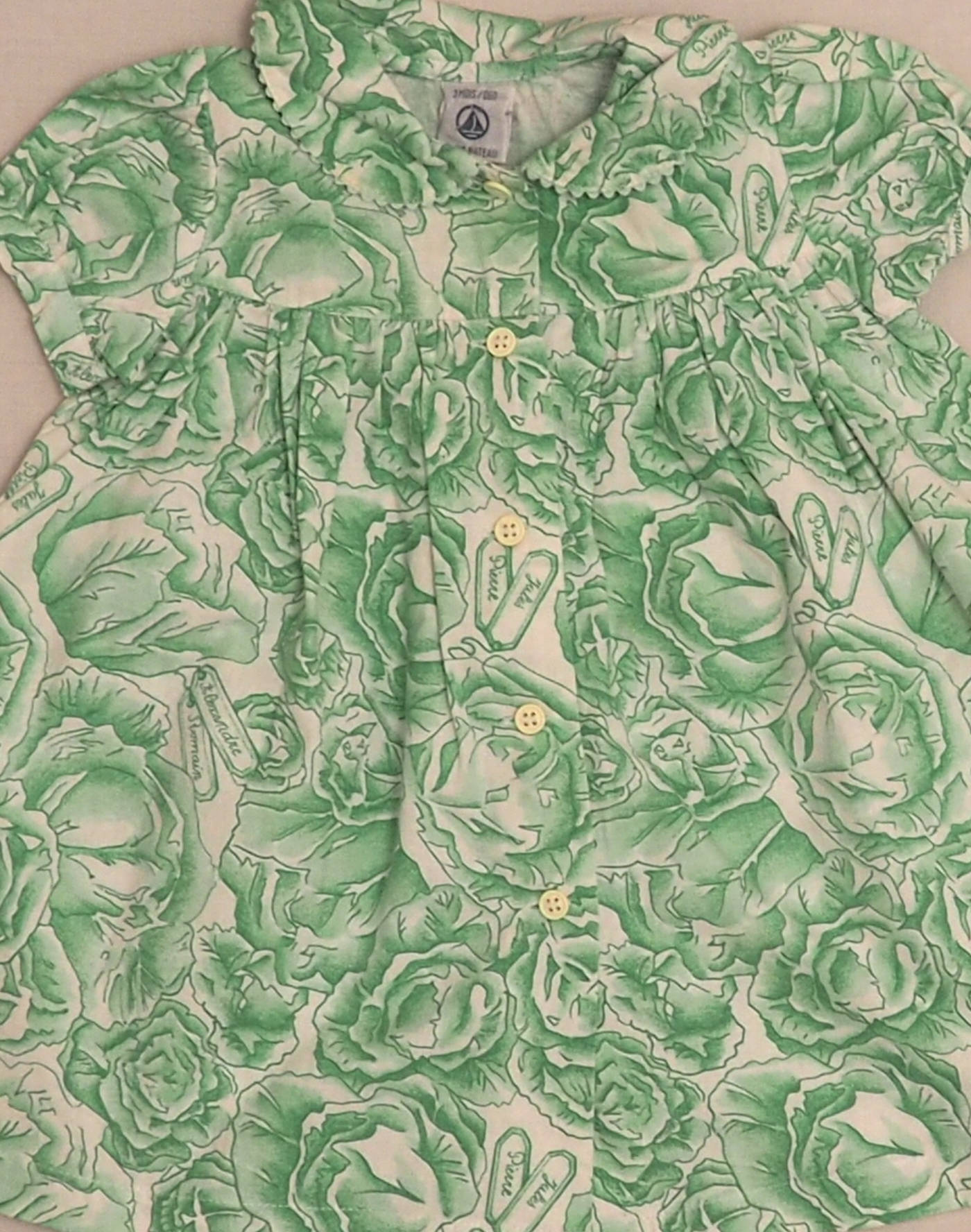 Petit Bateau vintage. Adorable robe à manches courtes ballon imprimé salades, col bordé de croquet, fermée par cinq boutons. Très bon état, 100% coton.
