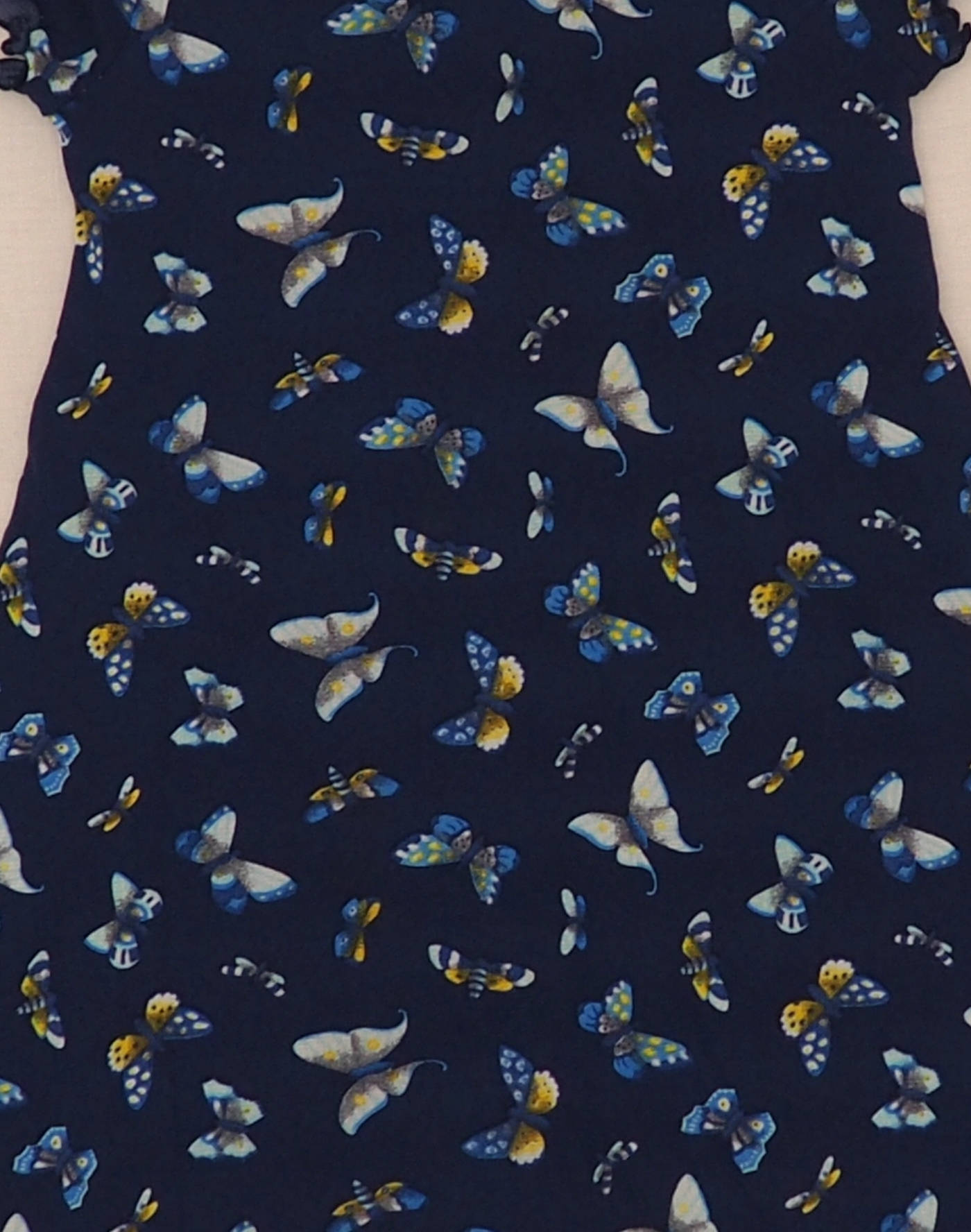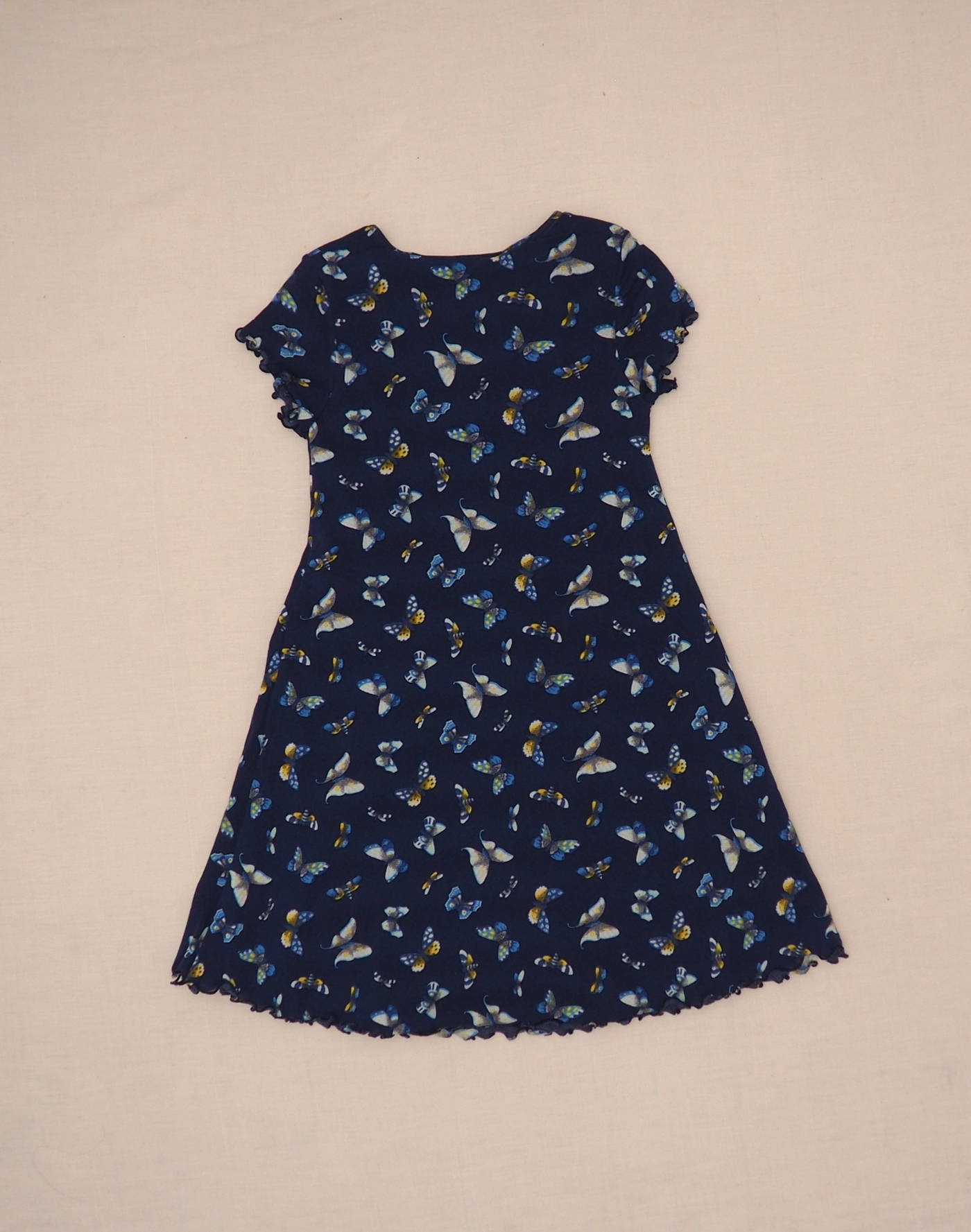 Belle robe en mesh doublé (sous-robe intégrée) bleu marine à motif papillon, manches courtes et bas de robe en bords laitue. Très bon état, mesh 100% polyamide.