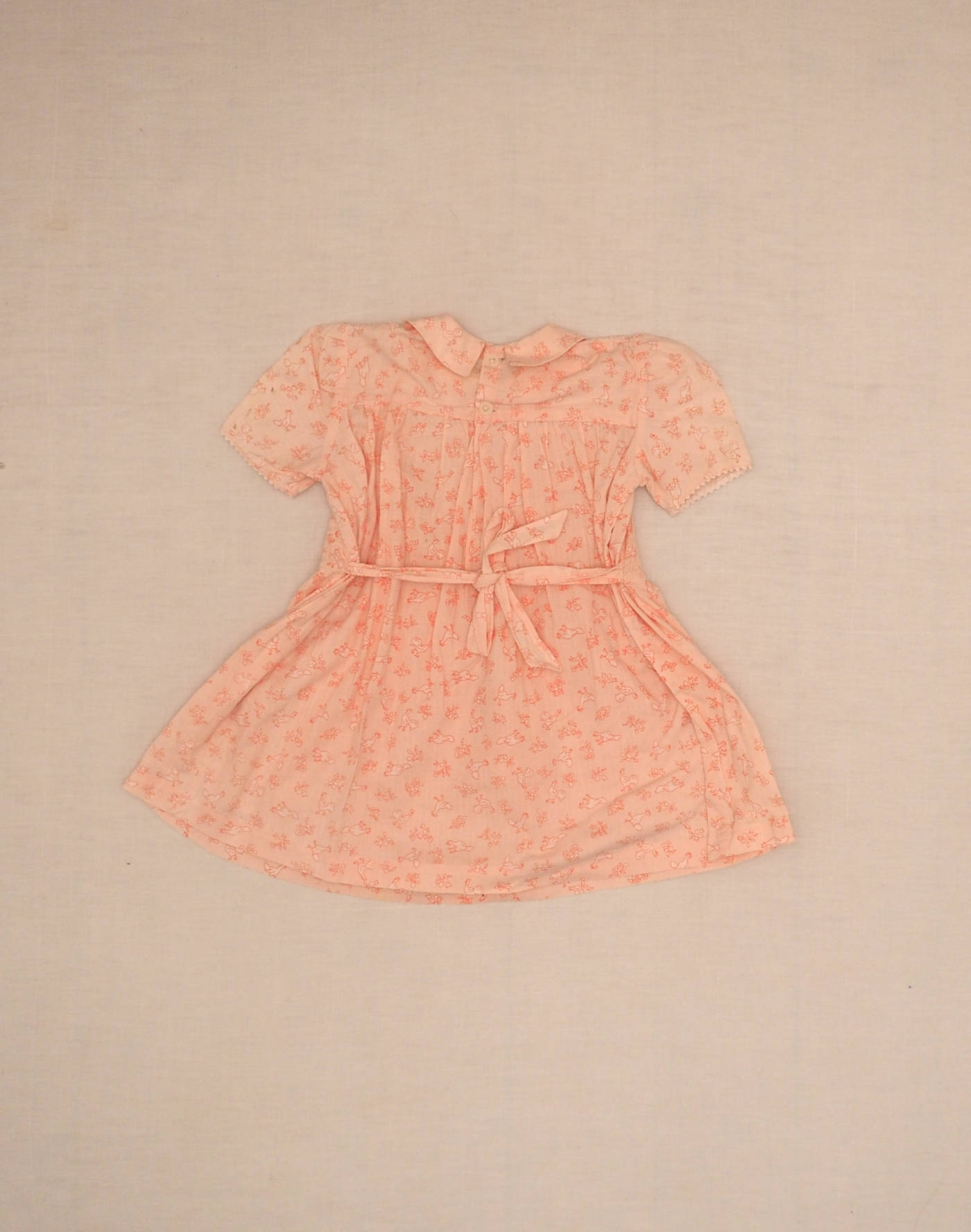 Années 1950. Très jolie robe rose à fin motif poules et fleurs, smocks sur la taille, manches courtes ballon bordées de croquet blanc, col claudine, une bride à nouer dans le dos, dermée par deux boutons derrière. Très bon état, pas d’étiquette de composition mais toucher coton.