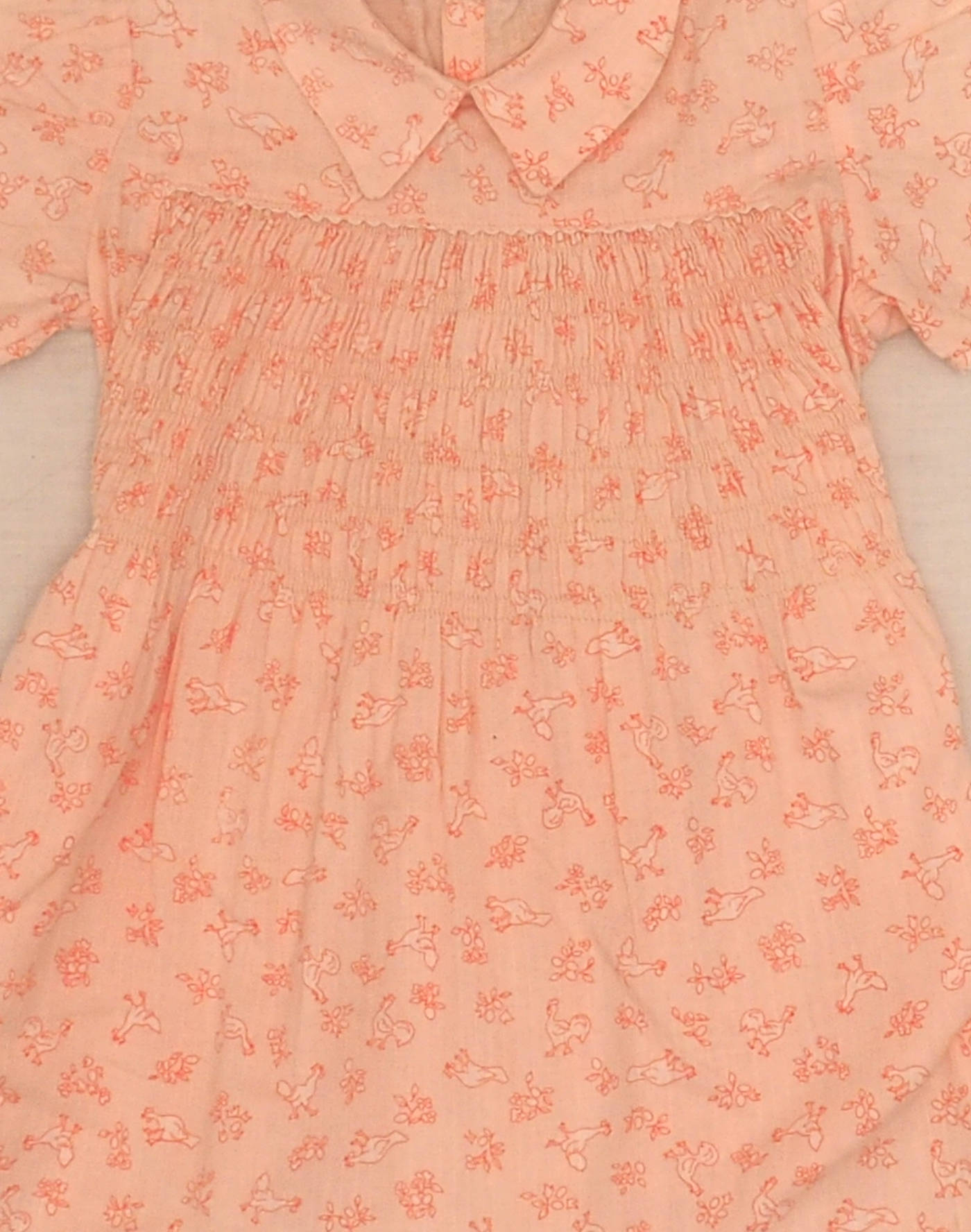 Années 1950. Très jolie robe rose à fin motif poules et fleurs, smocks sur la taille, manches courtes ballon bordées de croquet blanc, col claudine, une bride à nouer dans le dos, dermée par deux boutons derrière. Très bon état, pas d’étiquette de composition mais toucher coton.