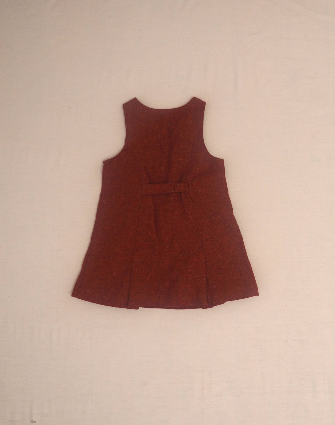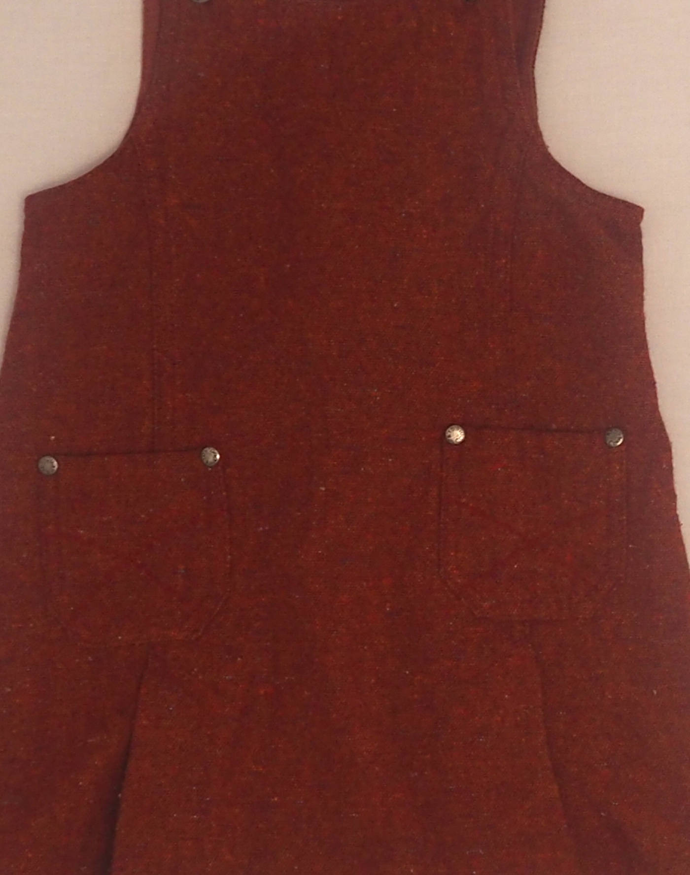 Mignonne robe d’hiver entièrement doublée en tweed bordeaux, fermée aux épaules par deux boutons, deux poches plaquées devant. Un petit lien à scratch dans le dos. Très bon état, pas d’étiquette de composition.