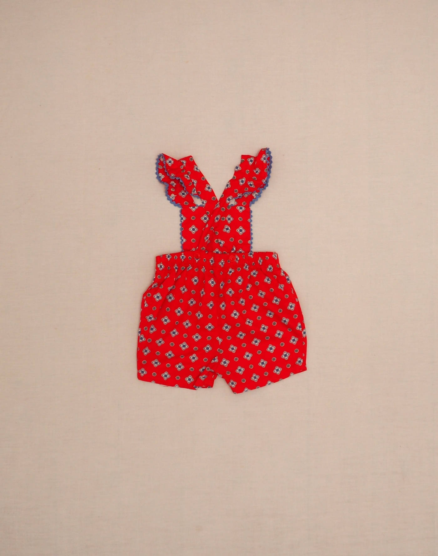 Jacadi vintage. Ravissante salopette short en coton léger rouge à imprimé provencal, crochet sur le buste et les bretelles croisées, plissé à la taille avec élastique dans le dos. Bretelles attachées dans le dos par deux boutons. Fabriquée en France, très bon état, 100% coton.