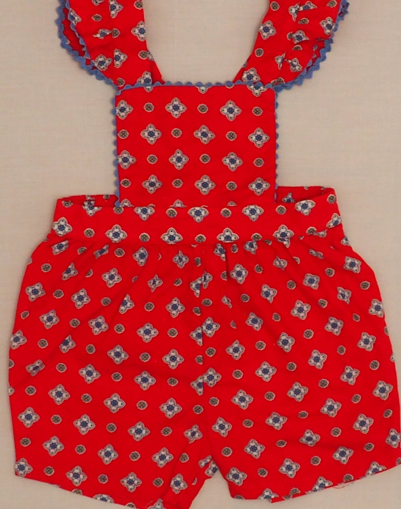 Jacadi vintage. Ravissante salopette short en coton léger rouge à imprimé provencal, crochet sur le buste et les bretelles croisées, plissé à la taille avec élastique dans le dos. Bretelles attachées dans le dos par deux boutons. Fabriquée en France, très bon état, 100% coton.