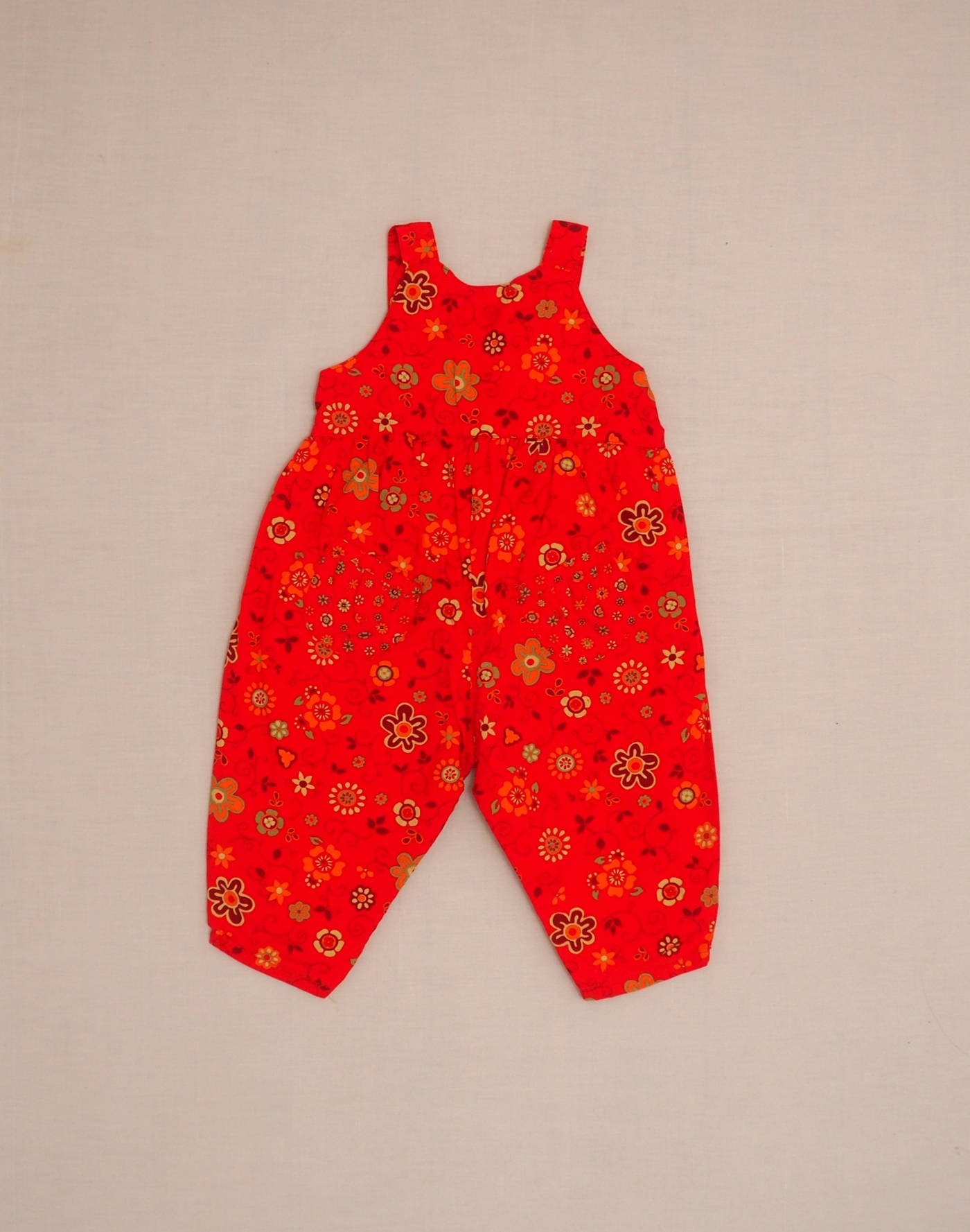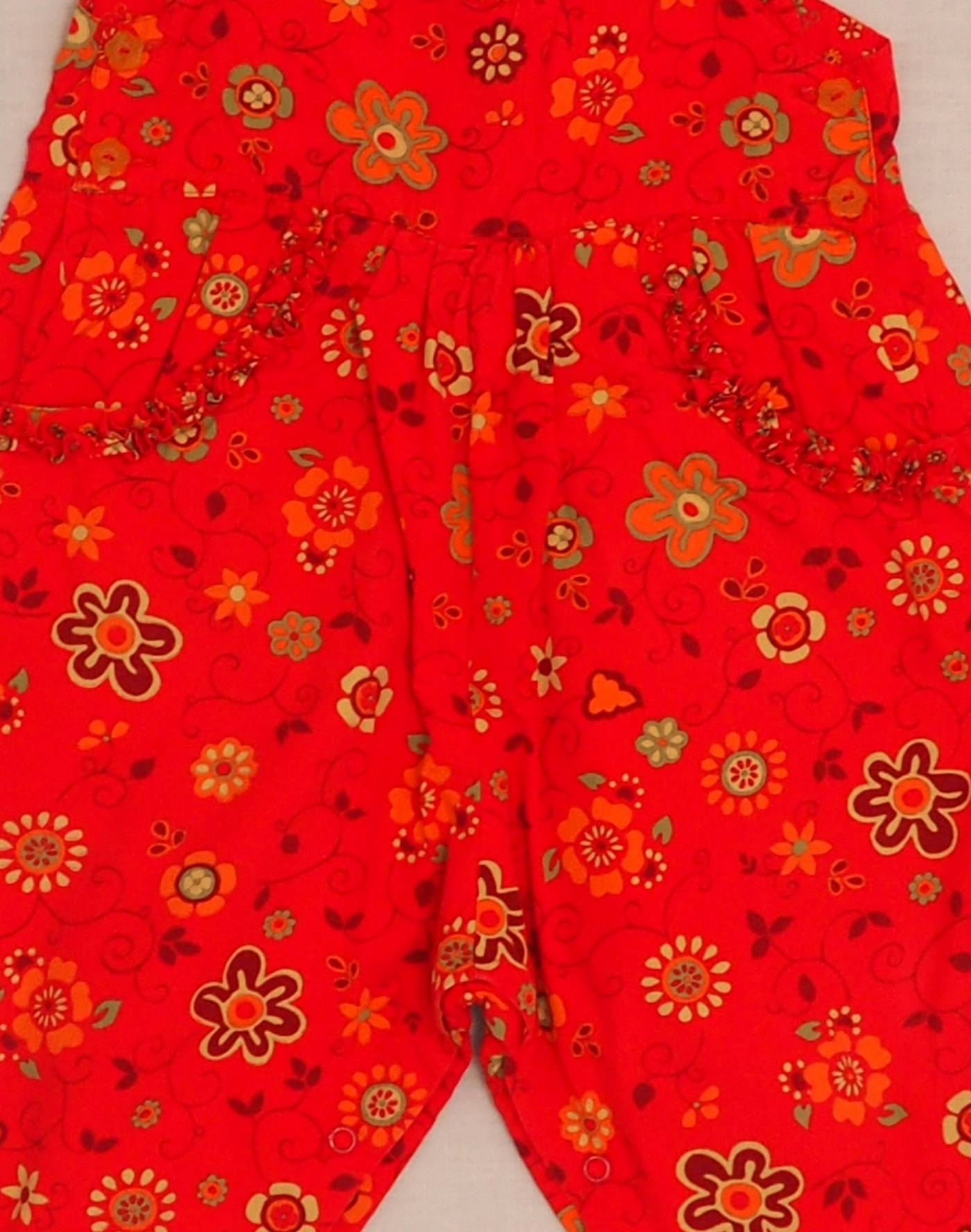 Belle salopette en coton rouge fleuri entièrement doublée en coton orange, froufrous sur le buste et les poches, deux poches devant, deux poches plaquées derrière, bretelles réglables attachées devant par deux boutons en forme de fleurs, quatre boutons à la taille pour fermer. Très bon état, 100% coton.