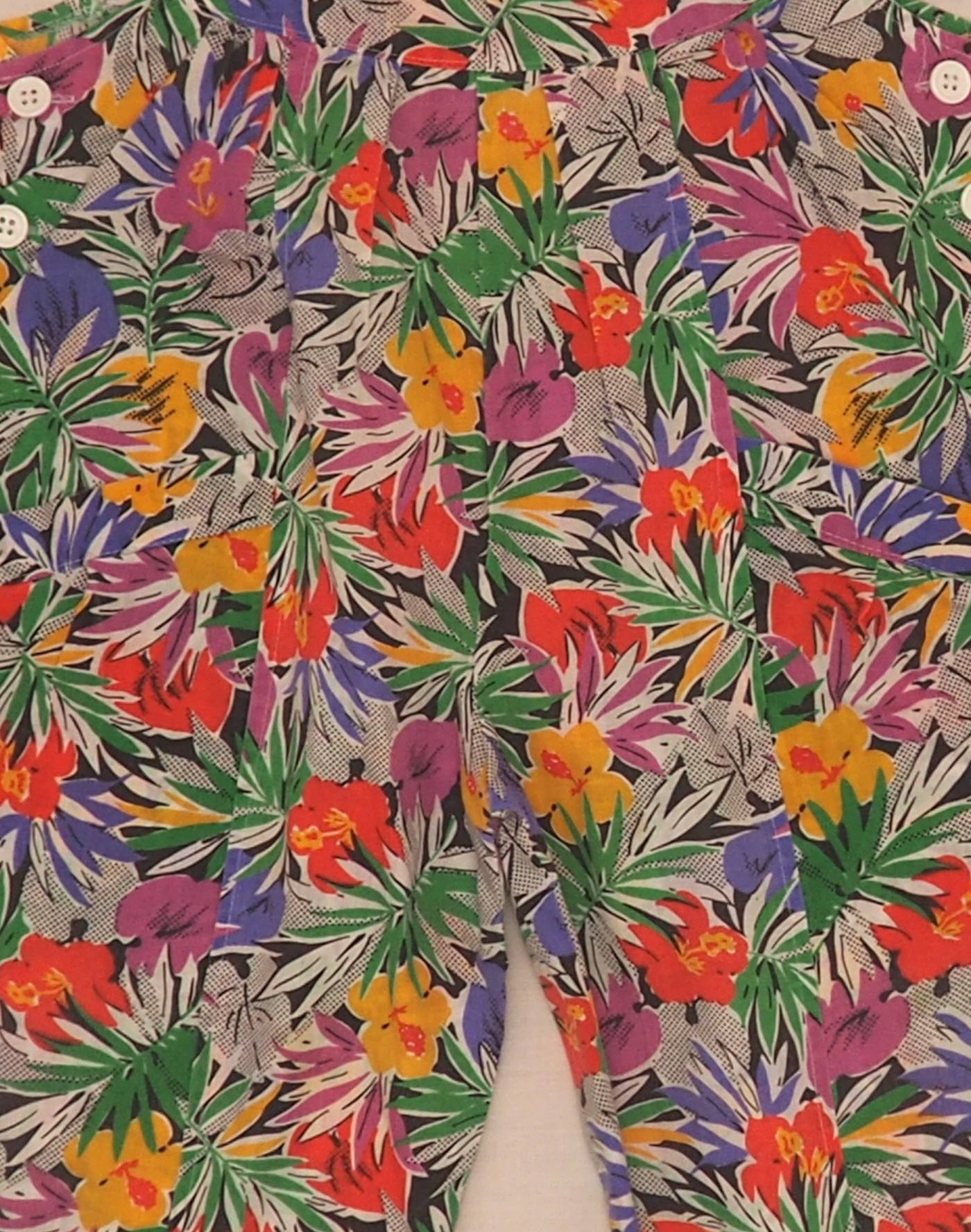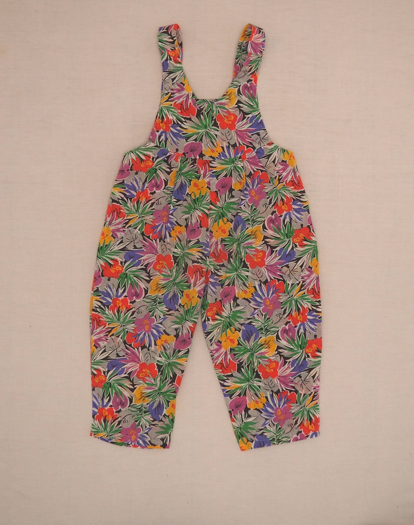 Jolie salopette en coton léger à imprimé fleuri, deux poches devant, bretelles attachées devant par deux boutons, quatre boutons à la taille. Très bon état, tissu 65% polyester, 35% coton.