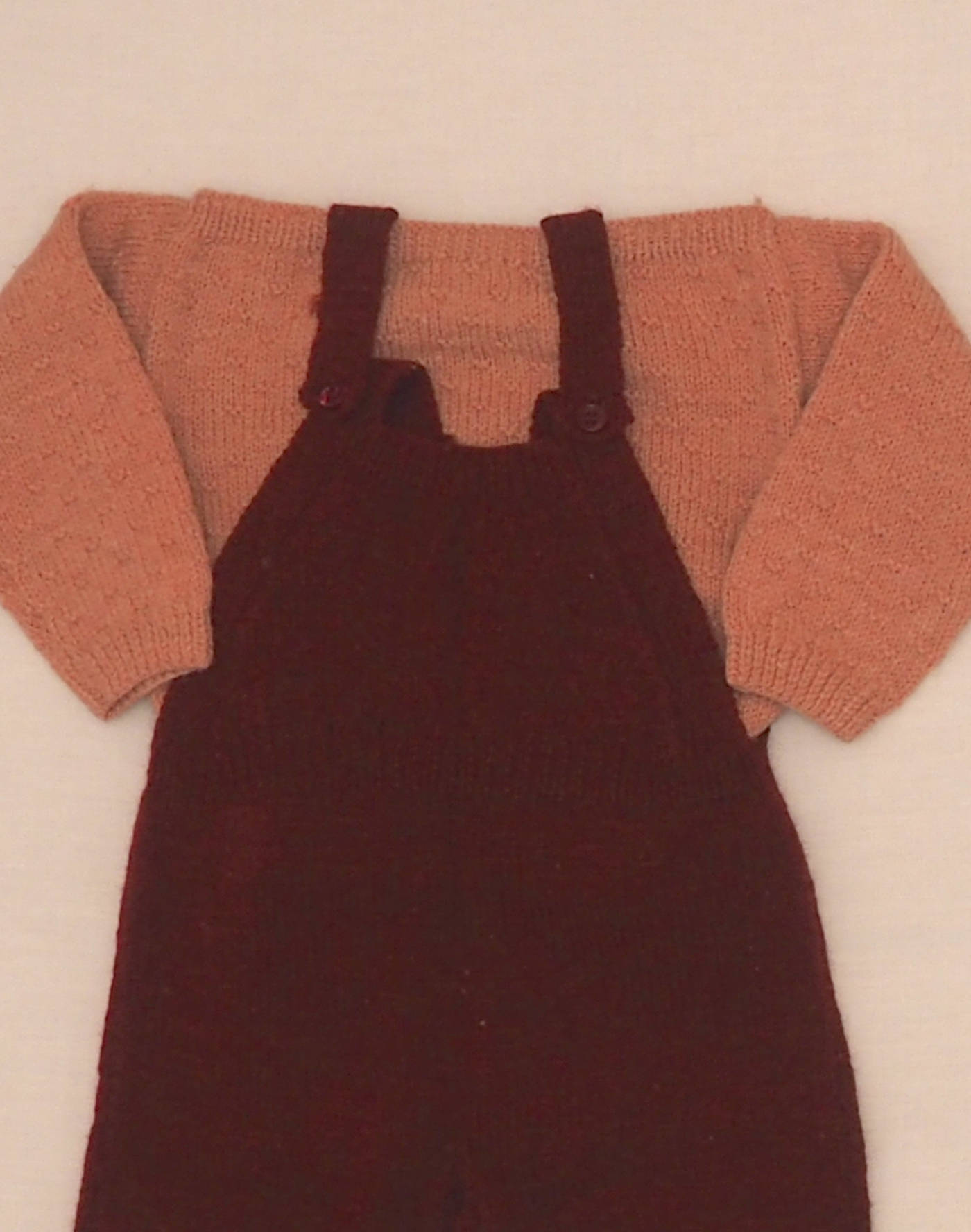 Pièces tricotées à la main. Très bel ensemble des années 1960 composé d’une salopette en maille bordeaux avec pieds intégrés, bretelles attachées devant par deux boutons, pull assorti avec joli point texturé, fermé aux épaules par deux boutons pression. Très bon état, toucher laine douce.