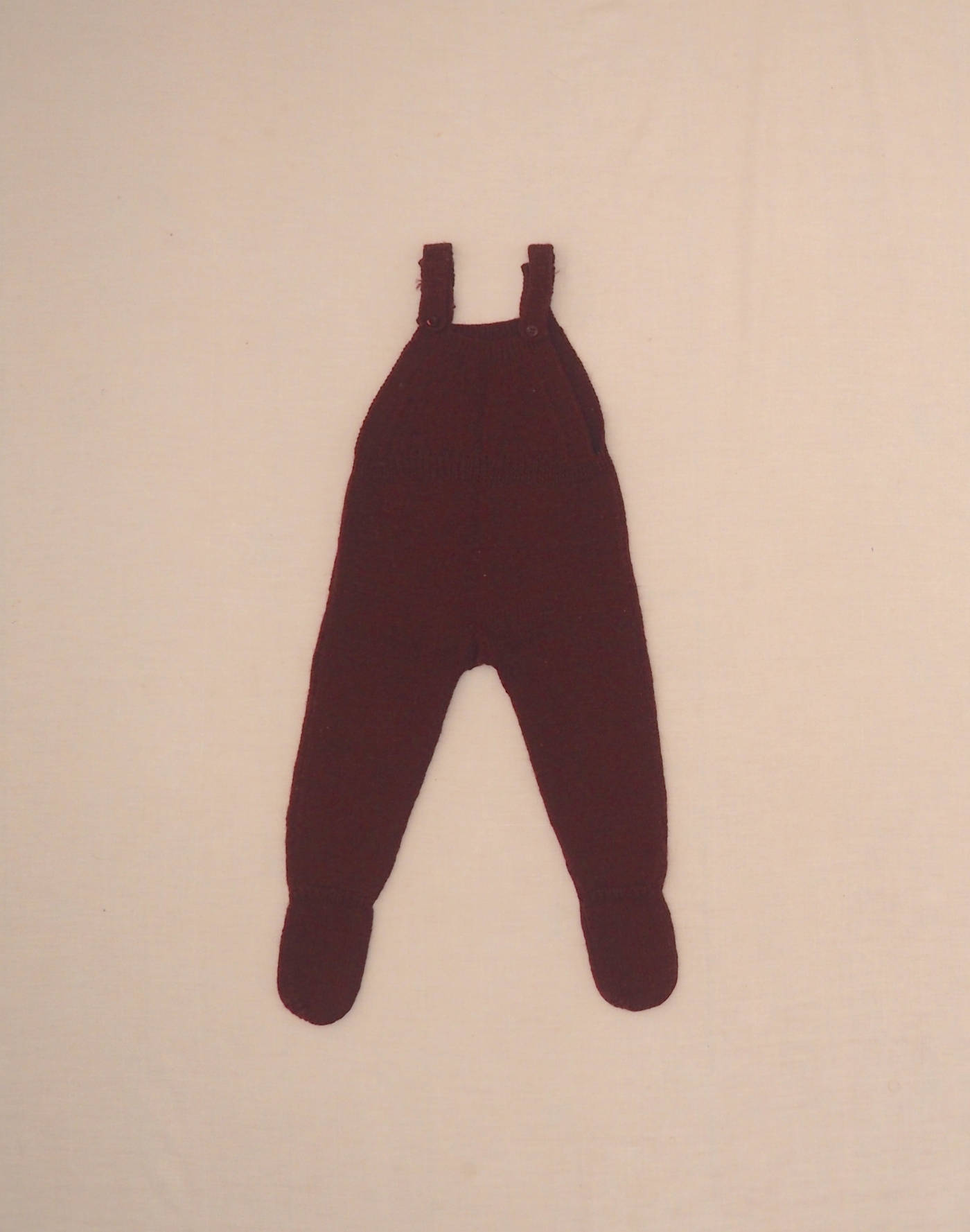 Pièces tricotées à la main. Très bel ensemble des années 1960 composé d’une salopette en maille bordeaux avec pieds intégrés, bretelles attachées devant par deux boutons, pull assorti avec joli point texturé, fermé aux épaules par deux boutons pression. Très bon état, toucher laine douce.