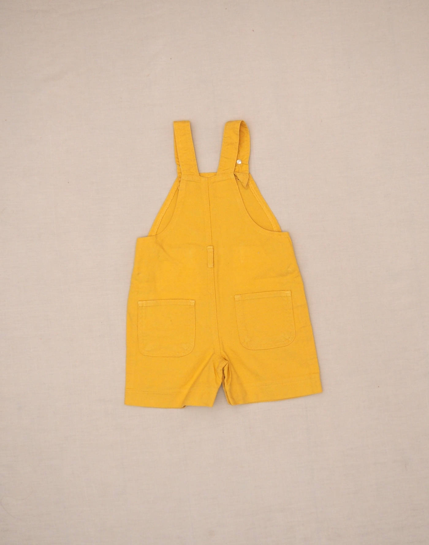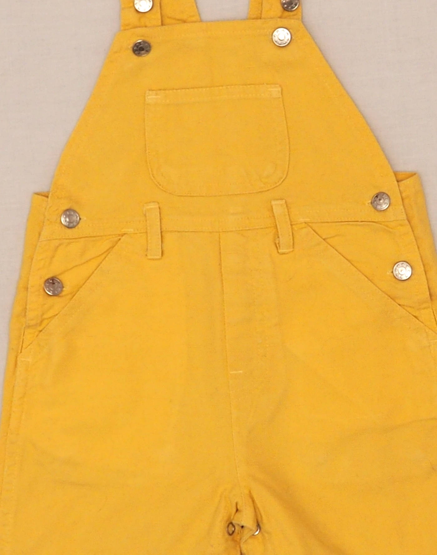 Parfaite salopette short en coton jaune robuste, une poche sur le buste, deux poches à la taille, deux poches plaquées derrière, bretelles réglables attachées par deux rivets devant, quatre rivets à la taille, quatre boutons pression à l’entrejambe. Très bon état, 100% coton.