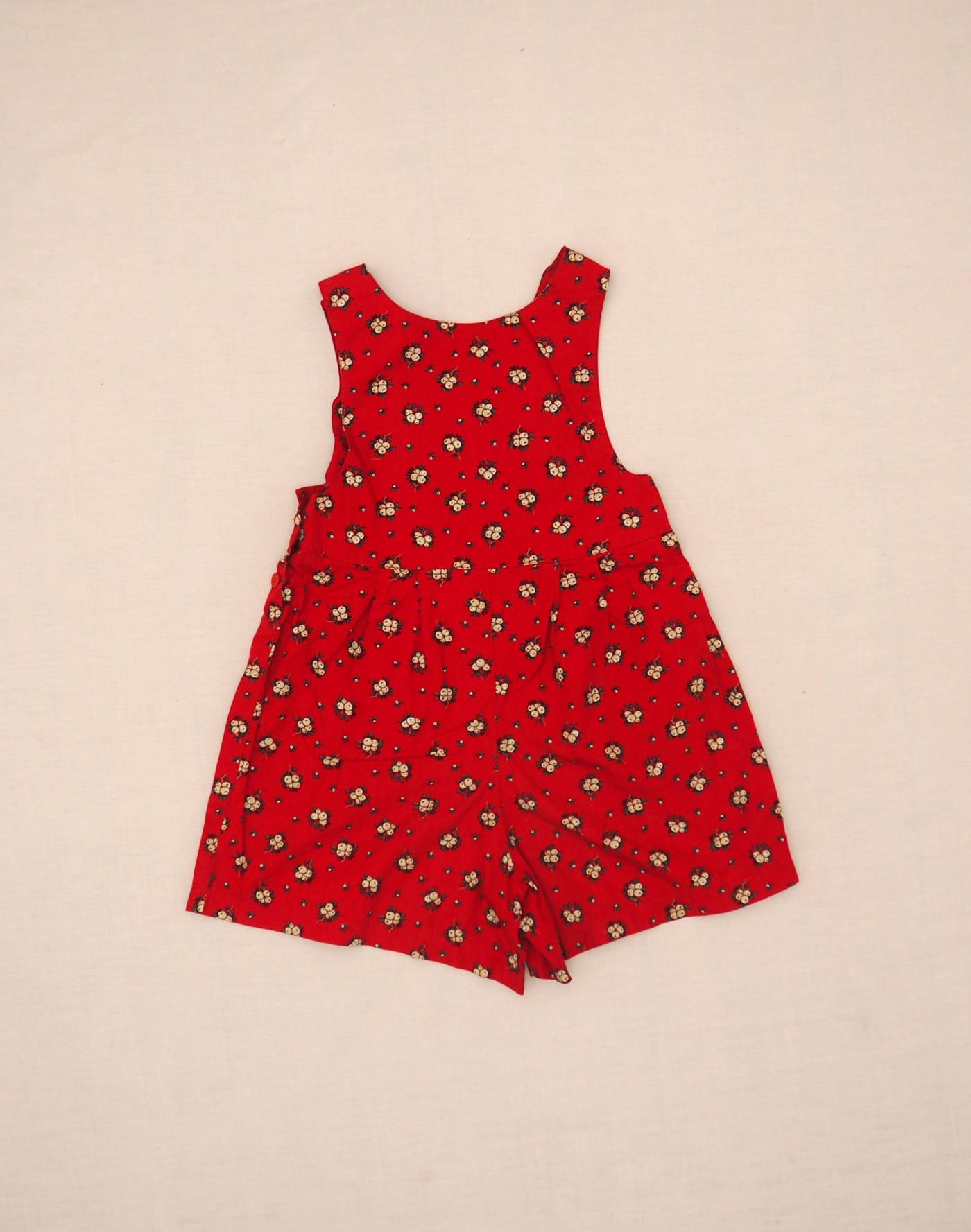 Magnifique salopette short rouge à motif petites pommes avec une poche à rabat boutonné sur le buste, pinces à la taille, bretelles attachées aux épaules par deux boutons, quatre boutons à la taille. Très bon état, 100% coton.