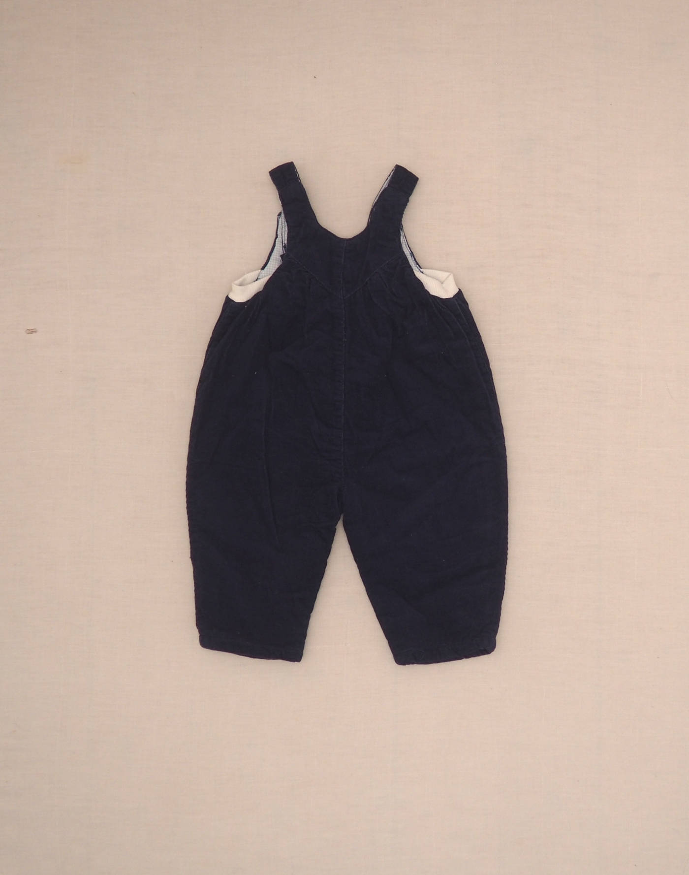 Jolie salopette en velours bleu marine finement côtelé, entièrement molletonnée et doublée en vichy bleu, bretelles attachées devant par deux rivets pression, petits lapins brodés sur la boutonnière, fermée par trois pressions devant. Pas de boutonnage à l’entrejambe. Très bon état, 100% coton.