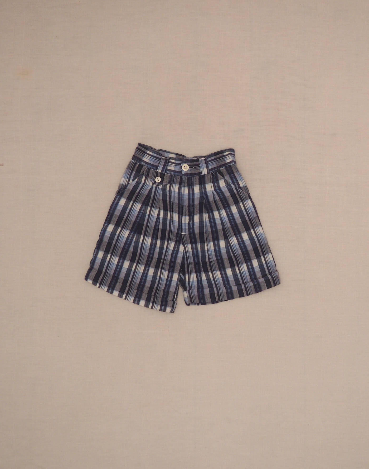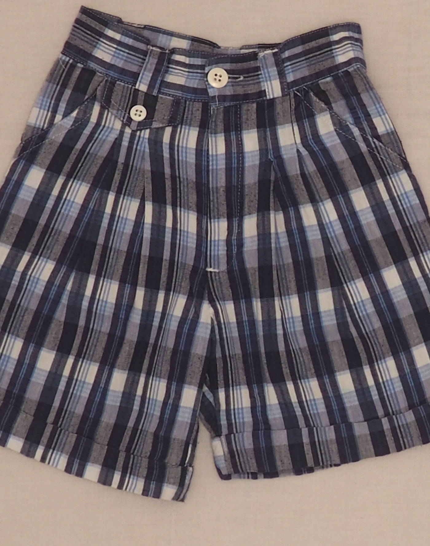 Parfait short en seersucker à carreaux bleu, deux poches devant, une poche boutonnée derrière, fermé par un bouton et braguette. Revers cousu sur la cuisse. Très bon état, tissu 72% coton, 28% polyester.