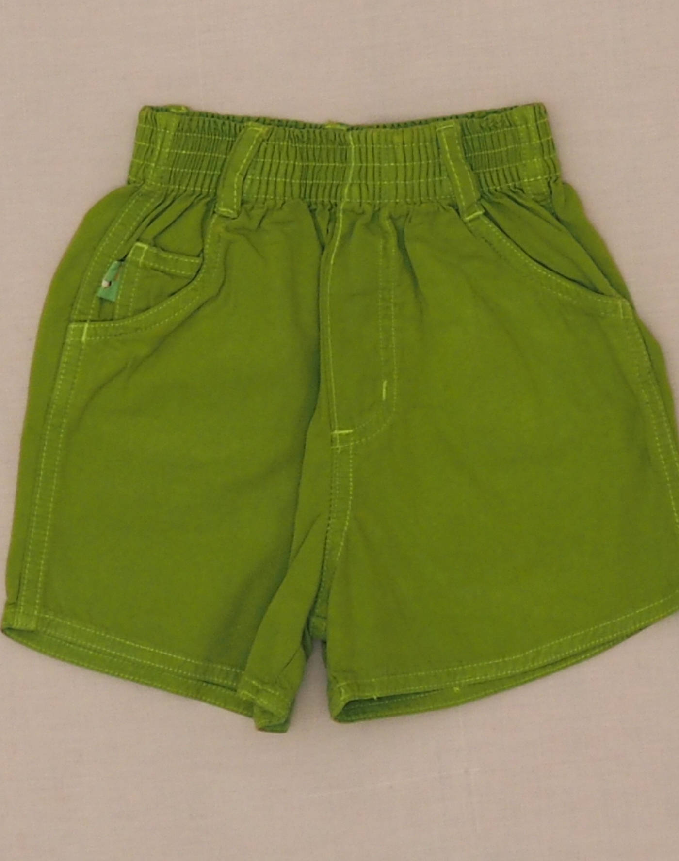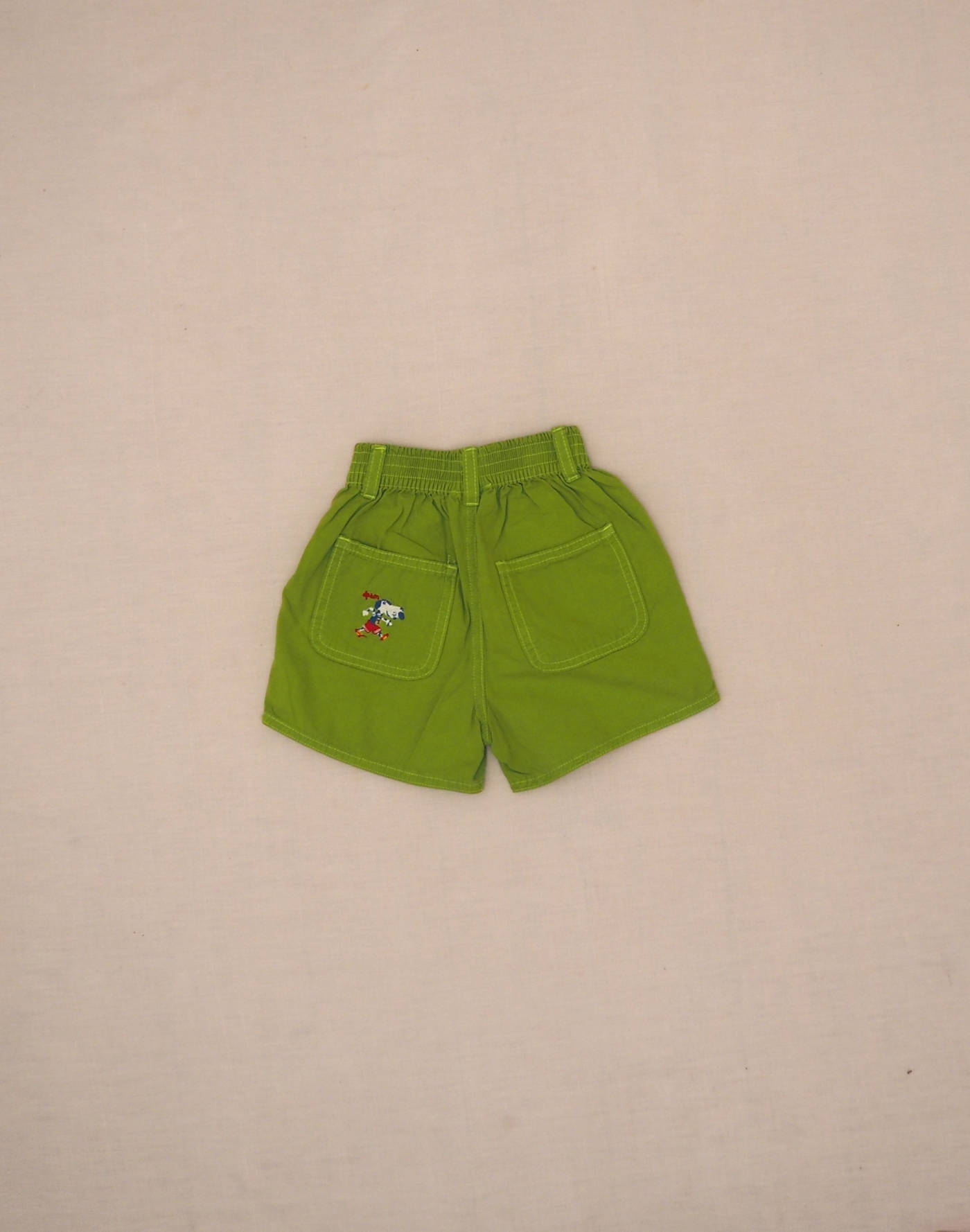 Joli short à taille élastique avec deux poches devant, deux poches plaquées derrière dont l’une brodée d’un petit chien sportif. Très bon état, 100% coton.