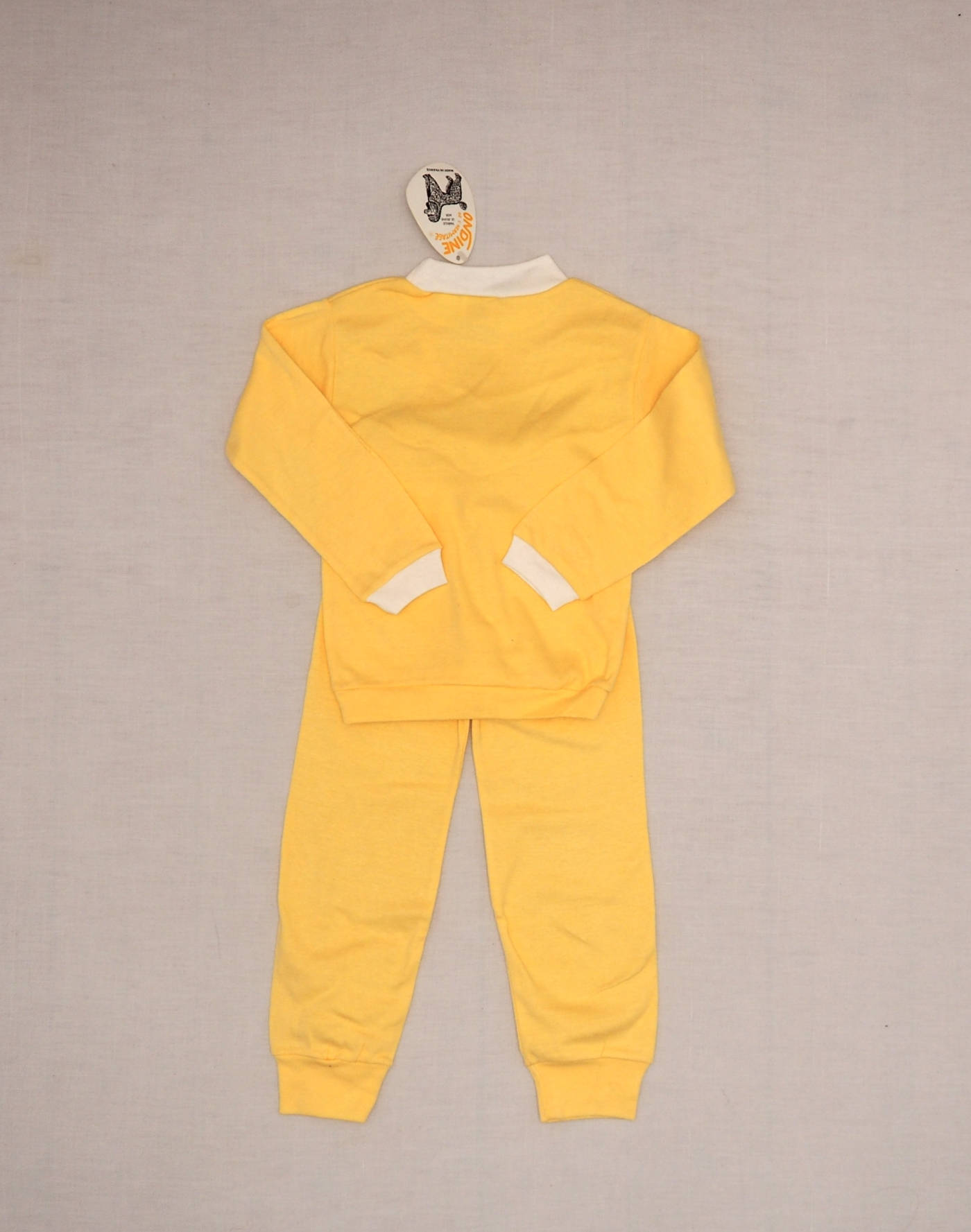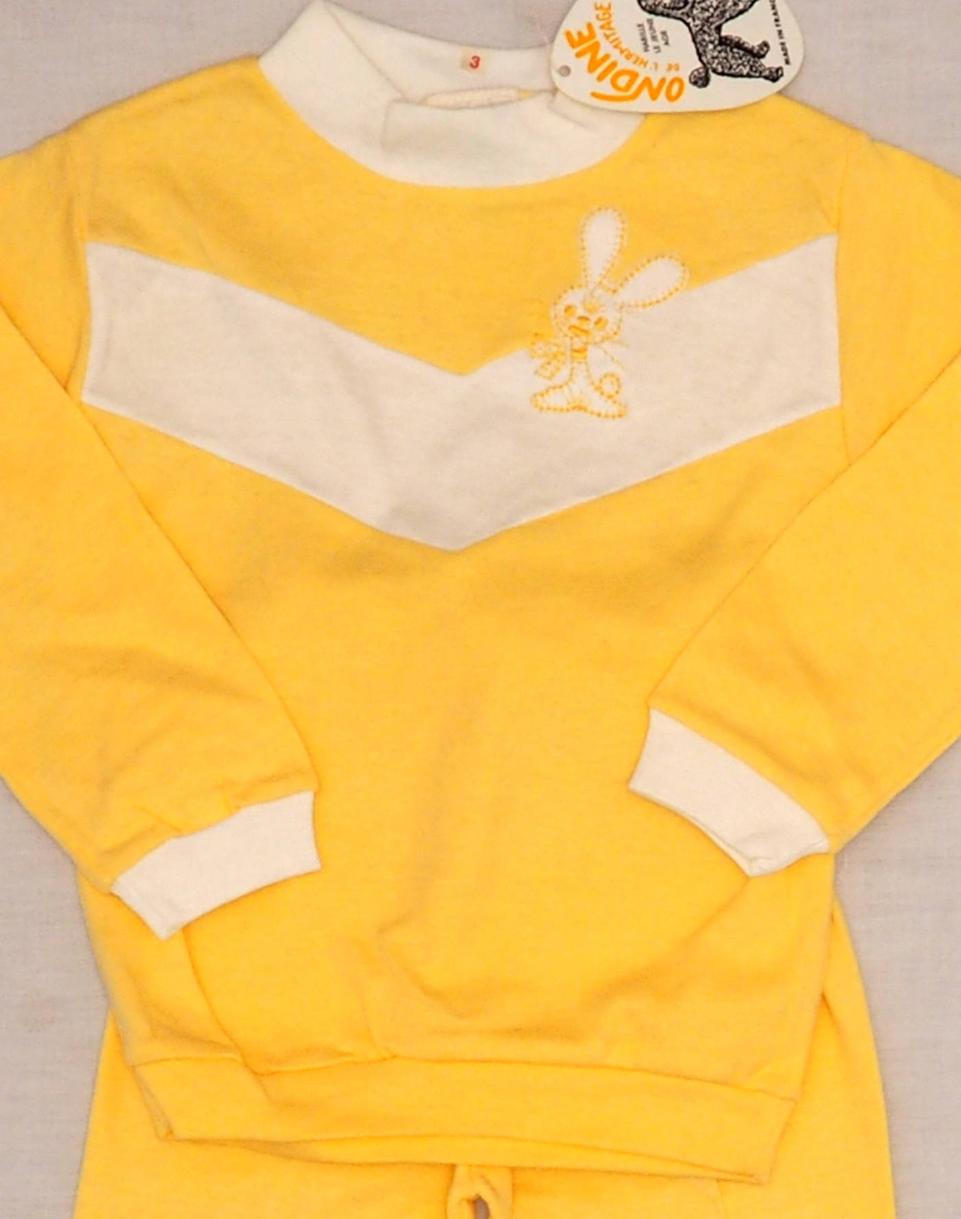 Années 1970. Magnifique survêtement en jersey de coton jaune et blanc composé d’un T-shirt à manches longues avec appliqué lapin sur le buste, et d’un pantalon assorti taille élastique. Fabriqué en France, état neuf avec étiquette, 100% coton.