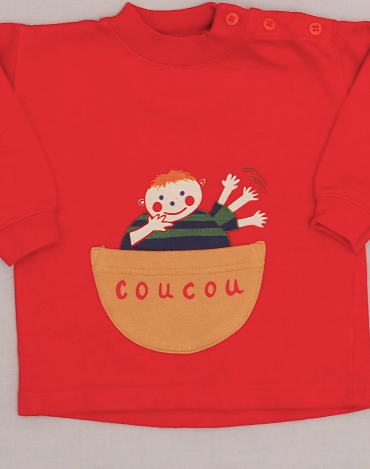 Adorable sweatshirt rouges avec imprimé petit bonhomme qui fait coucou et poche ventrale imprimée « coucou », fermé par trois boutons à l’épaule. Très bon état, tissu 50% coton, 50% acrylique. Indiqué 12 mois mais correspond à un 18 mois standard.