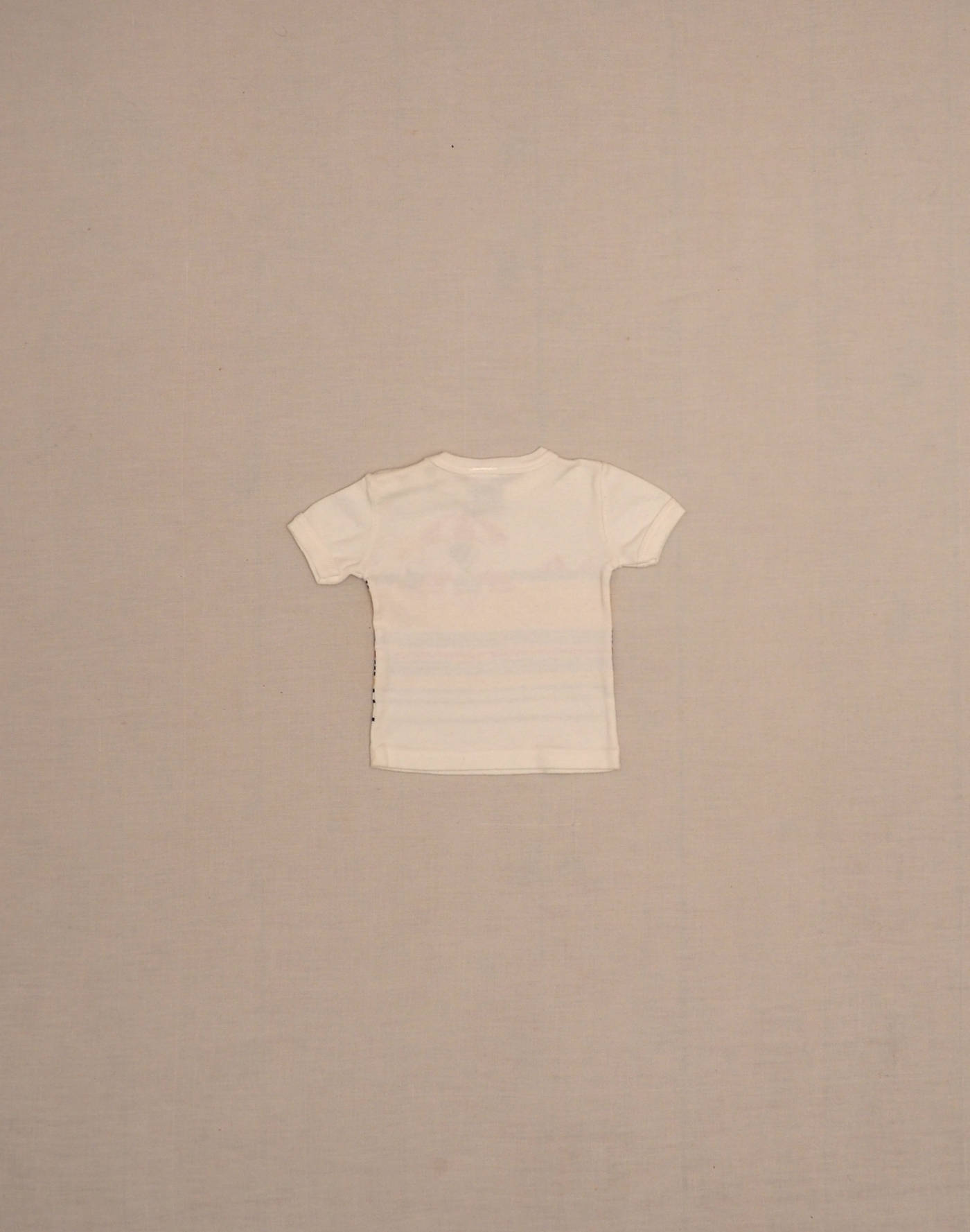 Adorable T-shirt manches courtes en jersey blanc motif vacanciers blasés attablés à la plage, et rayures. Fabriqué en France, très bon état, 100% coton.