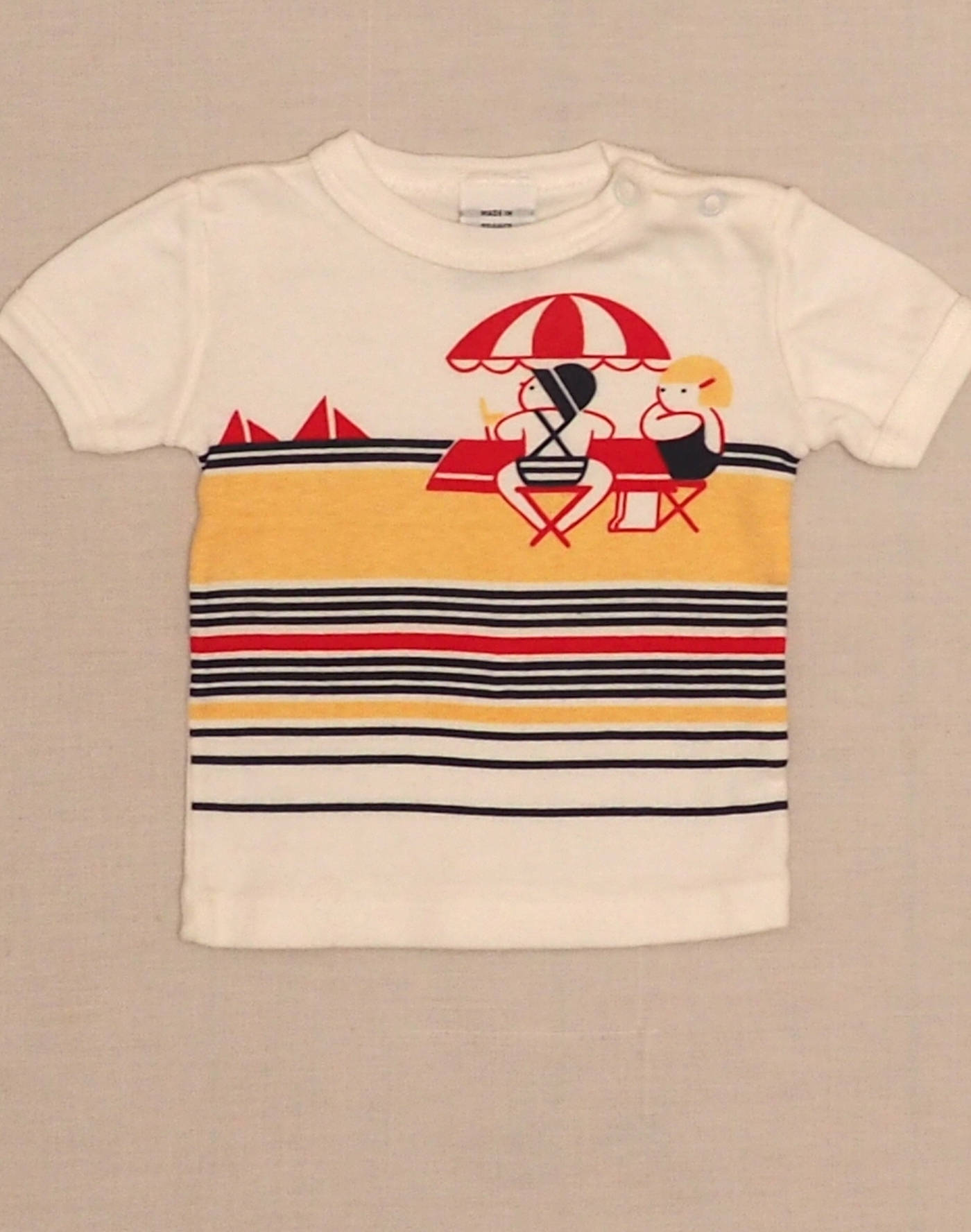 Adorable T-shirt manches courtes en jersey blanc motif vacanciers blasés attablés à la plage, et rayures. Fabriqué en France, très bon état, 100% coton.