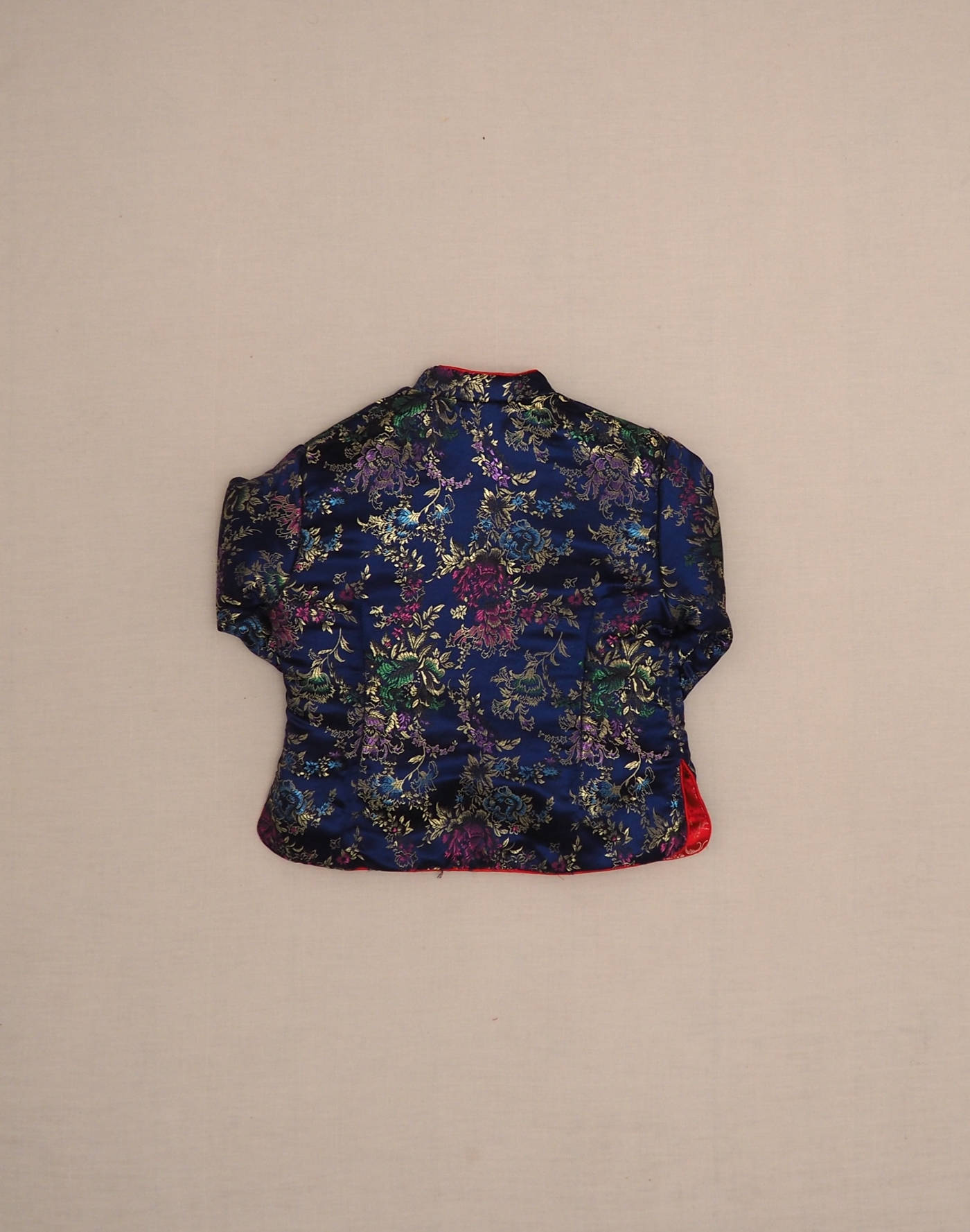 Splendide veste chinoise réversible (un côté rouge, un côté bleu) avec deux poche plaquées devant, fermée par quatre boutons en tissu. Très bon état, pas d’étiquette de composition.