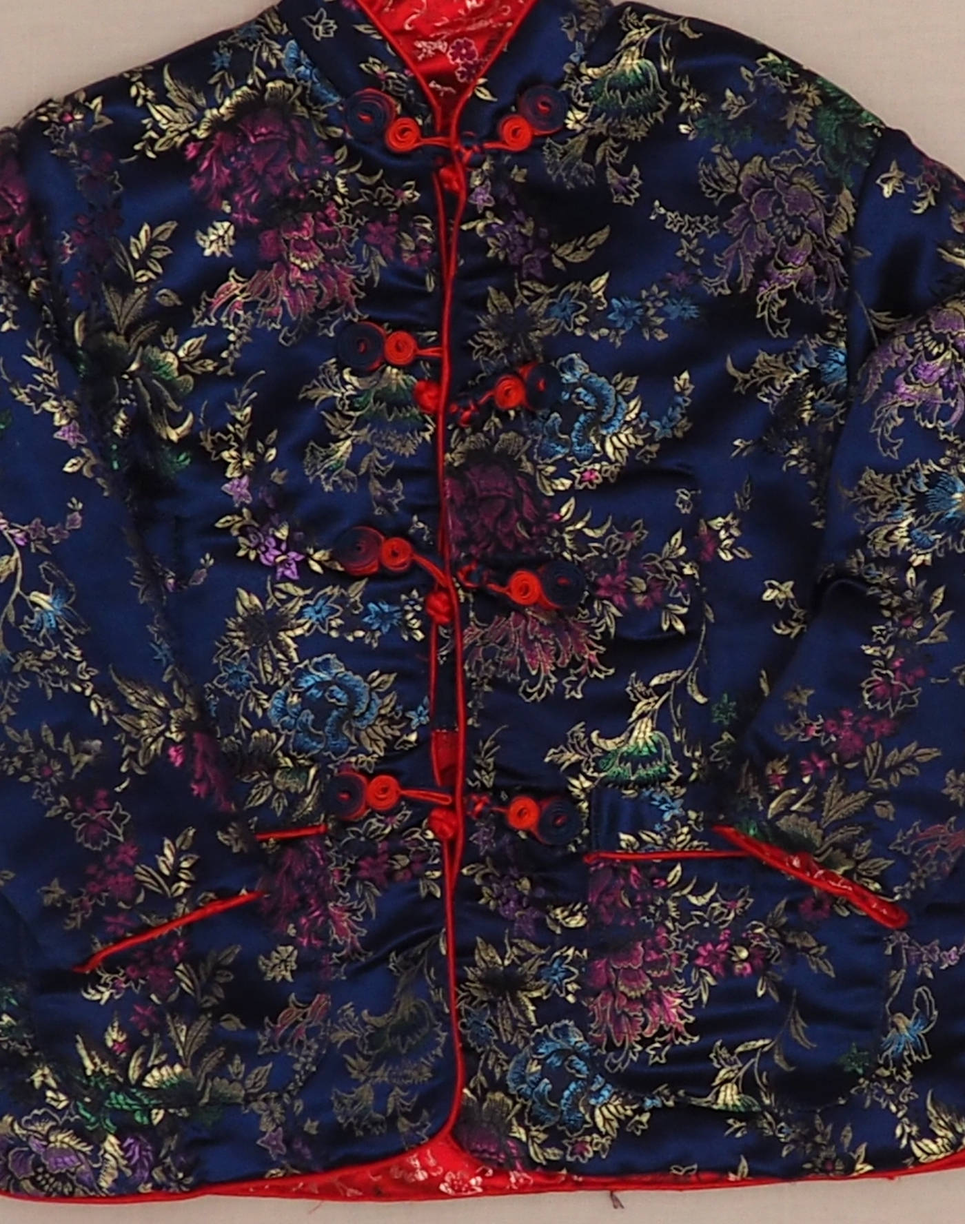 Splendide veste chinoise réversible (un côté rouge, un côté bleu) avec deux poche plaquées devant, fermée par quatre boutons en tissu. Très bon état, pas d’étiquette de composition.
