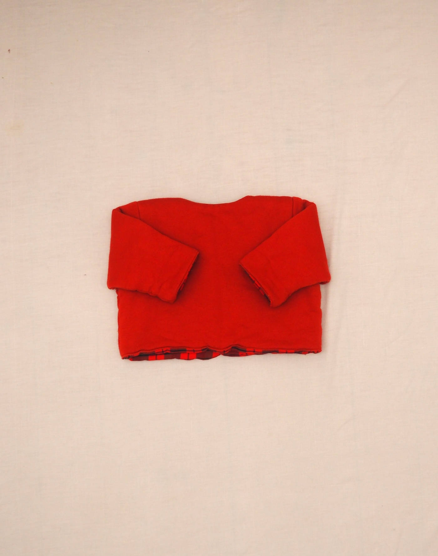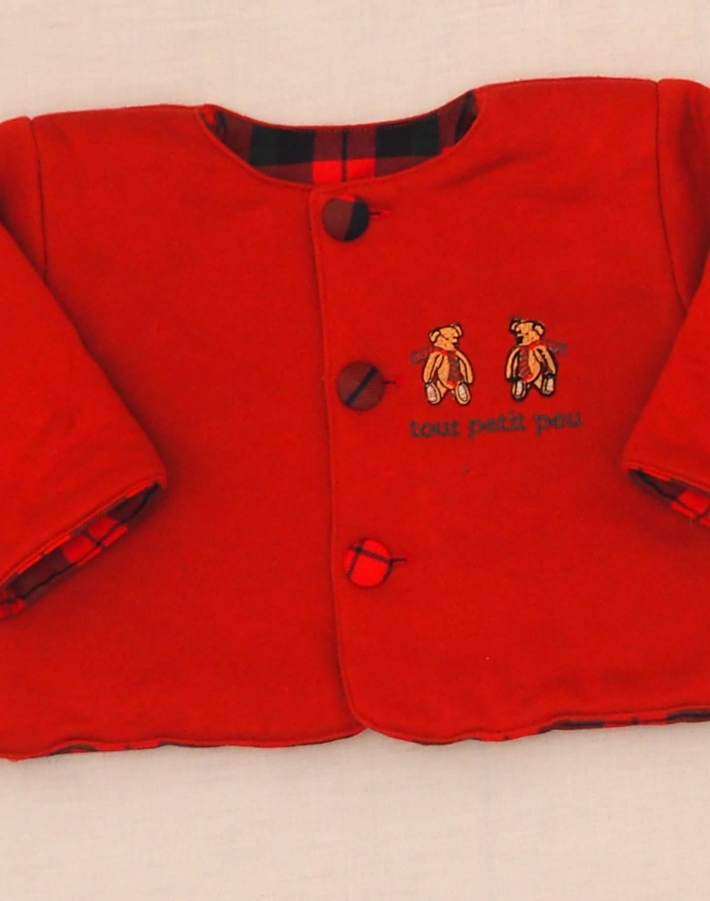 Elégante veste en jersey rouge, doublée en coton tartan et molletonnée, brodée de deux ours à écharpes sur le poitrine, fermée par trois boutons recouverts de tartan. Très bon état, pas d’étiquette de composition mais toucher coton.