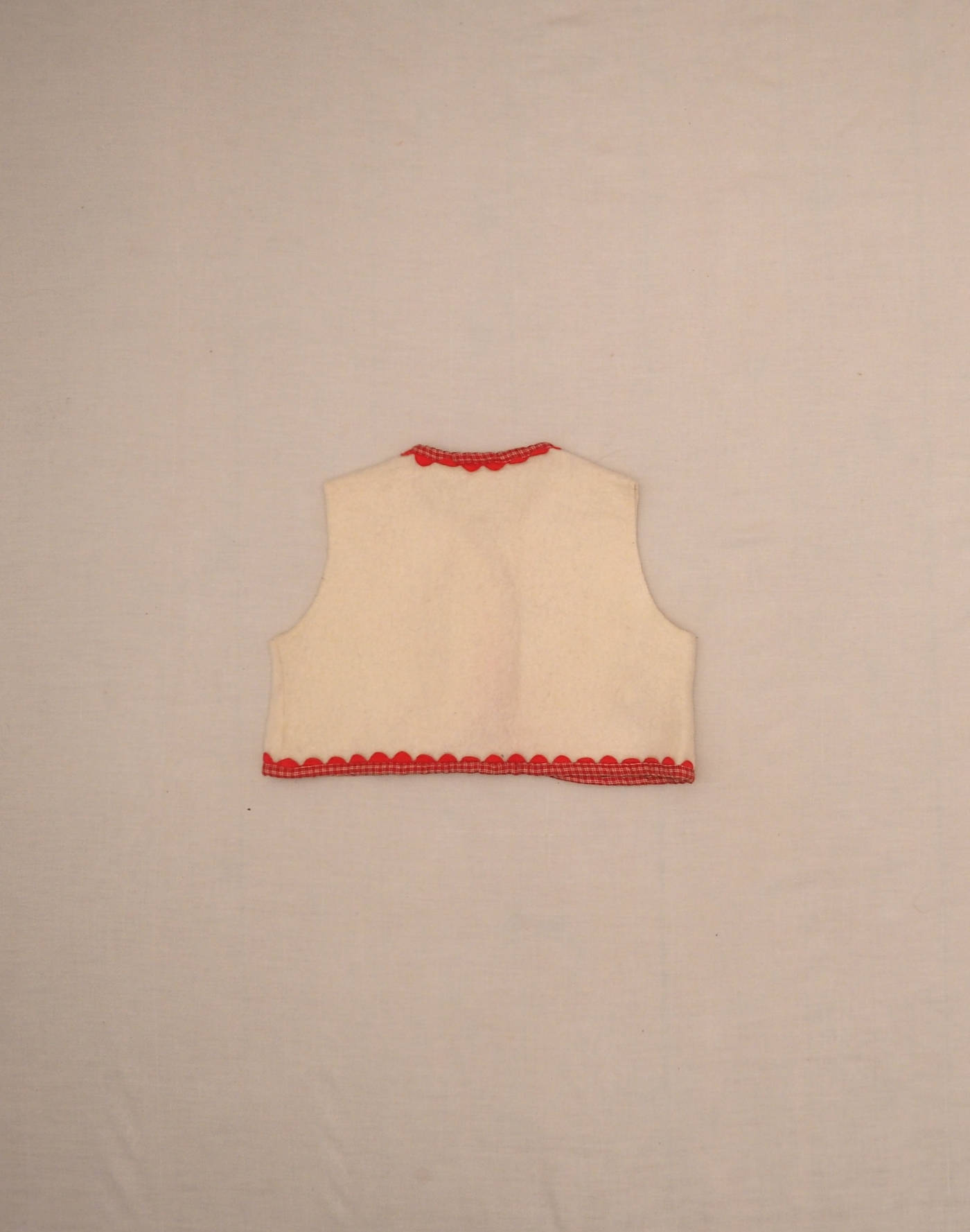 Mignon veston sans manches en feutre blanc brodé d’un passepoil à carreaux rouges avec croquet rouge. Fermé par deux boutons en bois. très bon état, tissu 38% coton, 43% laine, 19% polyamide.