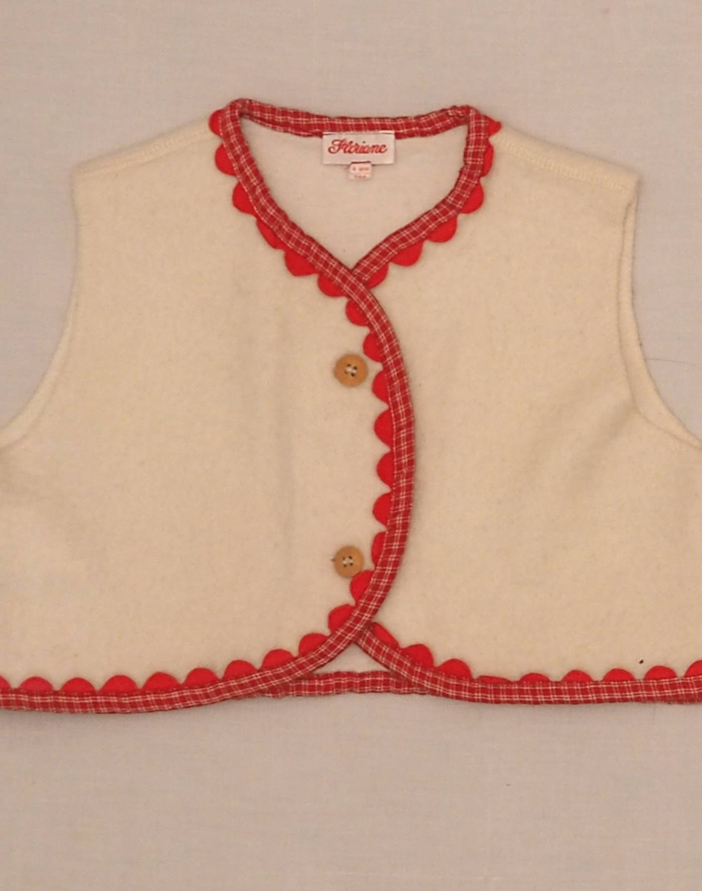 Mignon veston sans manches en feutre blanc brodé d’un passepoil à carreaux rouges avec croquet rouge. Fermé par deux boutons en bois. très bon état, tissu 38% coton, 43% laine, 19% polyamide.