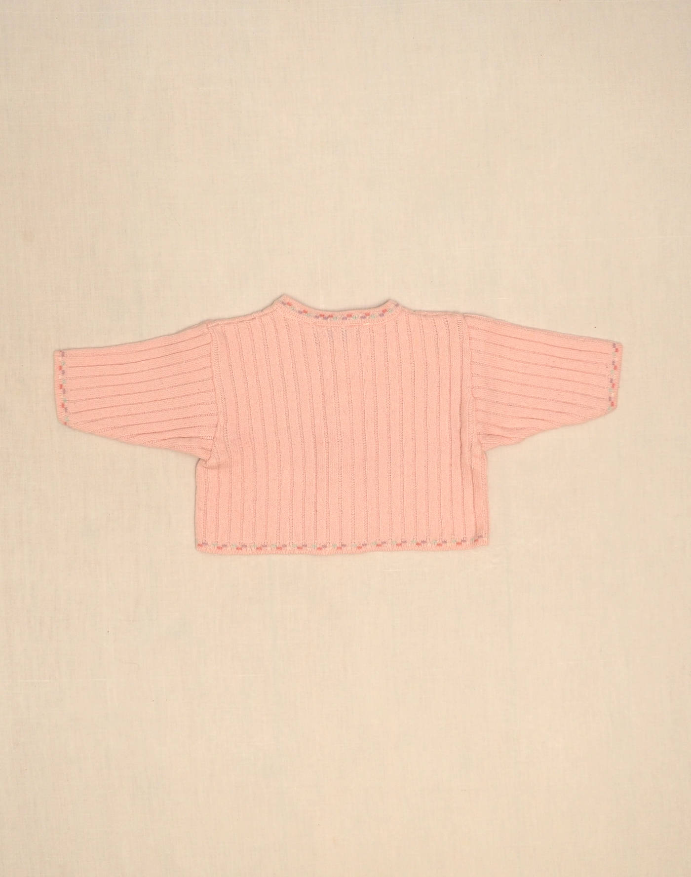 Delightful pale pink rib-knit cardigan, with small jacquard frieze on collar, sleeves and waist. Embroidered with two small characters with large hats on the chest, closed with three snap fasteners. Made in France, knit 51% wool, 49% acrylic, very good condition. Measurements flat: 23cm high from shoulder, 28cm from armpit to armpit, sleeve 14cm from armpit.