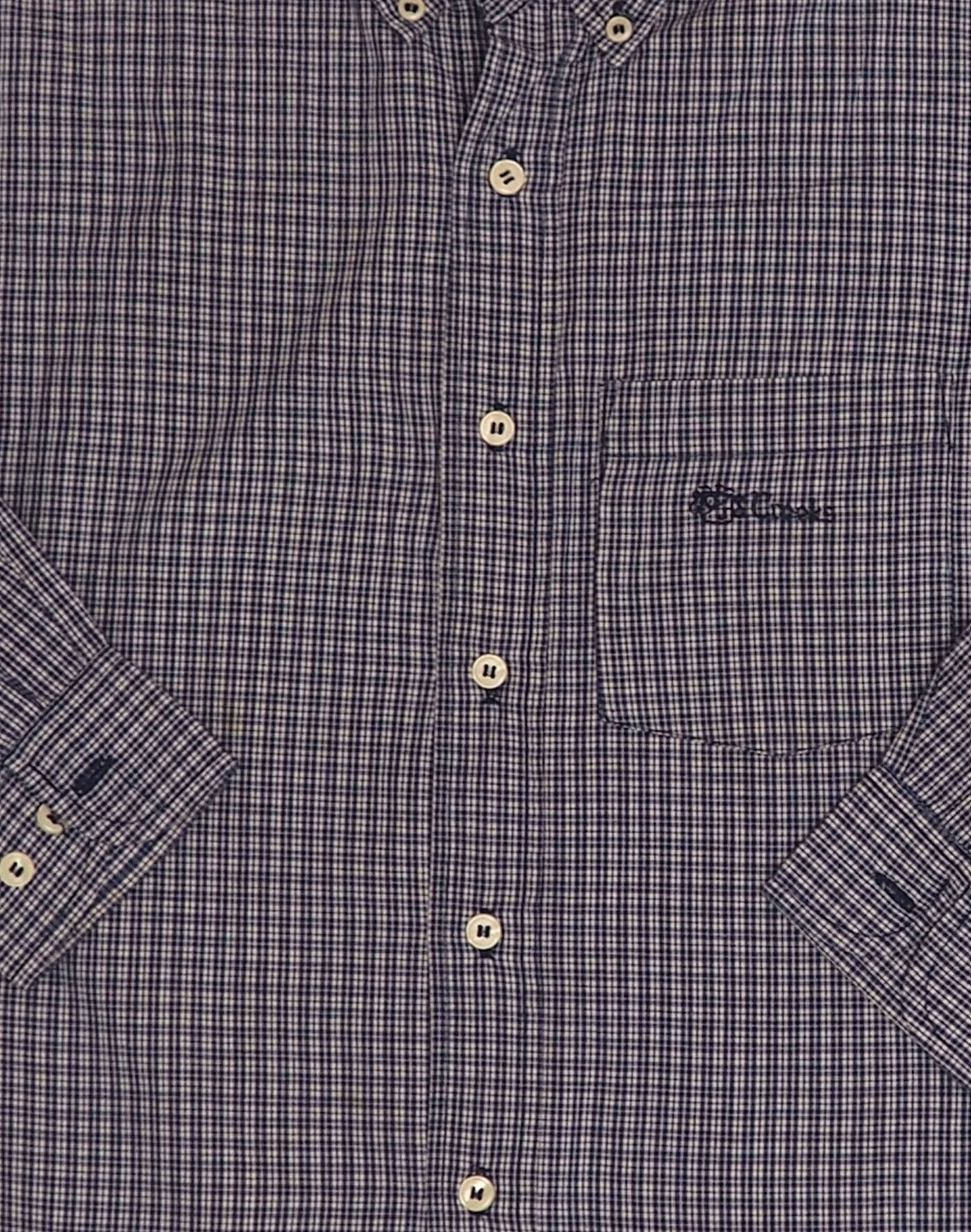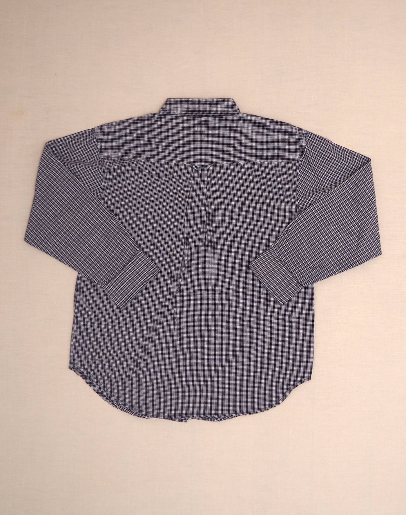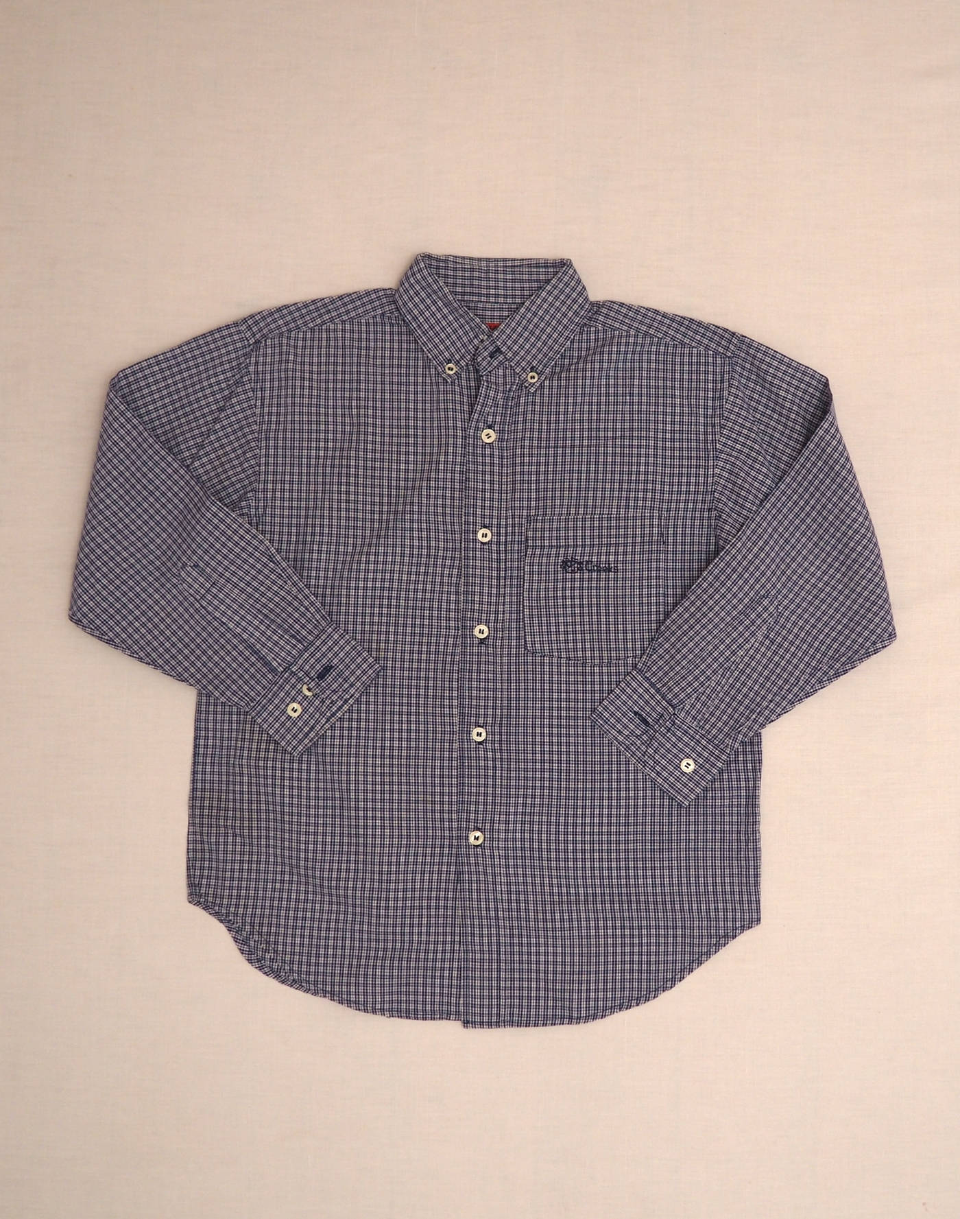 Size 10 years. Elegant vintage Creeks shirt in blue check, long buttoned sleeves, one patch pocket on chest, button-down collar, closed with seven pearly buttons. Very good condition, 100% cotton.
