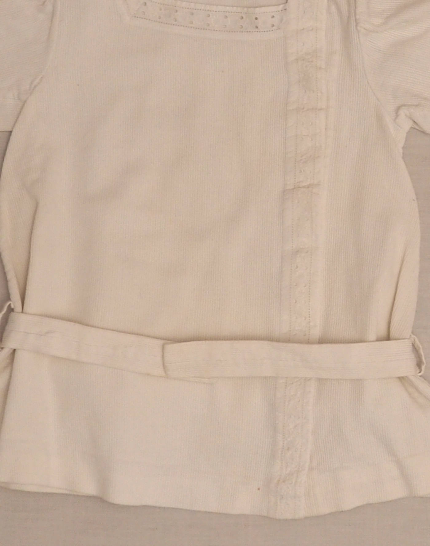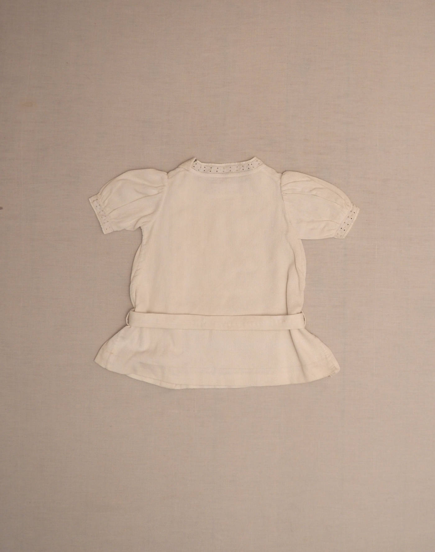 1930s, handmade piece. Splendid short-sleeved blouse in finely ribbed cotton, with openwork lace edges. Closes at the side to the shoulder with eight snap fasteners. A detachable belt with belt loops at the waist, closed with a snap. Very good condition, 100% cotton.