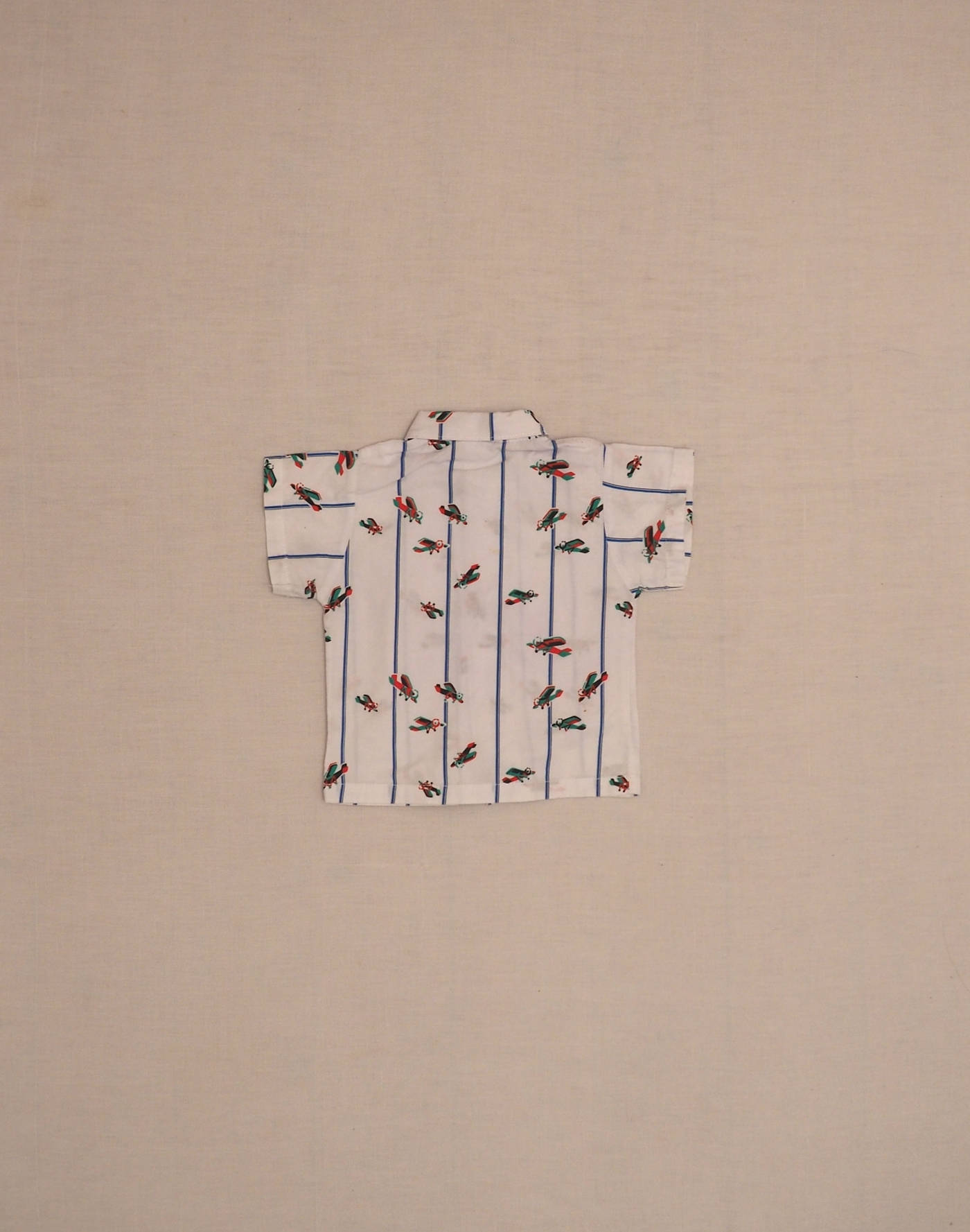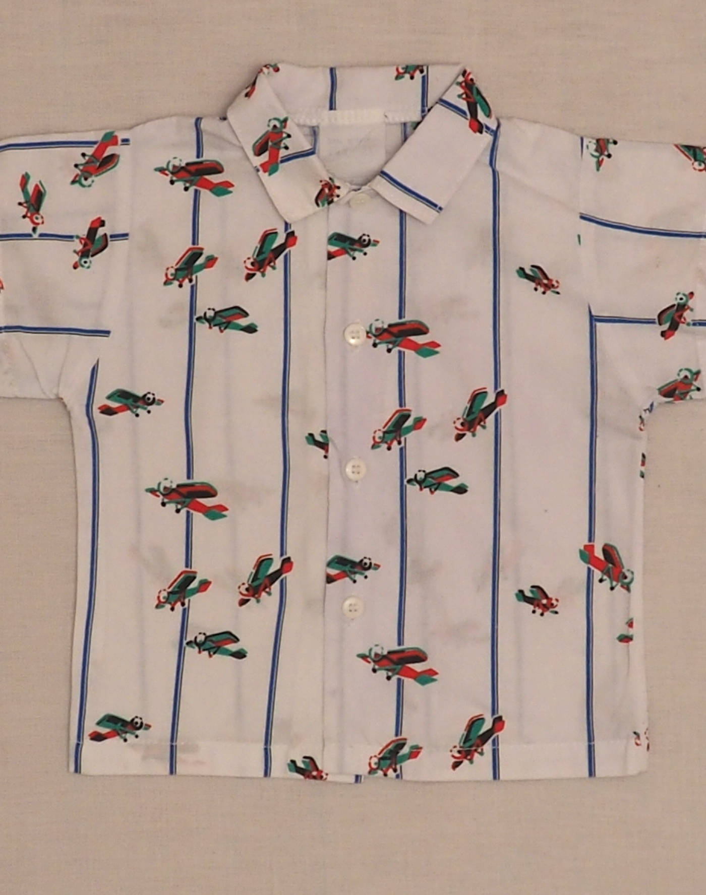 Pretty white blouse with stripes and airplane motifs, small collar, closed with four buttons. Made in France, good condition, 100% cotton.