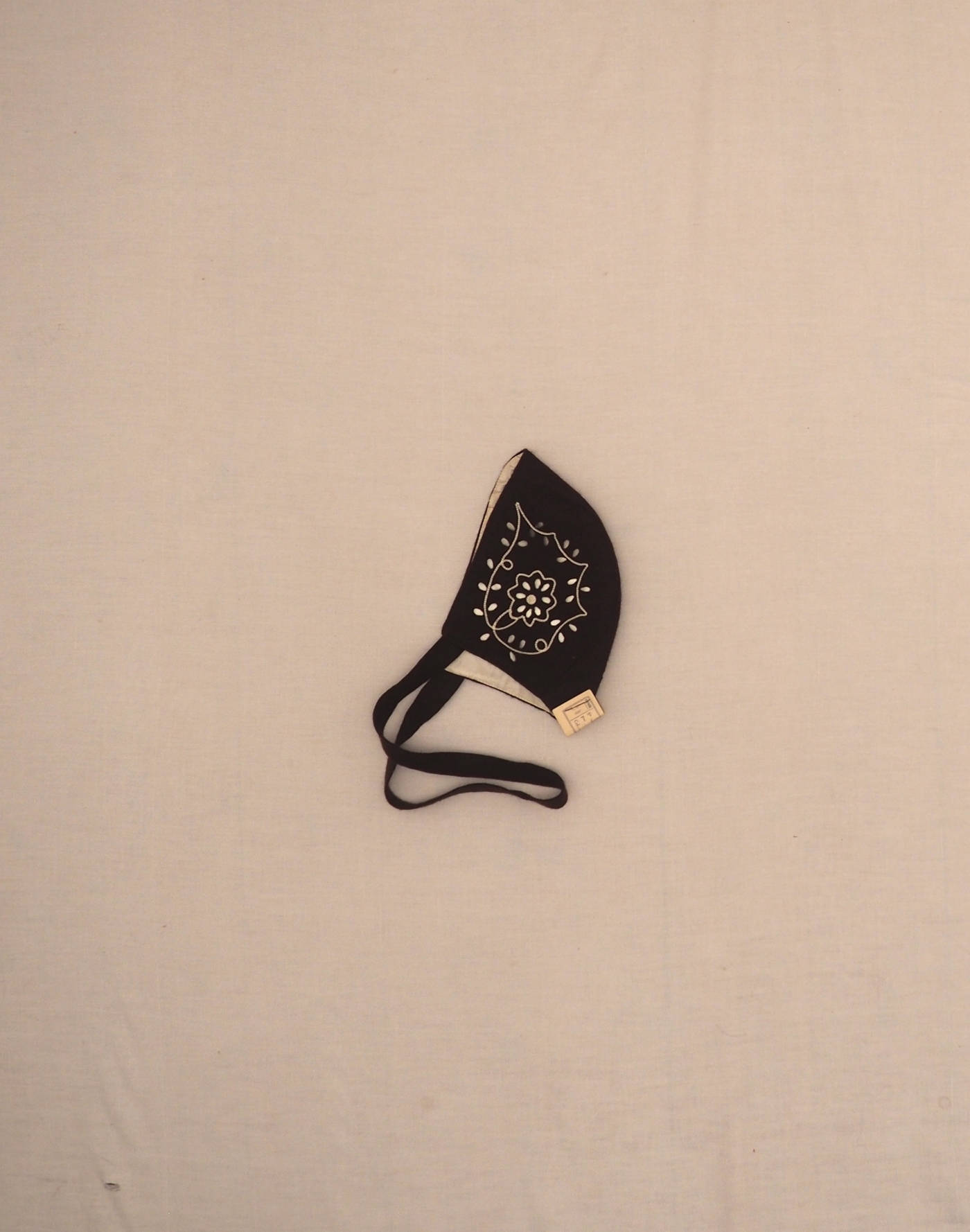 Magnificent early 20th-century brown felt openwork and embroidered beguin with ecru satin lining and front strap. Perfect condition, wool & satin feel.