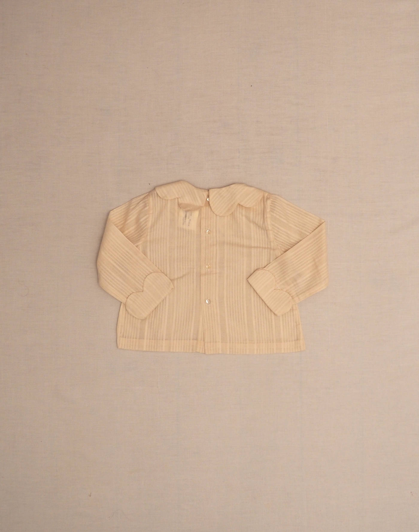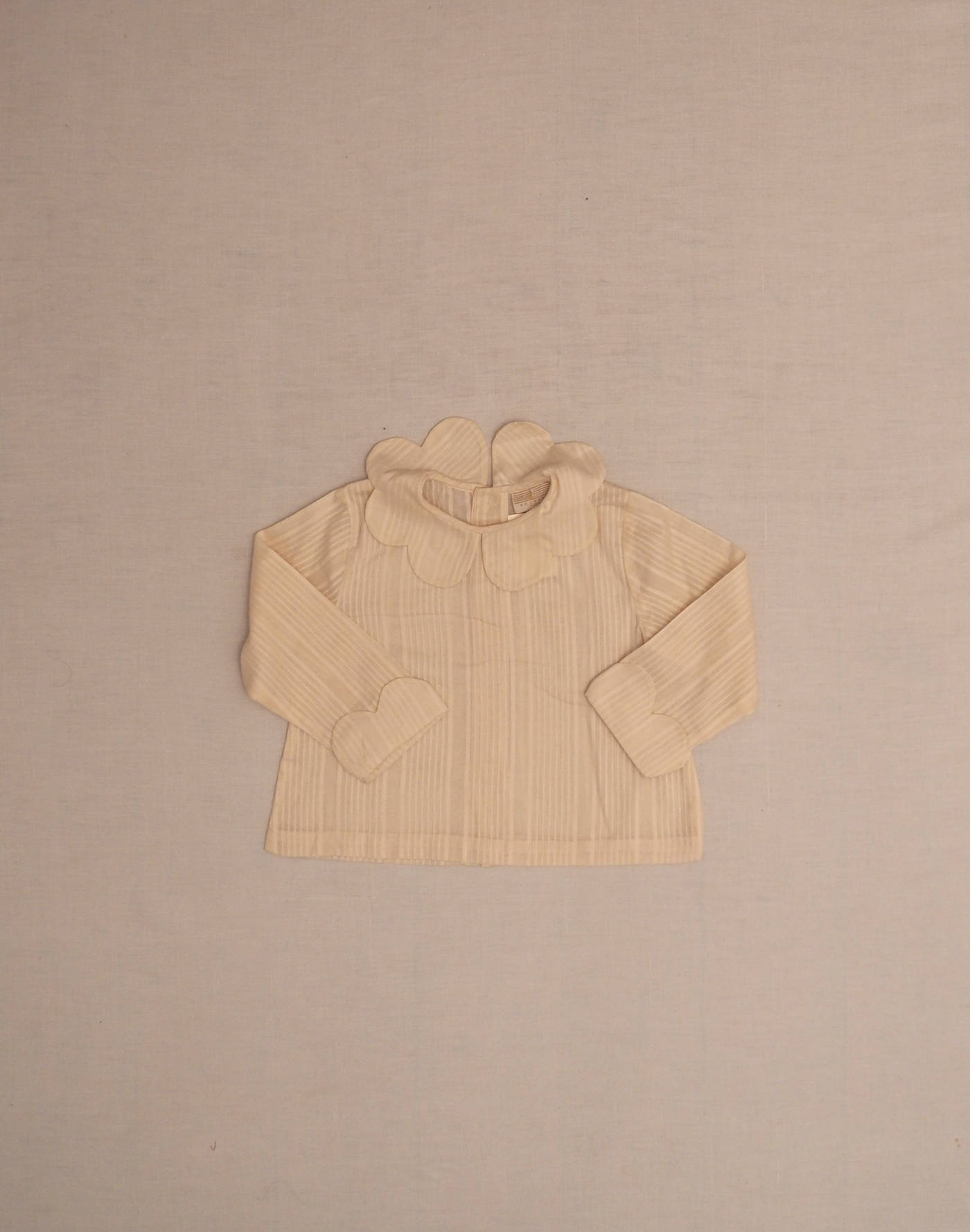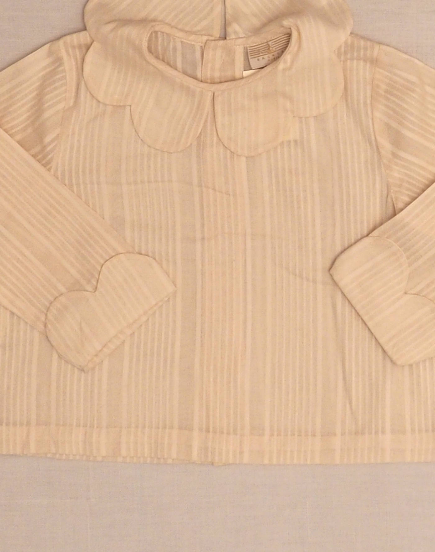 Baghère by Sylvie Loussier, from an exceptional new stock of the children’s couture brand. Charming long-sleeved blouse in striped ecru gauze, with a gorgeous petal collar, petal-finish lapel on sleeves, closed in the back with three real mother-of-pearl buttons. Made in France, mint condition, 100% cotton.