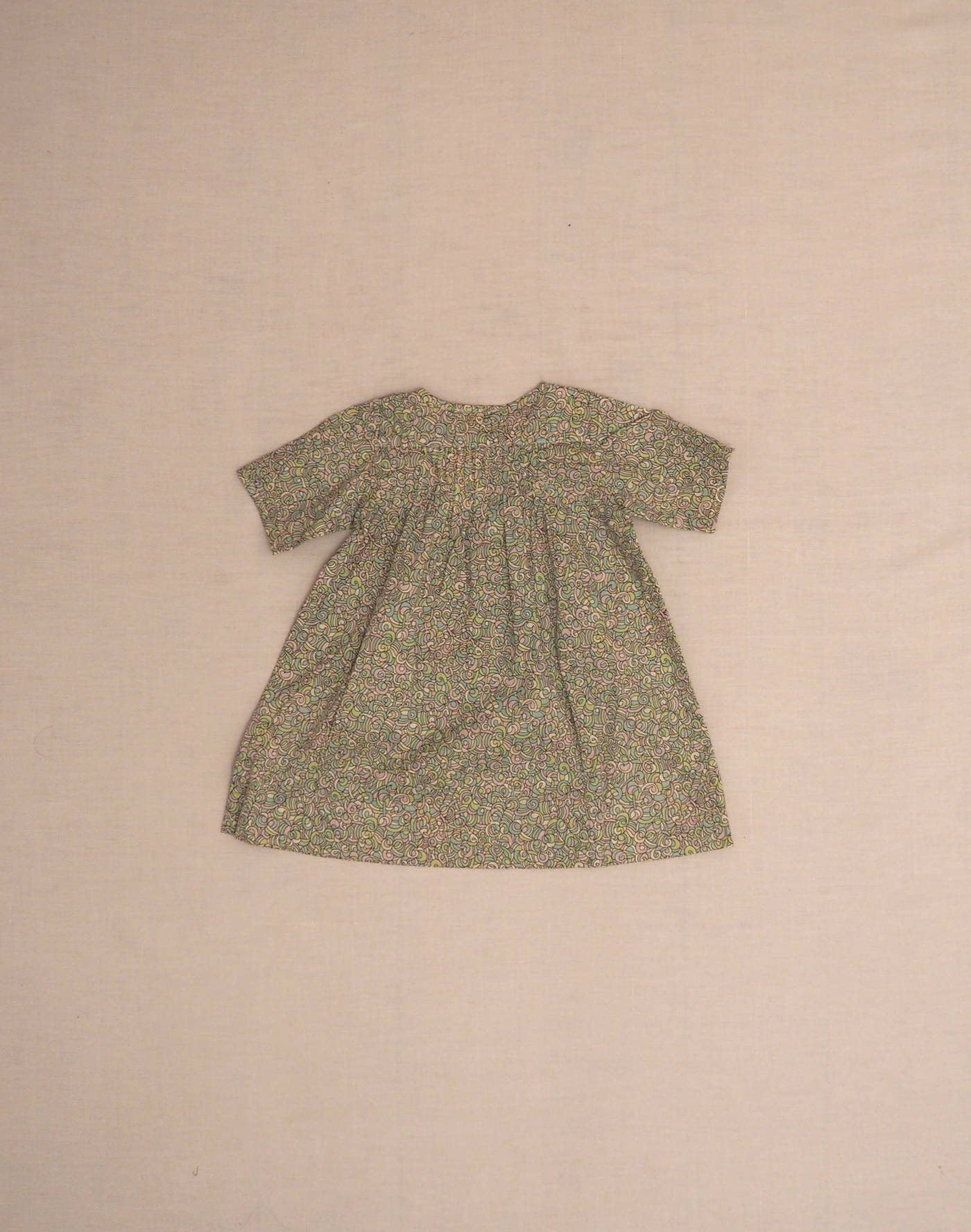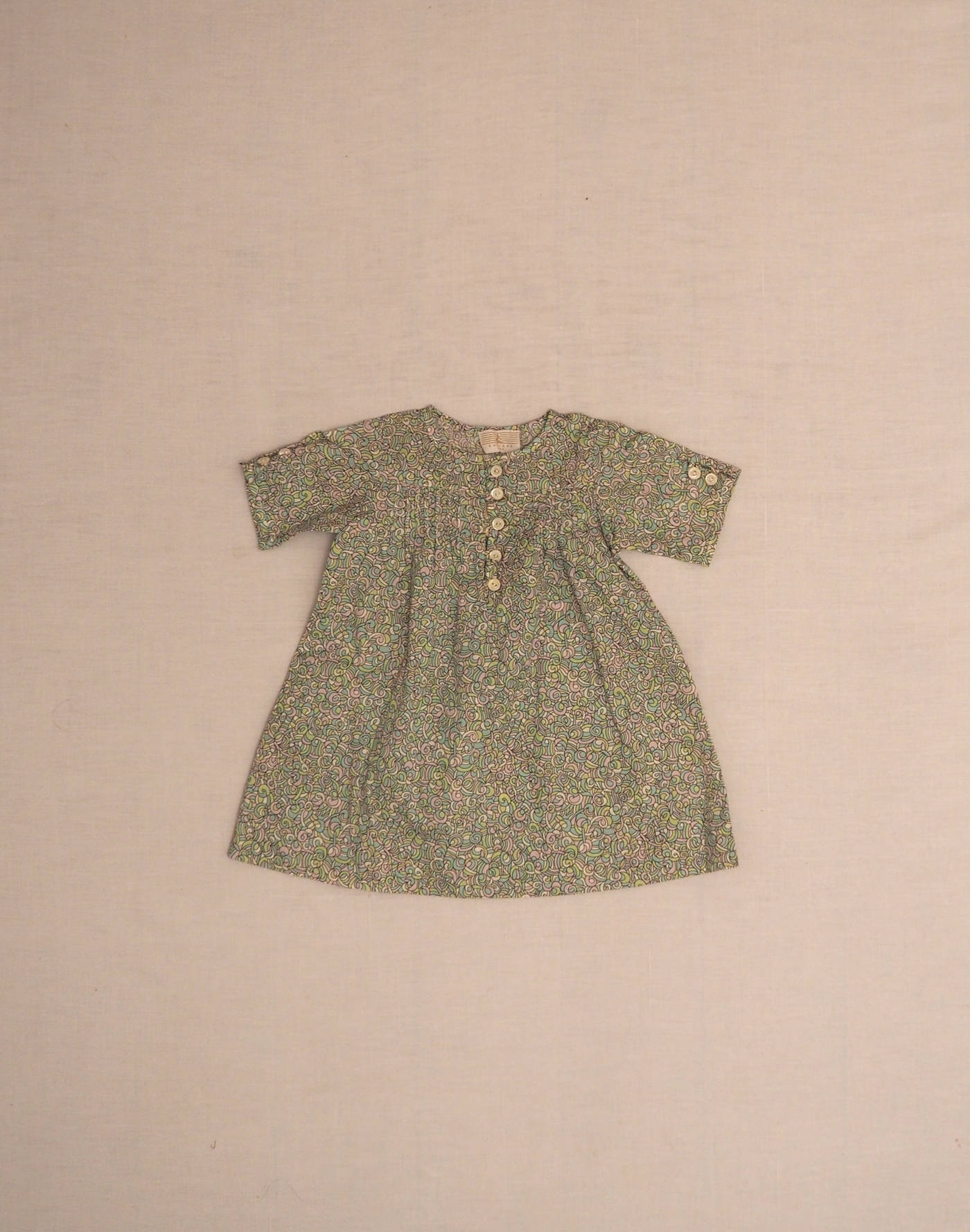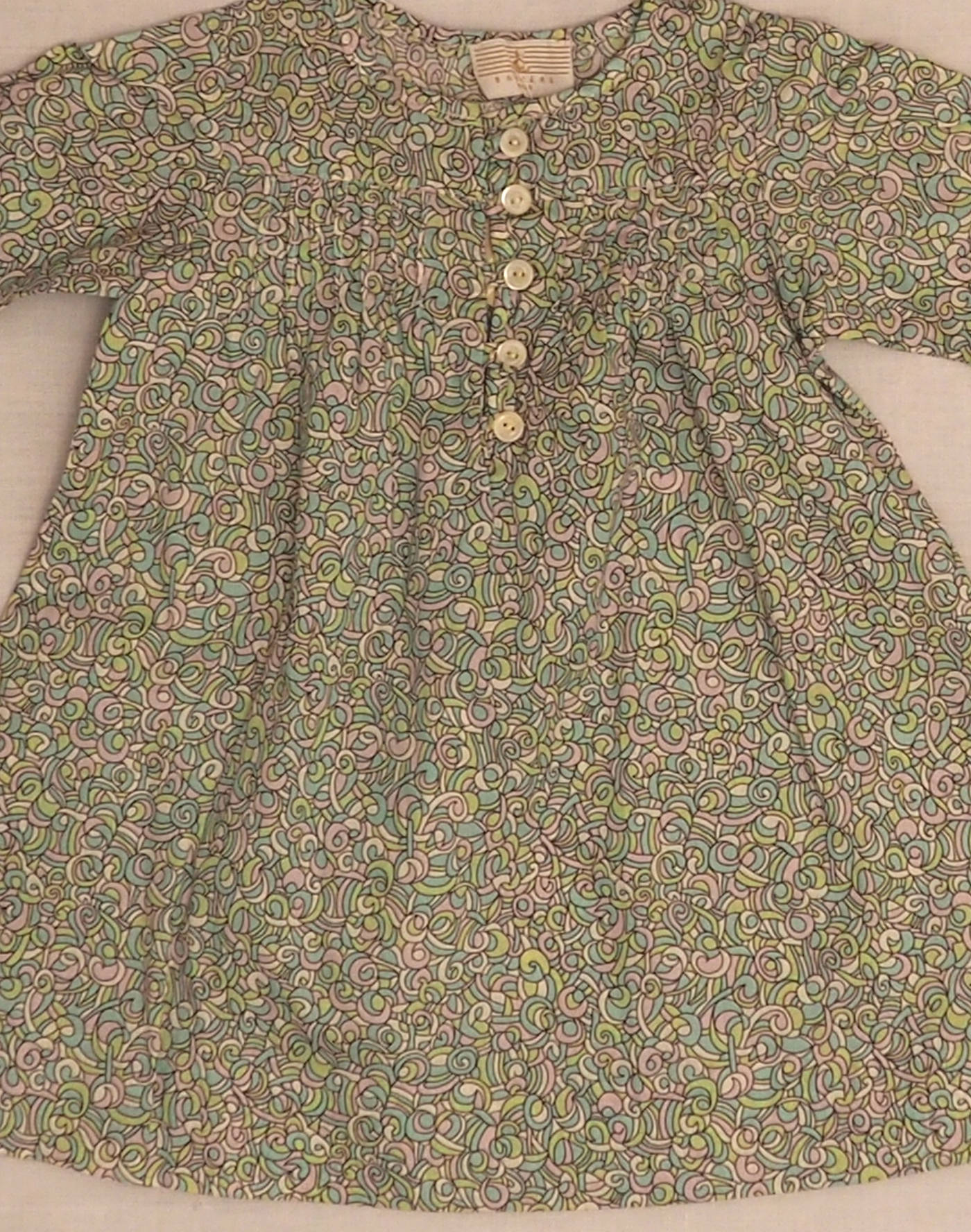 Baghère by Sylvie Loussier, from an exceptional new stock of the children’s couture brand. Adorable short-sleeved button-down dress in geometric Liberty cotton, pleated on the bust, closed in front by five flower-engraved buttons. Made in France, mint condition, 100% cotton.