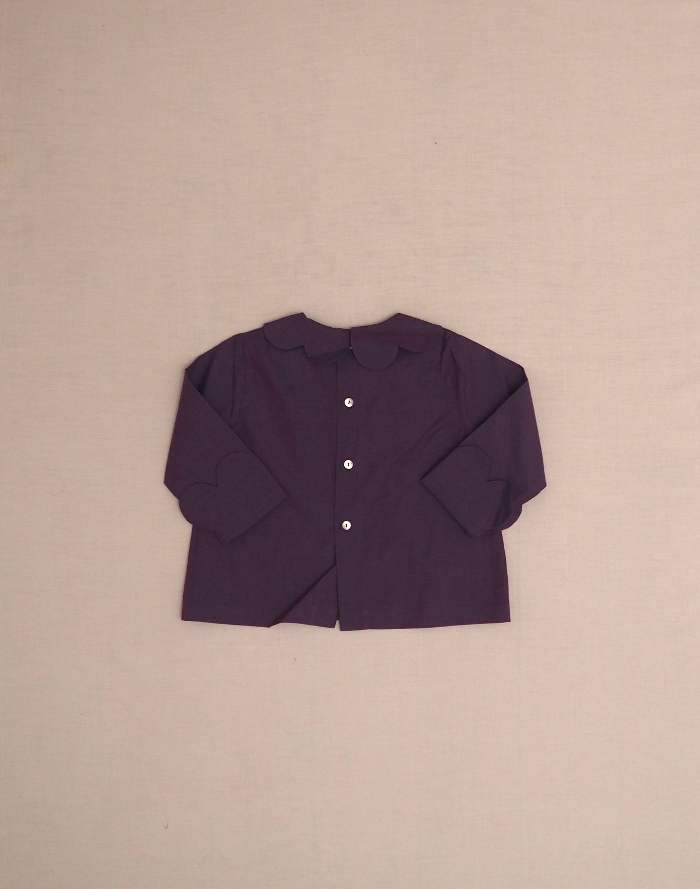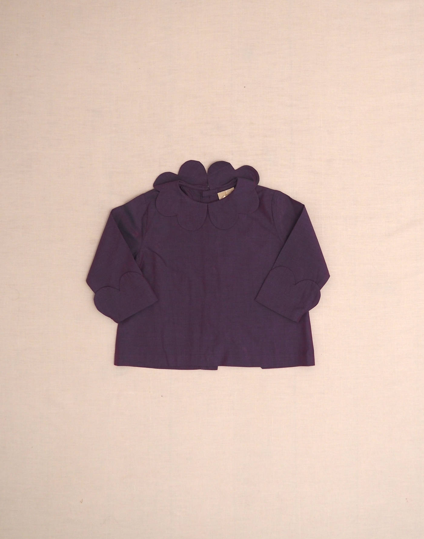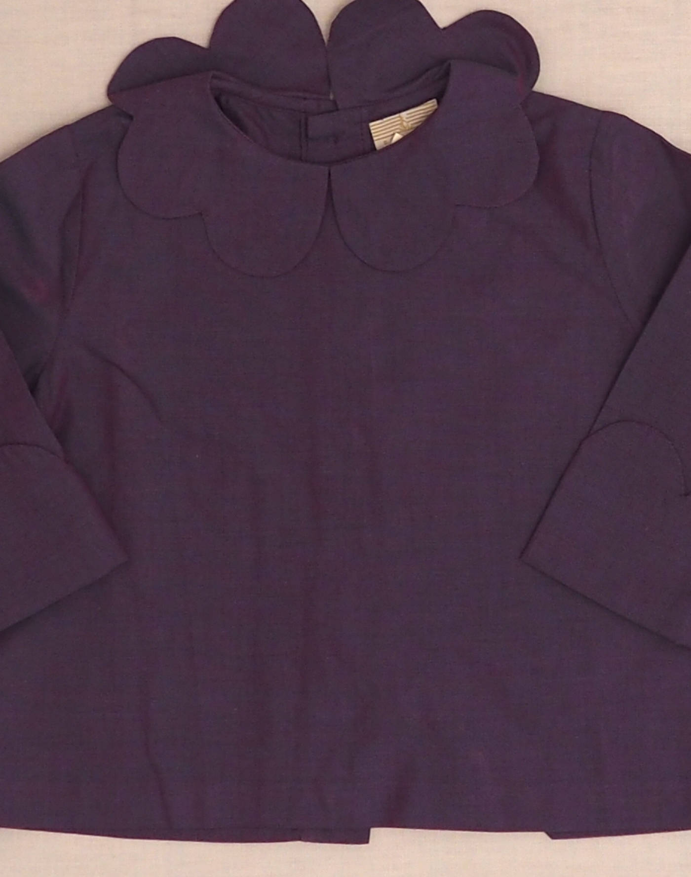Baghère by Sylvie Loussier, from an exceptional new stock of the children’s couture brand. Charming long-sleeved blouse in slightly iridescent purple cotton, with gorgeous petal collar, petal-finish lapel on sleeves, closed in the back with three real mother-of-pearl buttons. Made in France, mint condition, 100% cotton.