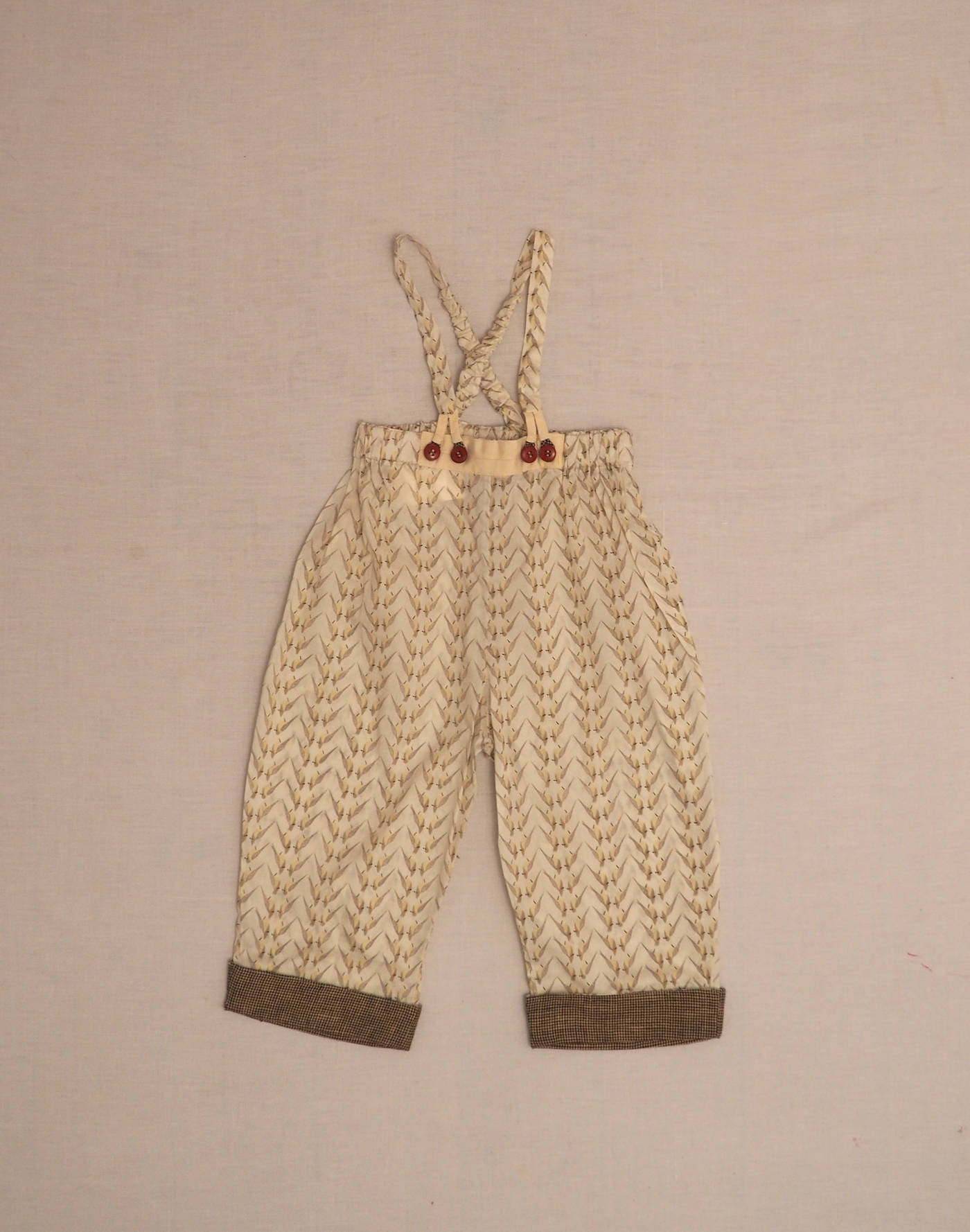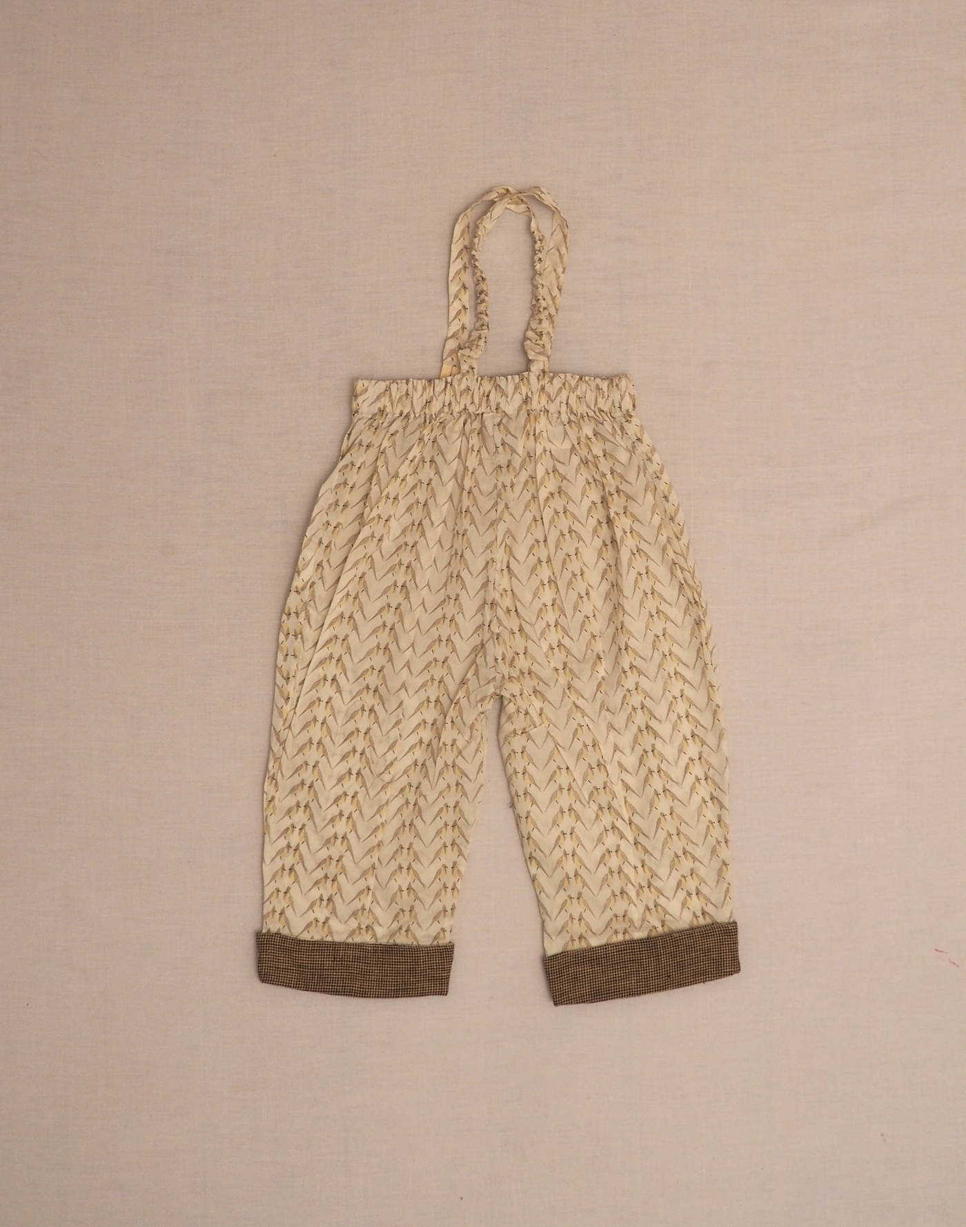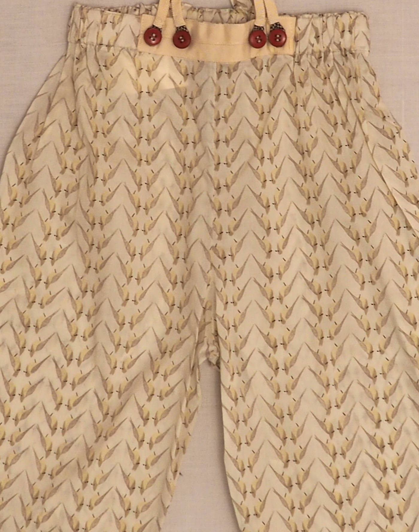 Baghère by Sylvie Loussier, from an exceptional new stock of the children’s couture brand. Wonderful brace pants in Liberty bird motif, elastic waistband with ribbon appliqué, integrated grandfather straps fastened in front with four brown buttons. Houndstooth ankle cuffs (unstitched, so can be worn longer by turning hem inside out). Made in France, mint condition, 100% cotton.