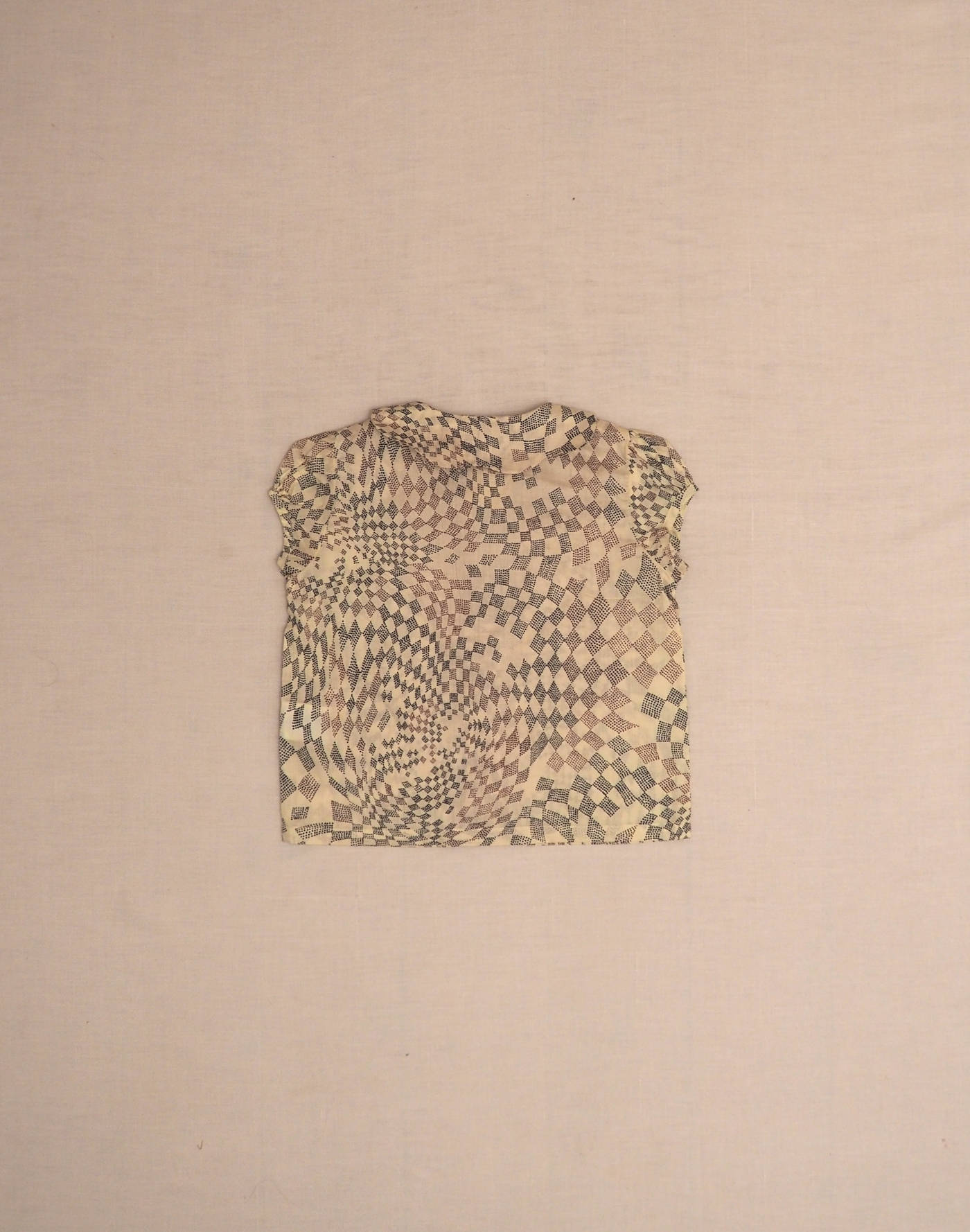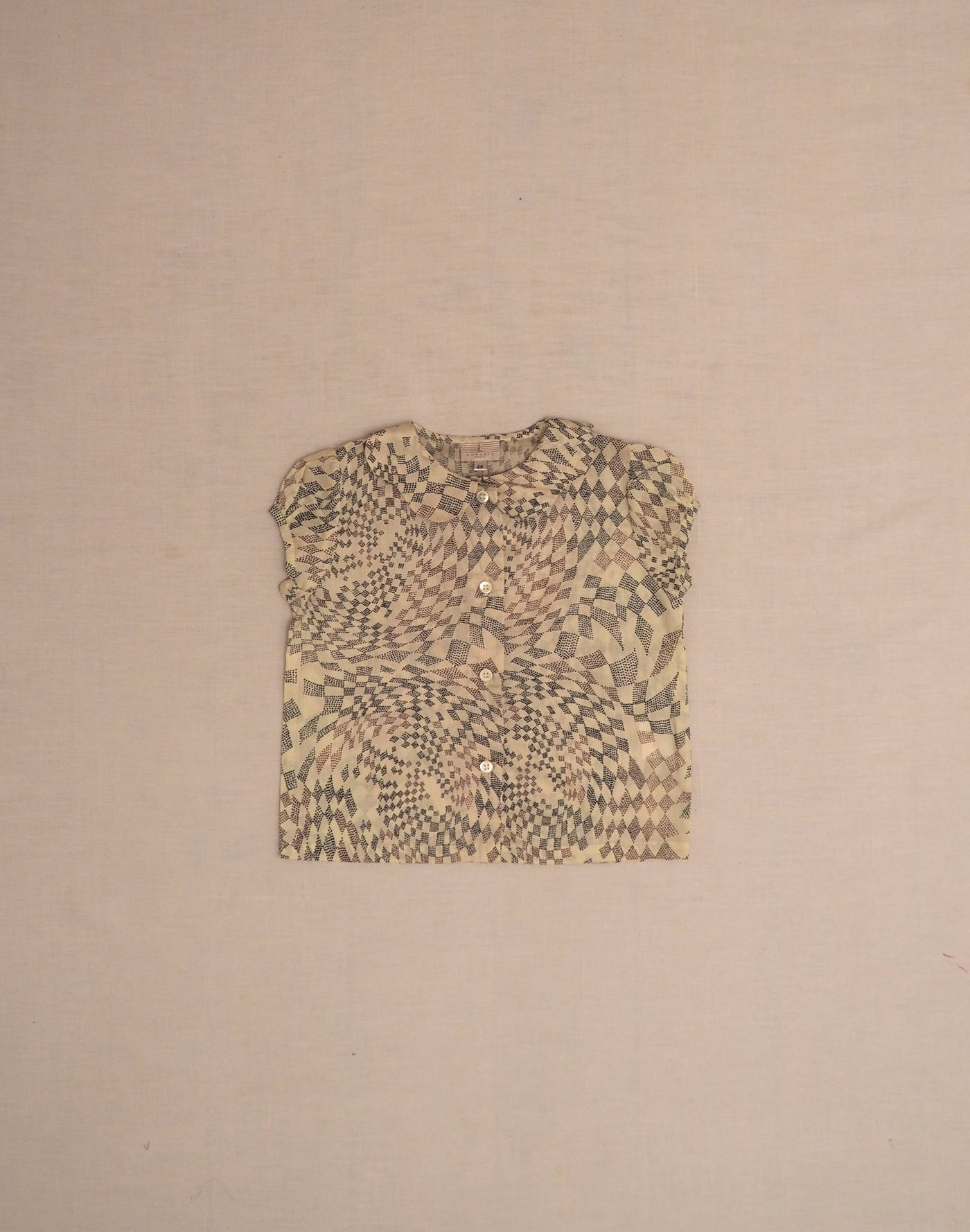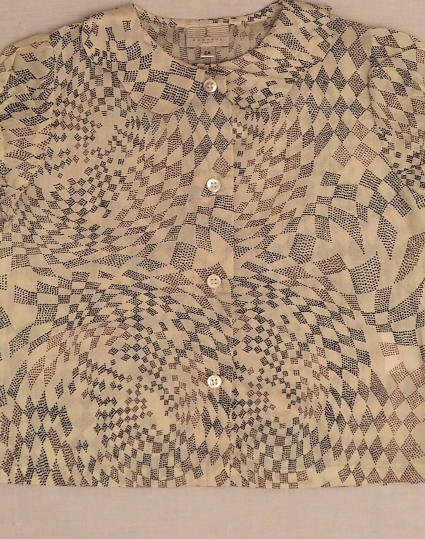 Baghère by Sylvie Loussier, from an exceptional new stock of the children’s couture brand. Charming short-sleeved balloon blouse in Liberty diamond pattern, with beautiful petal collar, fastened with four pearly buttons. Made in France, mint condition, 100% cotton.