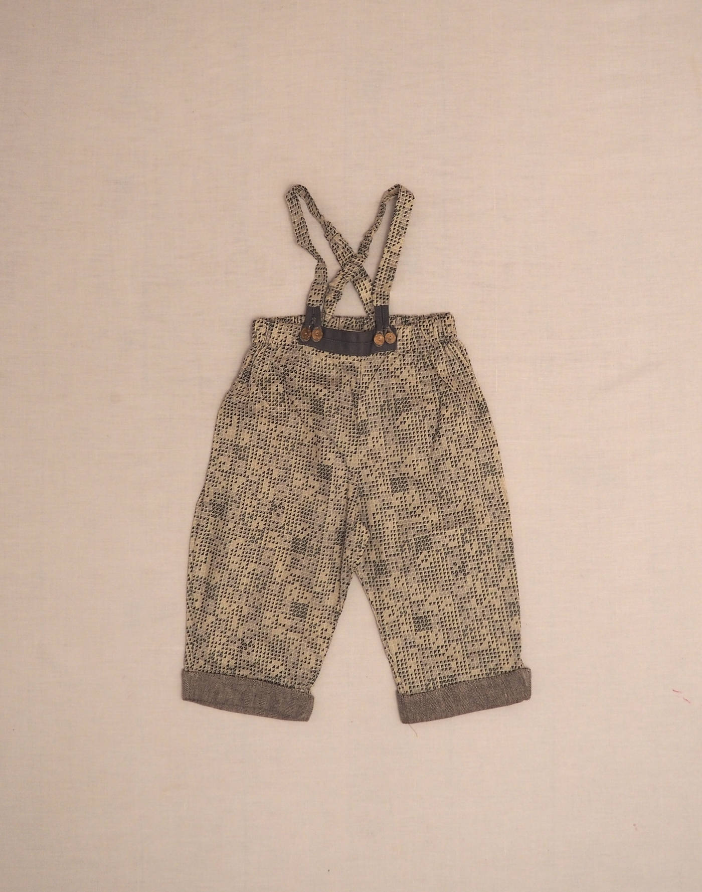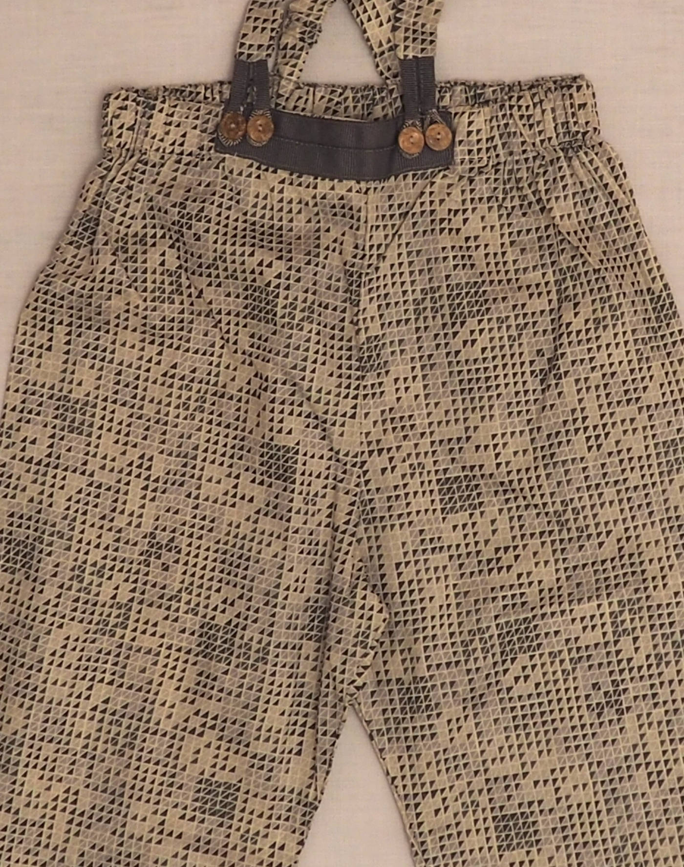 Baghère by Sylvie Loussier, from an exceptional new stock of the children’s couture brand. Wonderful pants with straps in Liberty triangle motif, elastic waistband with taupe ribbon appliqué, integrated grandfather straps fastened in front with four engraved buttons. Tweed ankle cuffs (unstitched, so can be worn longer by turning hem inside out). Made in France, mint condition, 100% cotton.
