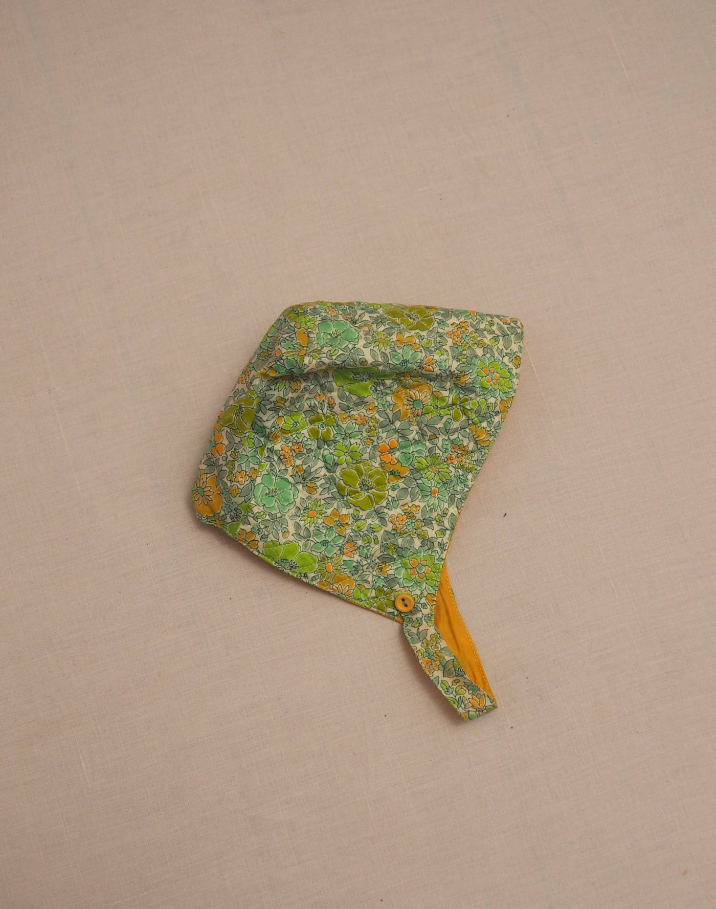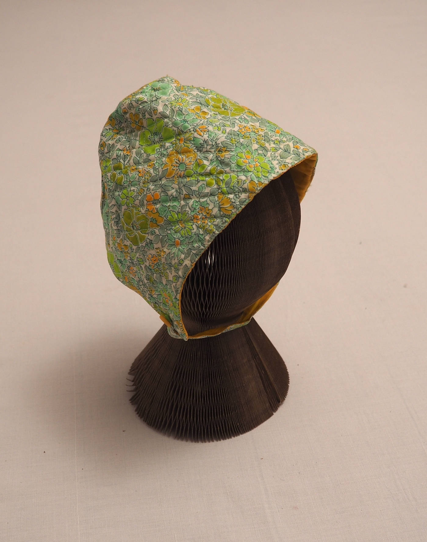 Baghère by Sylvie Loussier, from an exceptional new stock of the children’s couture brand. Delightful quilted crush lined in yellow satin, closed with a buttoned ribbon, in 1970s Liberty cotton. Made in France, mint condition, 100% cotton.