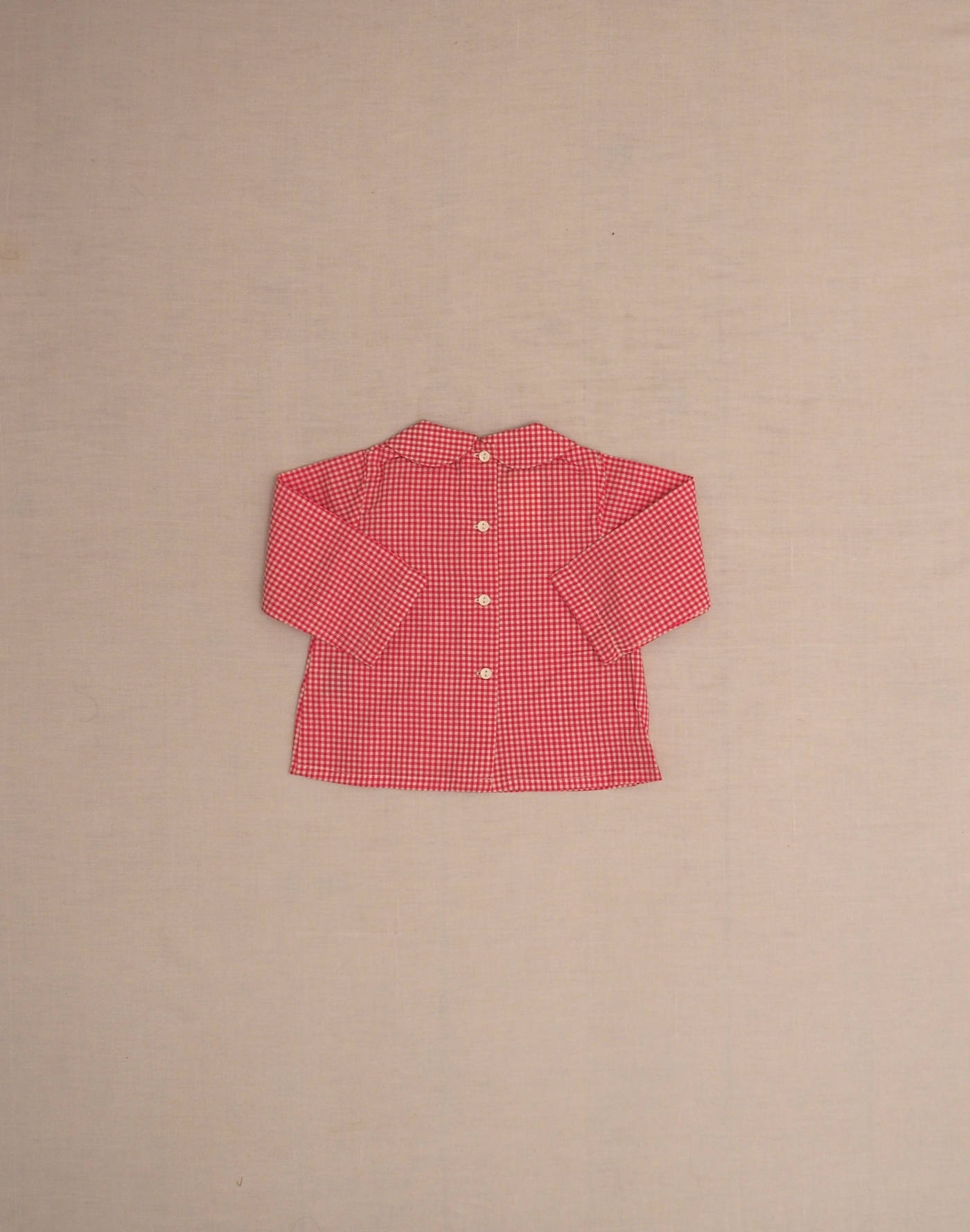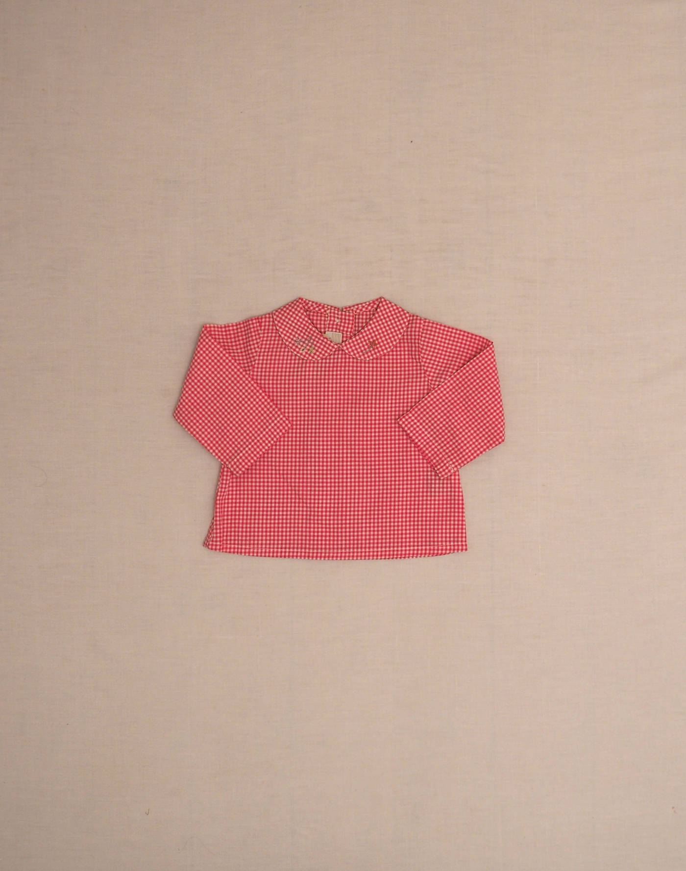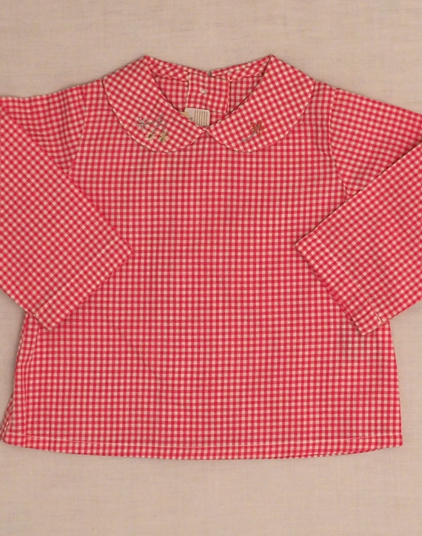 Baghère by Sylvie Loussier, from an exceptional new stock of the children’s couture brand. Charming long-sleeved blouse in pink gingham, with a beautiful flower-embroidered collar, closed in the back with four buttons. Made in France, mint condition, 100% linen.