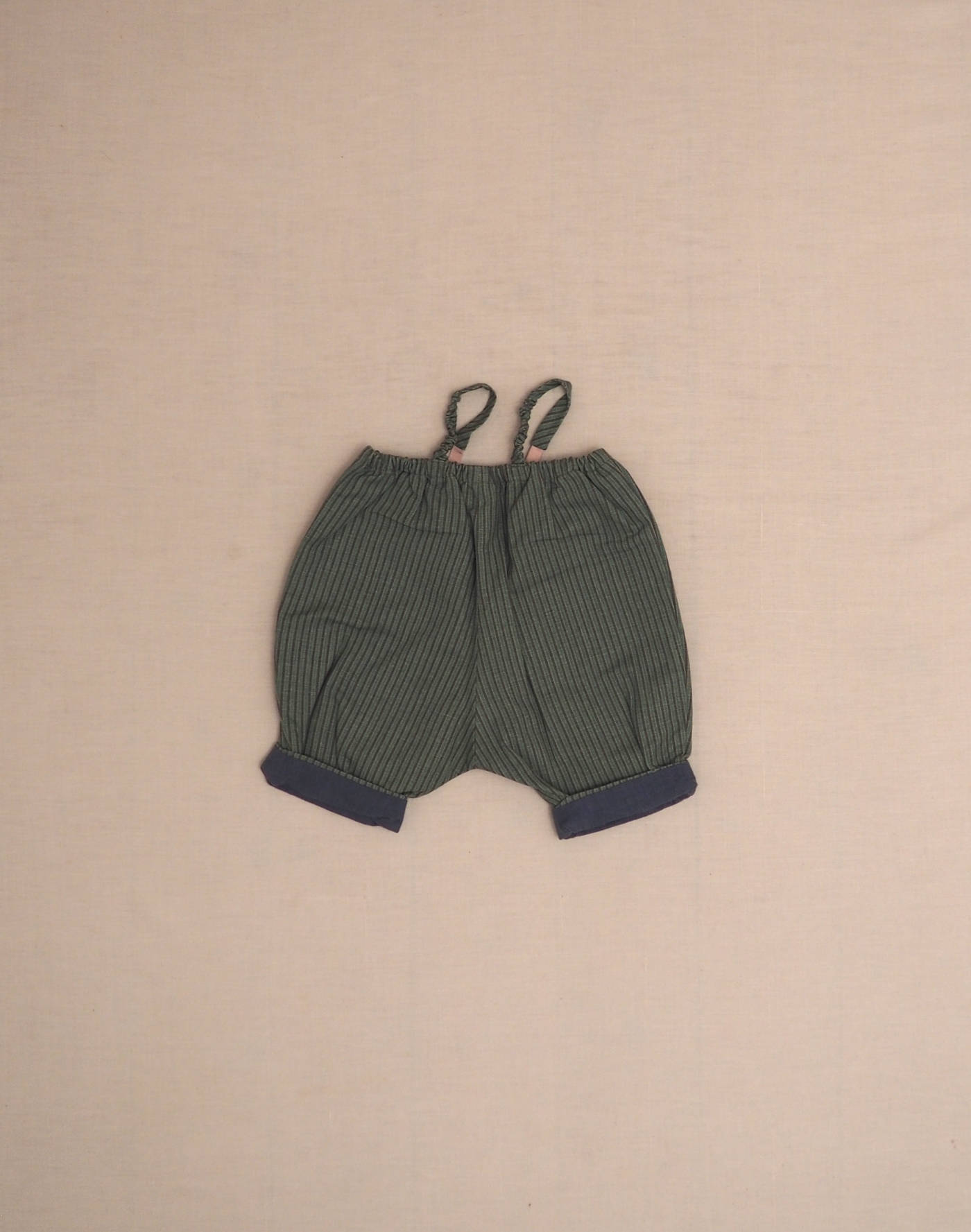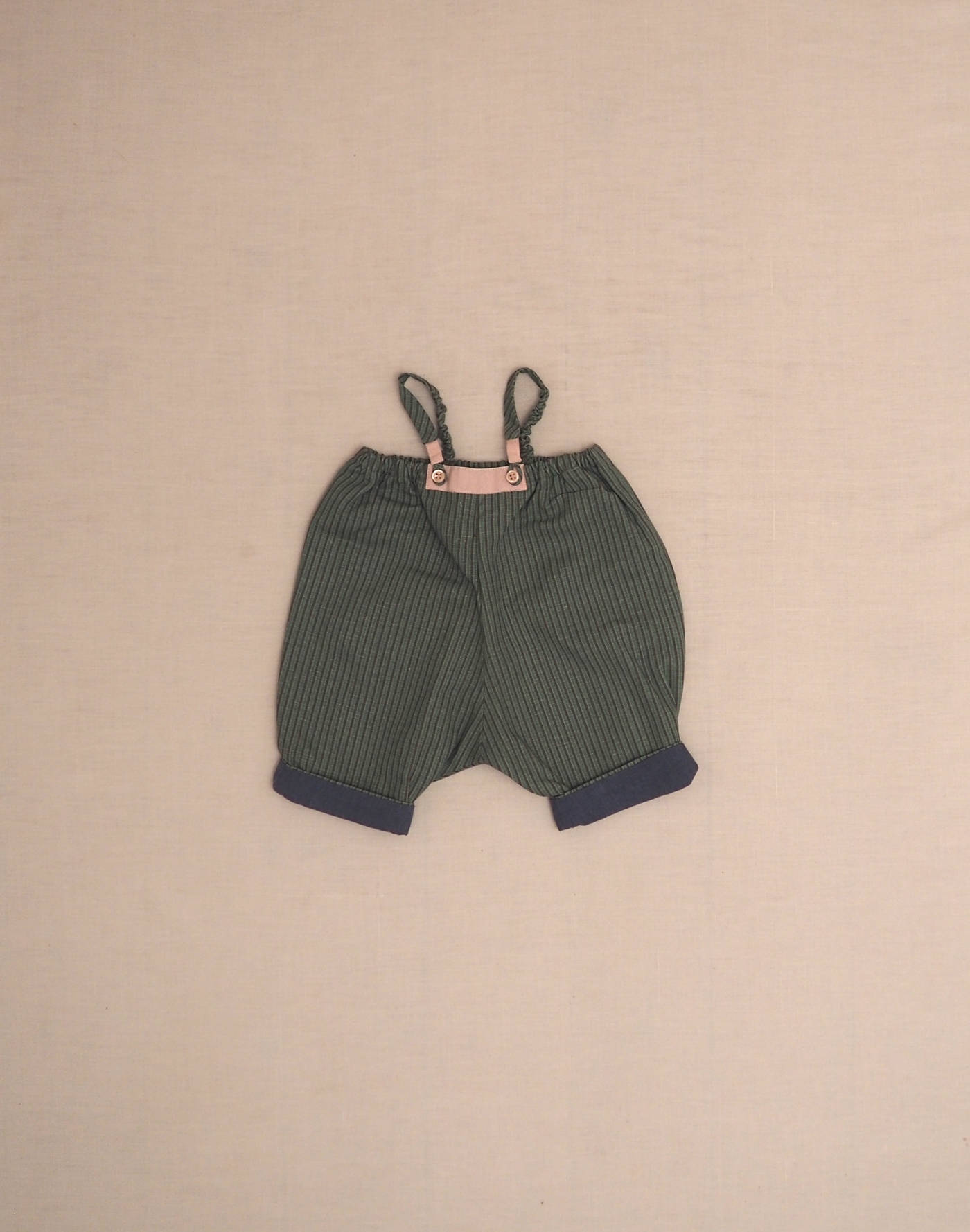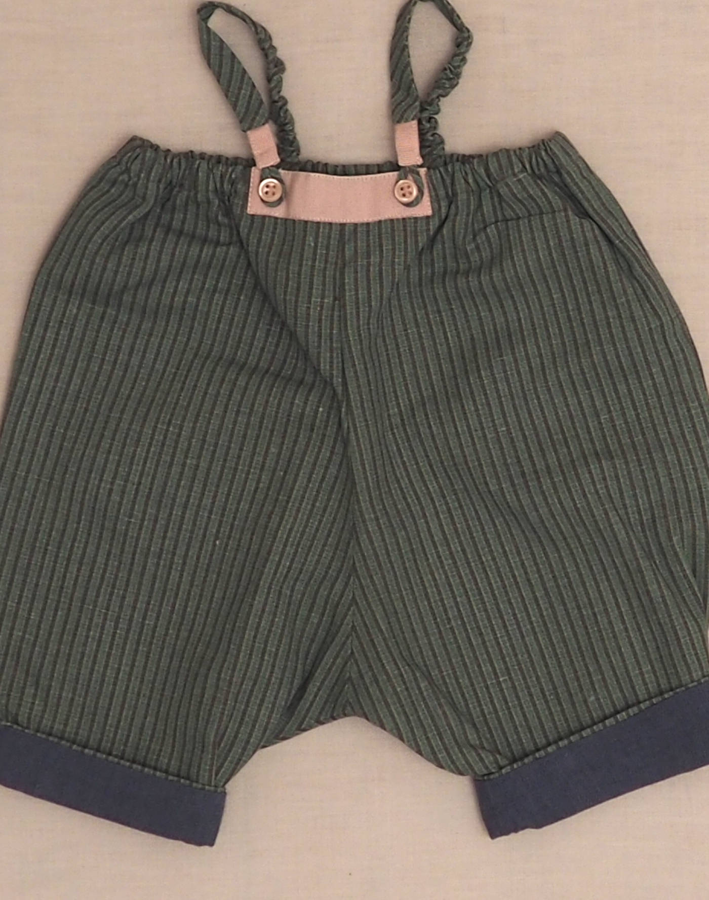 Baghère by Sylvie Loussier, from an exceptional new stock of the children’s couture brand. Wonderful fully lined pants with striped canvas straps, elastic waistband with ribbon appliqué, integrated grandfather straps fastened in front with two pink buttons. Ankle cuffs in blue chambray (unstitched, so can be worn longer by turning hem inside out). Made in France, mint condition, 100% cotton.