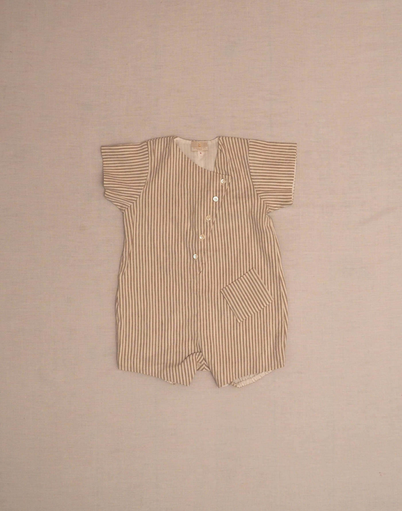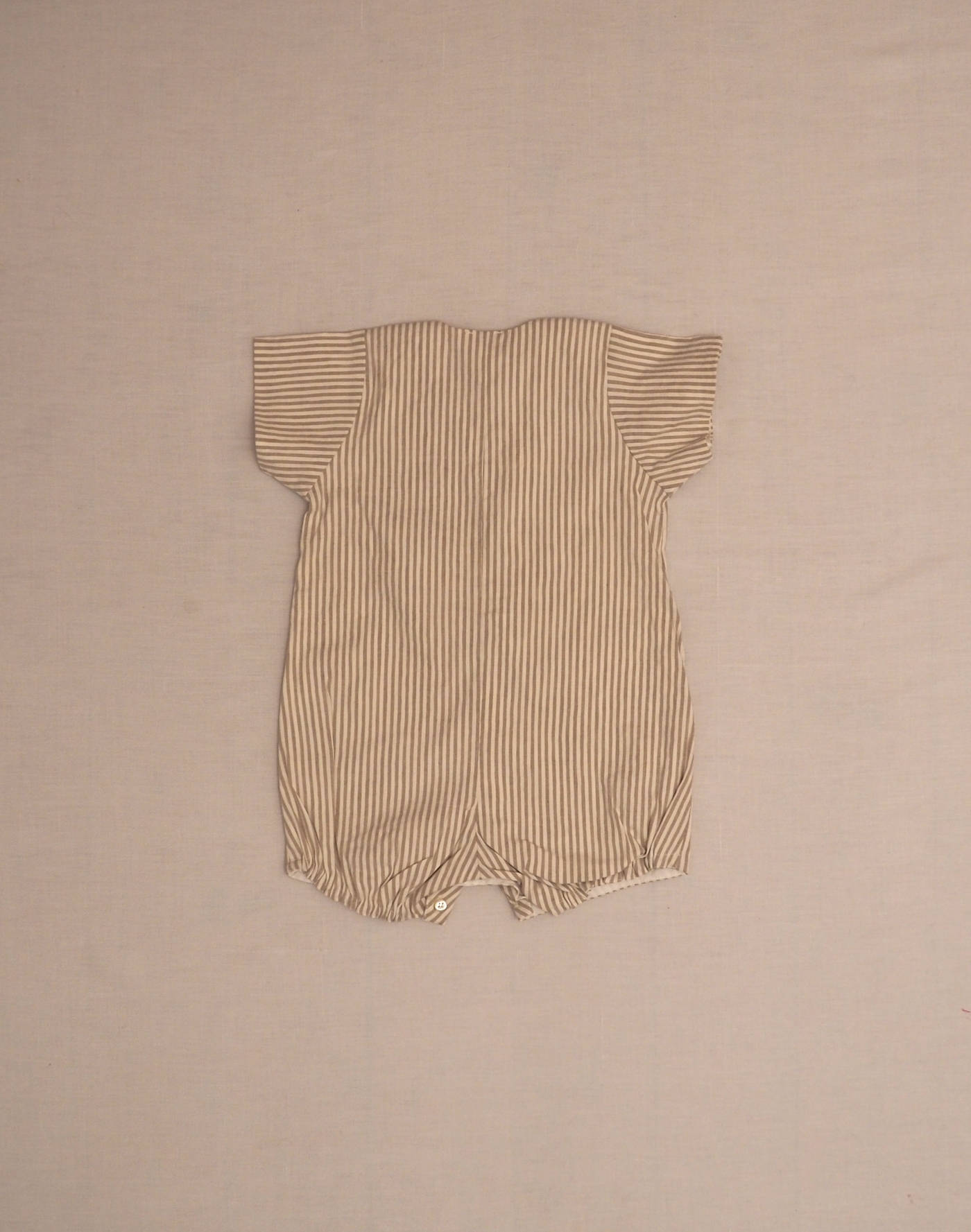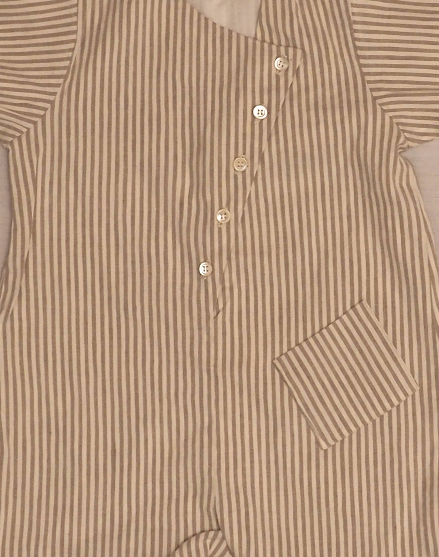 Baghère by Sylvie Loussier, from an exceptional new stock of the children’s couture brand. Beautiful short jumpsuit in finely striped pearl-gray cotton, fully lined, short sleeves, one front patch pocket, elasticated back thighs, five-button front closure, four buttons at crotch. Made in France, mint condition, 100% cotton.