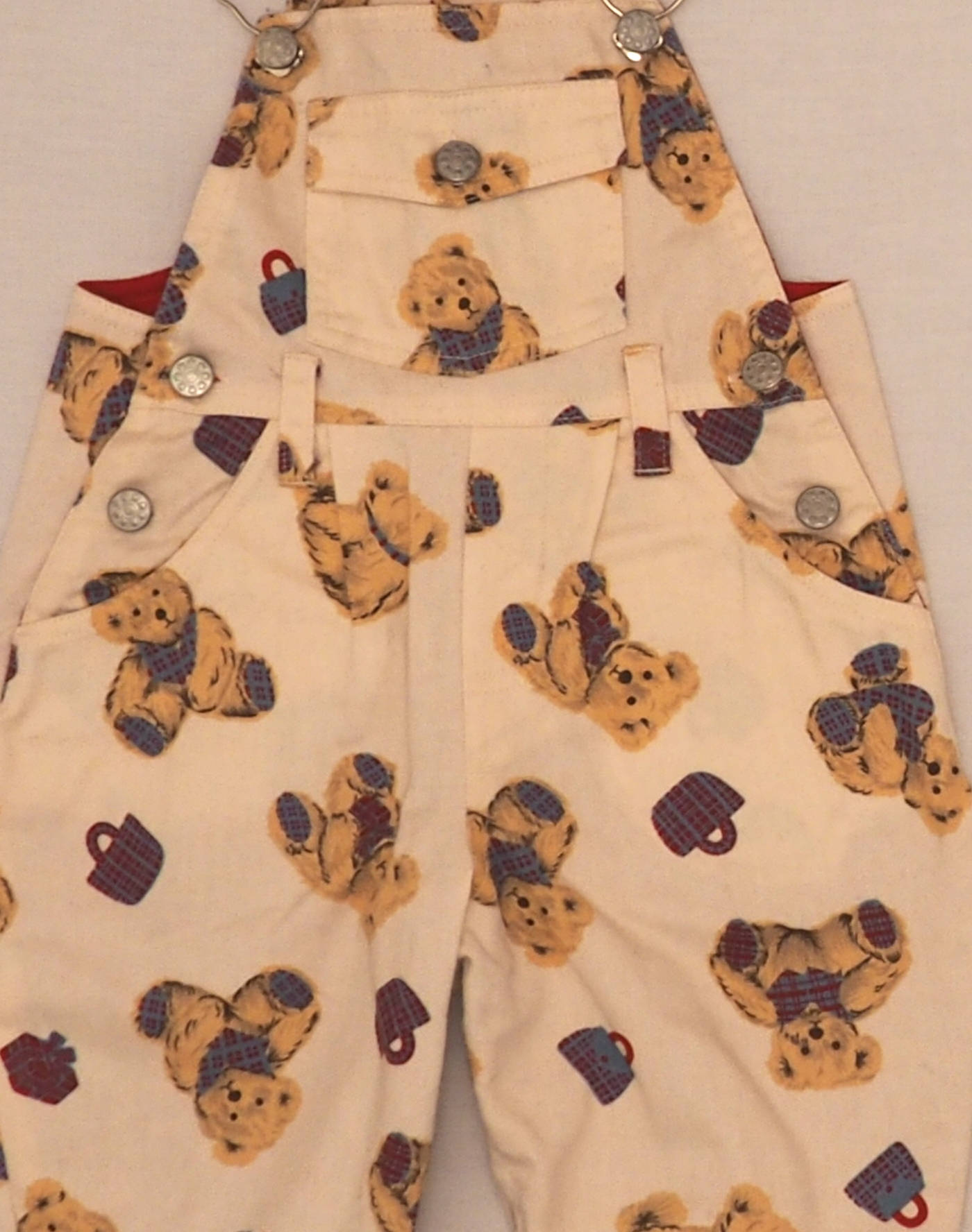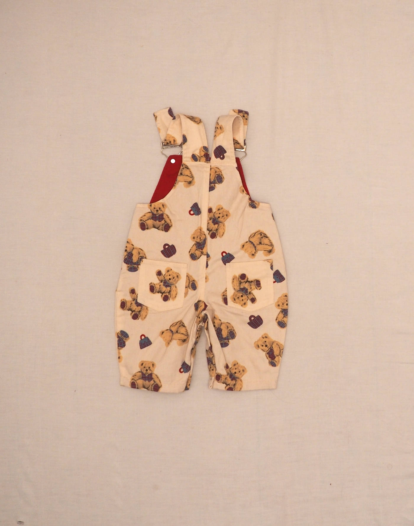 Adorable dungarees lined in beige cotton with bear print, one buttoned pocket on bust, two waist pockets, two patch pockets on back, adjustable straps fastened with two rivets on front, four rivets on waist to close. Eight press studs at crotch. Red cotton lining. Very good condition, 100% cotton.