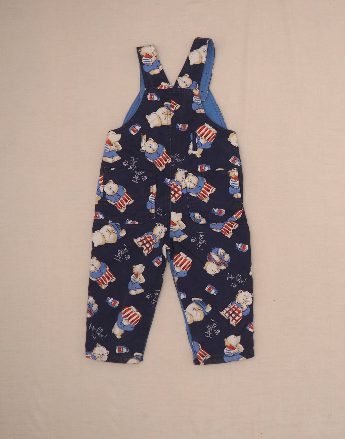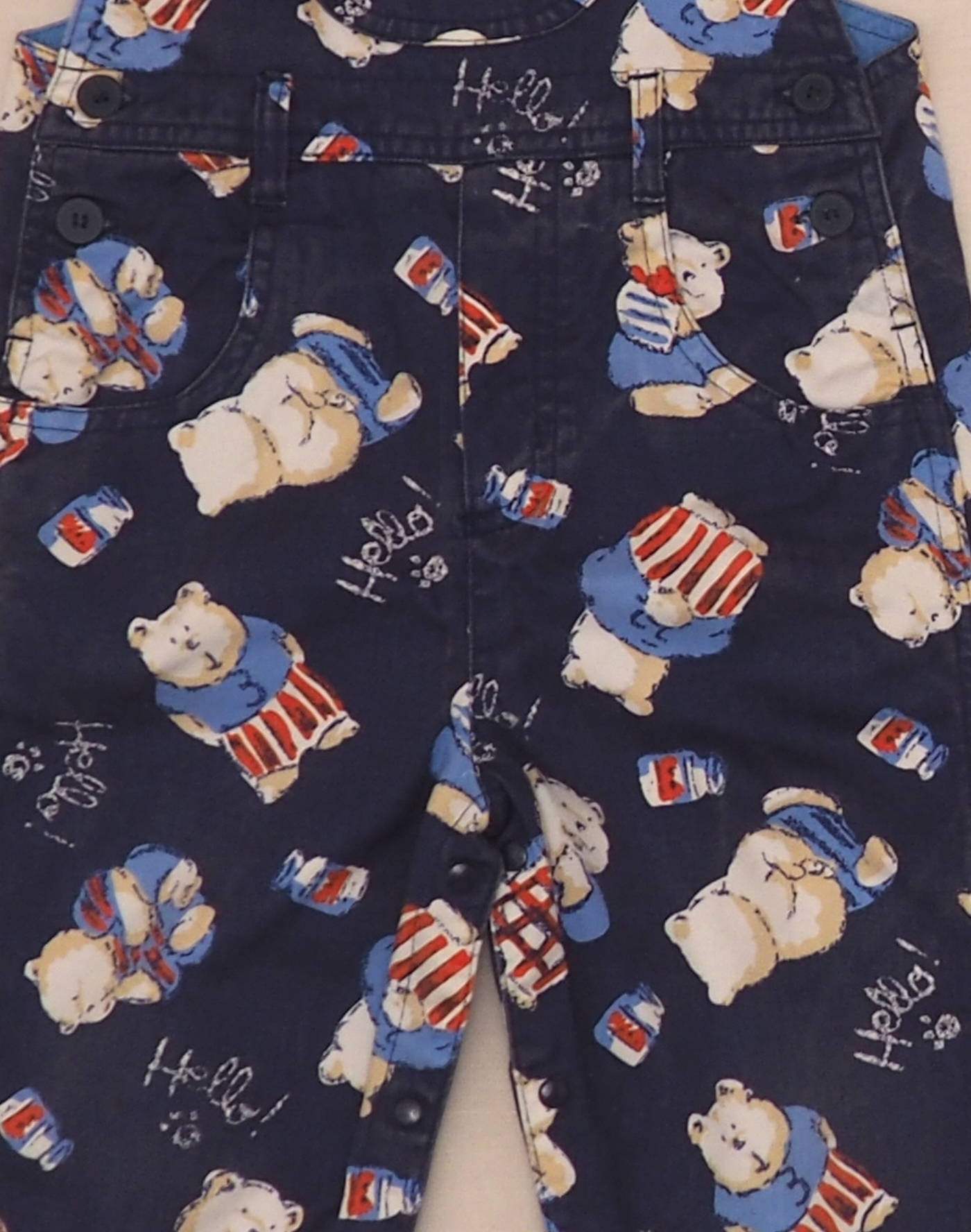 Attractive navy blue dungarees, fully lined, bear motif, one chest pocket, two front pockets, two patch pockets in back, two-level adjustable straps fastened with front buttons, four waist buttons, eight crotch snaps. Very good condition, 100% cotton.