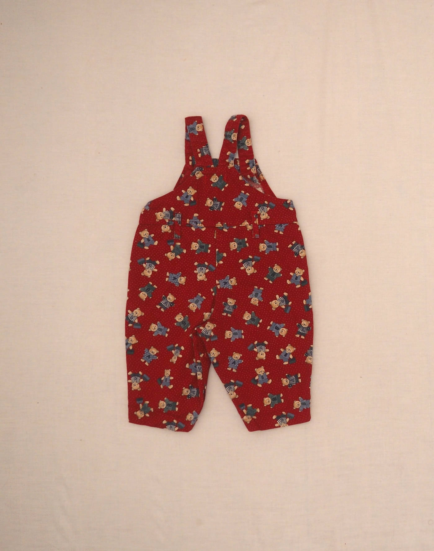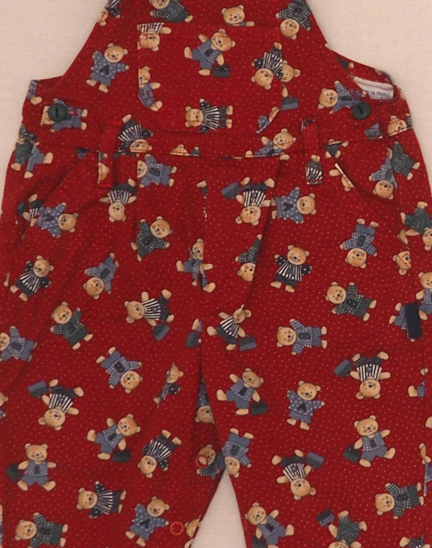 Adorable red overalls with white polka dots and bear print, one chest pocket, two front pockets, straps fastened at front with two buttons, two buttons at waist. Made in France, very good condition, 100% cotton.