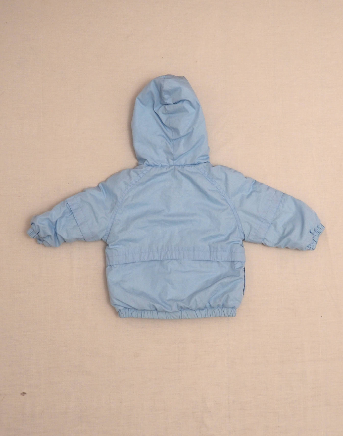 Small light-blue hooded jacket, lined and fleeced, elasticated cuffs, drawstring hood, zipper with buttoned flap. Very good condition, outer fabric 65% polyester, 35% cotton, lining 100% cotton, polyester fleece.